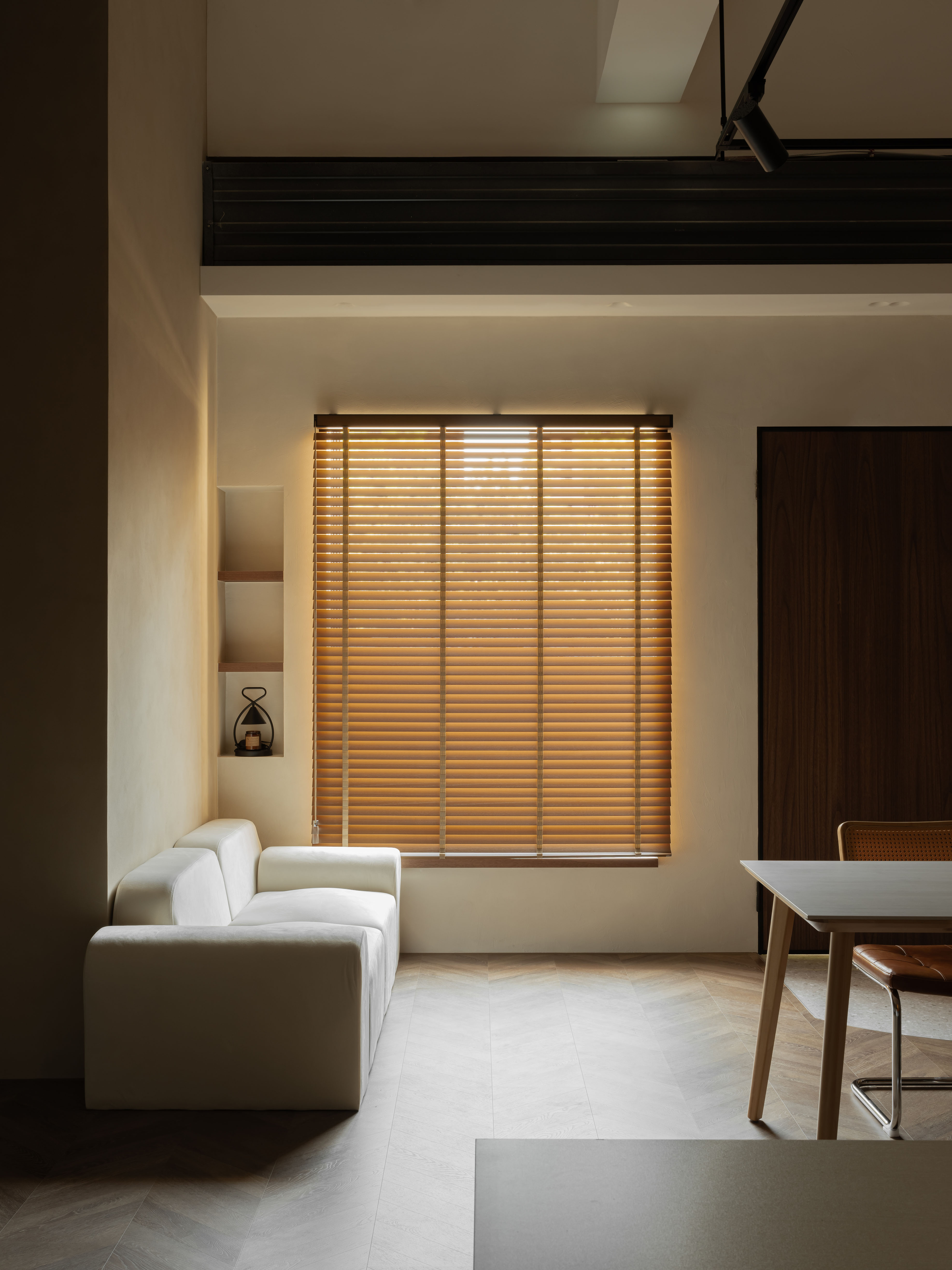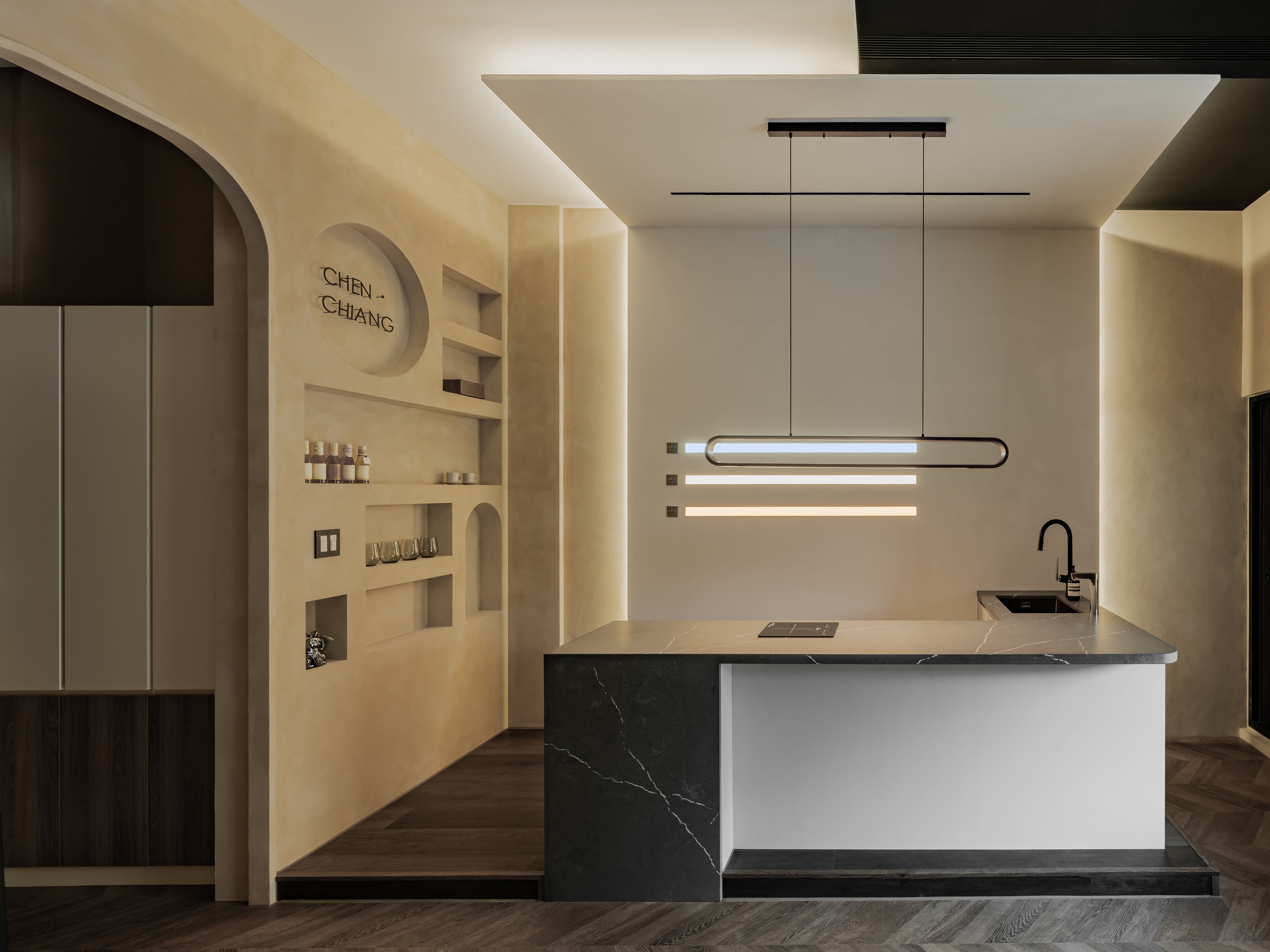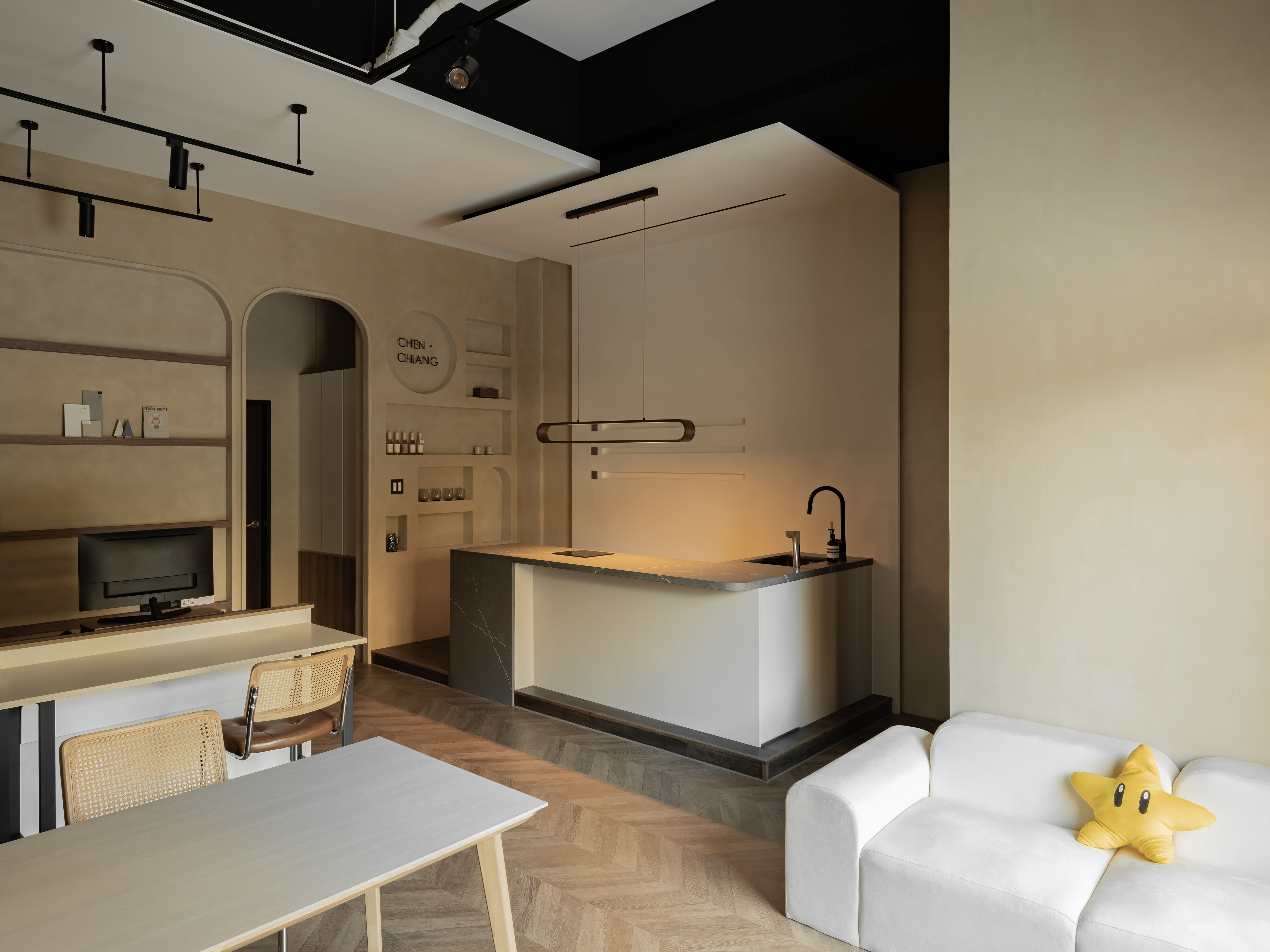 Beyond visual aesthetics and spatial experience, the brand values long-term environmental responsibility and healthy living. Water-based stone paint is used on the exterior façade and bar counter wall, replacing chemicals found in traditional latex paint. It is waterproof, durable, non-toxic, and odorless, making it safe for children and pets. Inside, natural Italian mineral coating (Marmorino) covers the walls. Free of formaldehyde and TVOCs, it provides fire resistance, moisture control, strong stain-proof, and color stability. Made from fine limestone and applied by hand with a trowel, it creates organic layers that add warmth and natural texture. These choices give the studio a daily sense of sustainability, craftsmanship, and refined comfort.