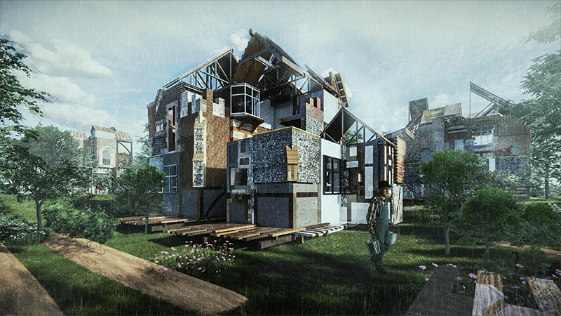 The house is recycled, reassembled, refurnished and relocated, as the erosion coming closer. The agents use an online alarming platform to chose their new habitat, new units layout and new adding materials. In the meantime, rewilding the abandoned land while migrating to the new place without leaving any negative things behind.