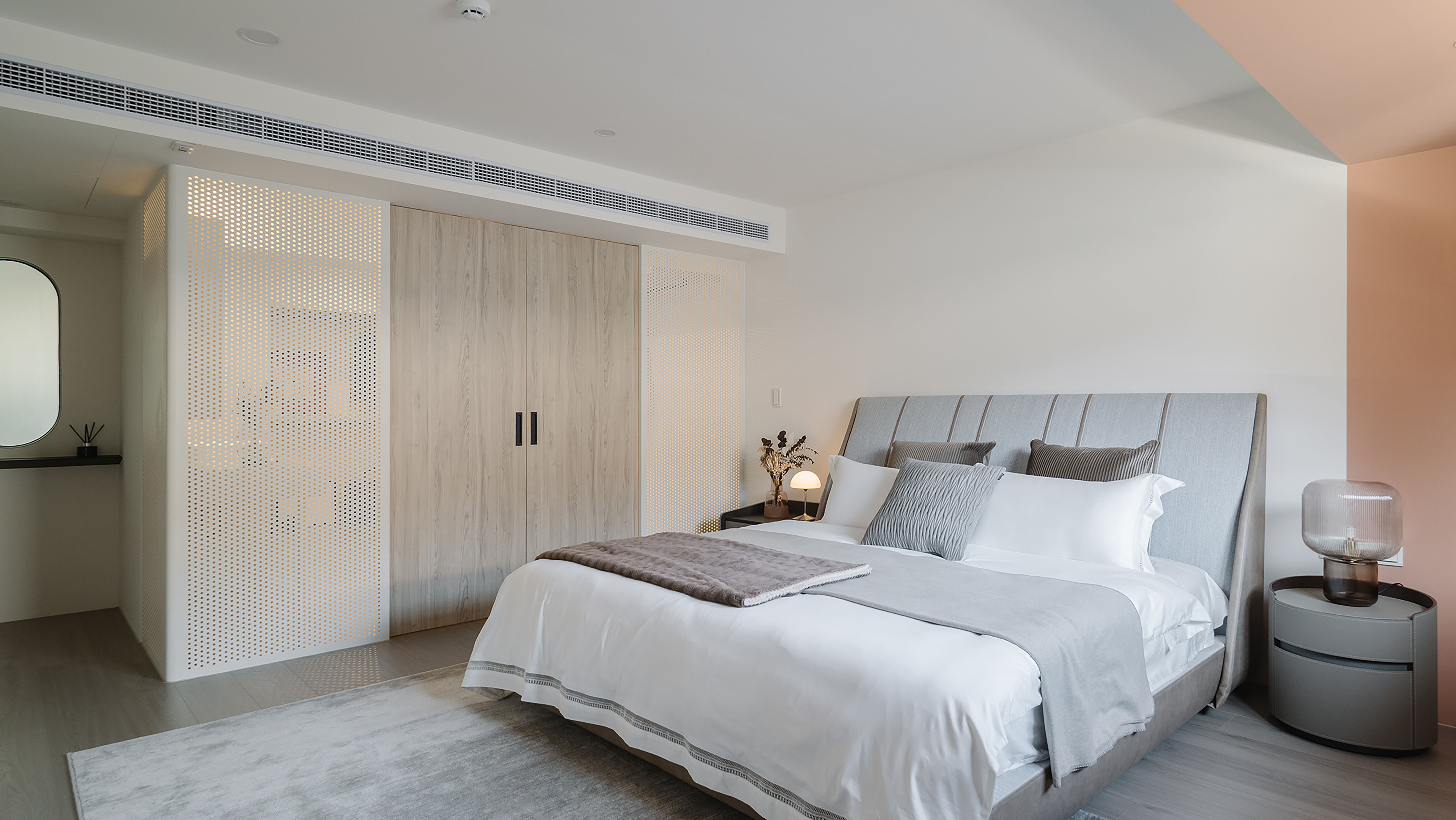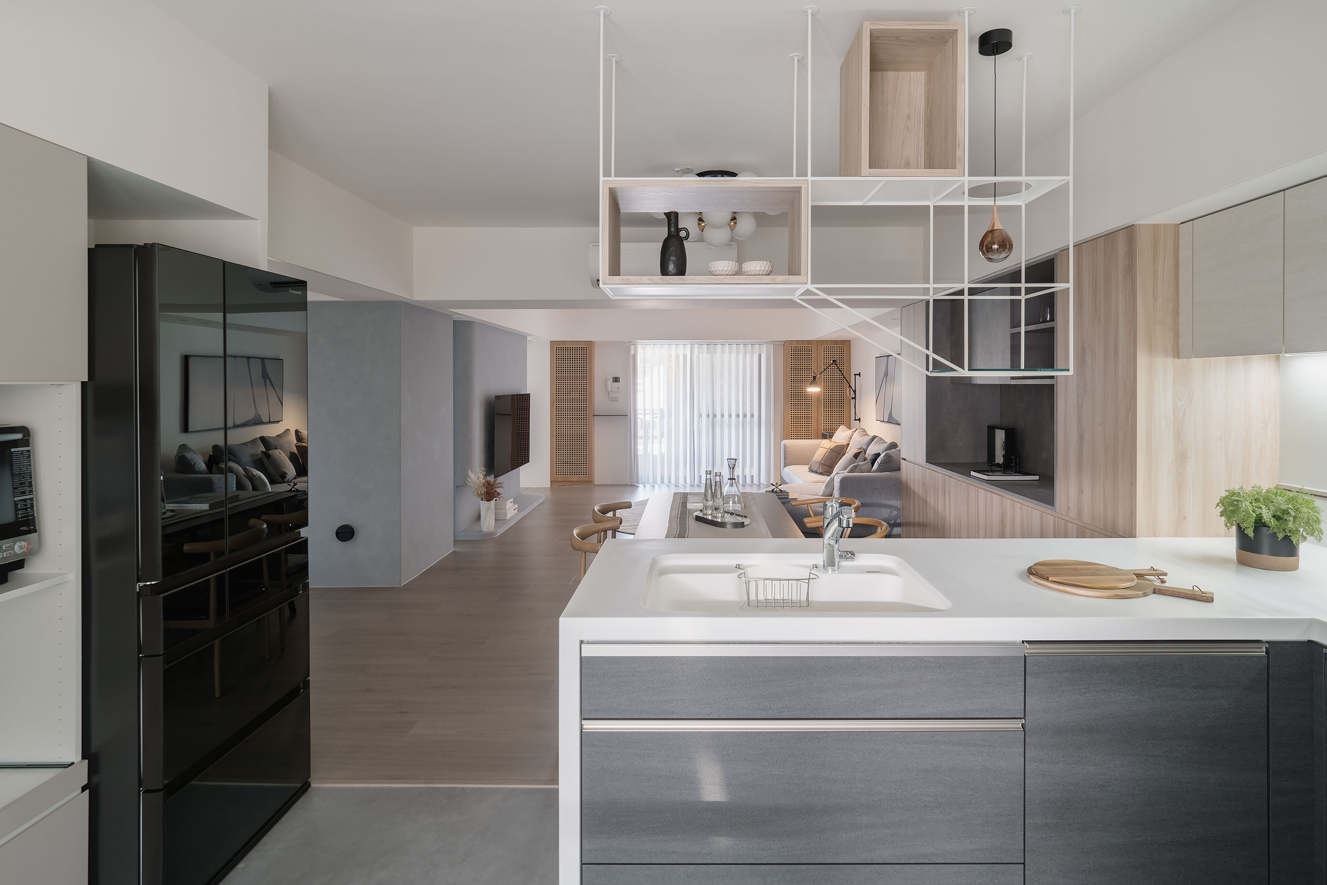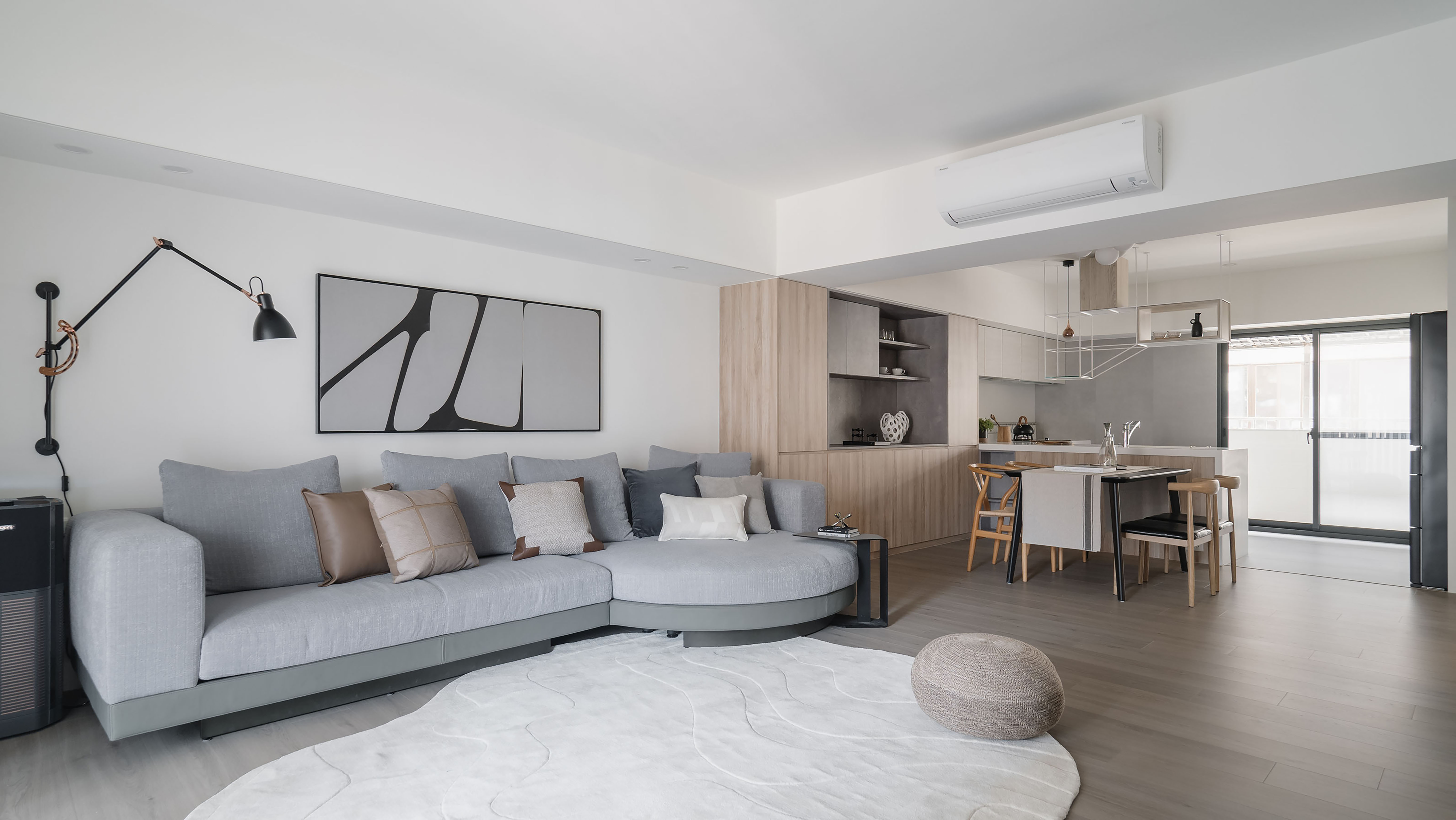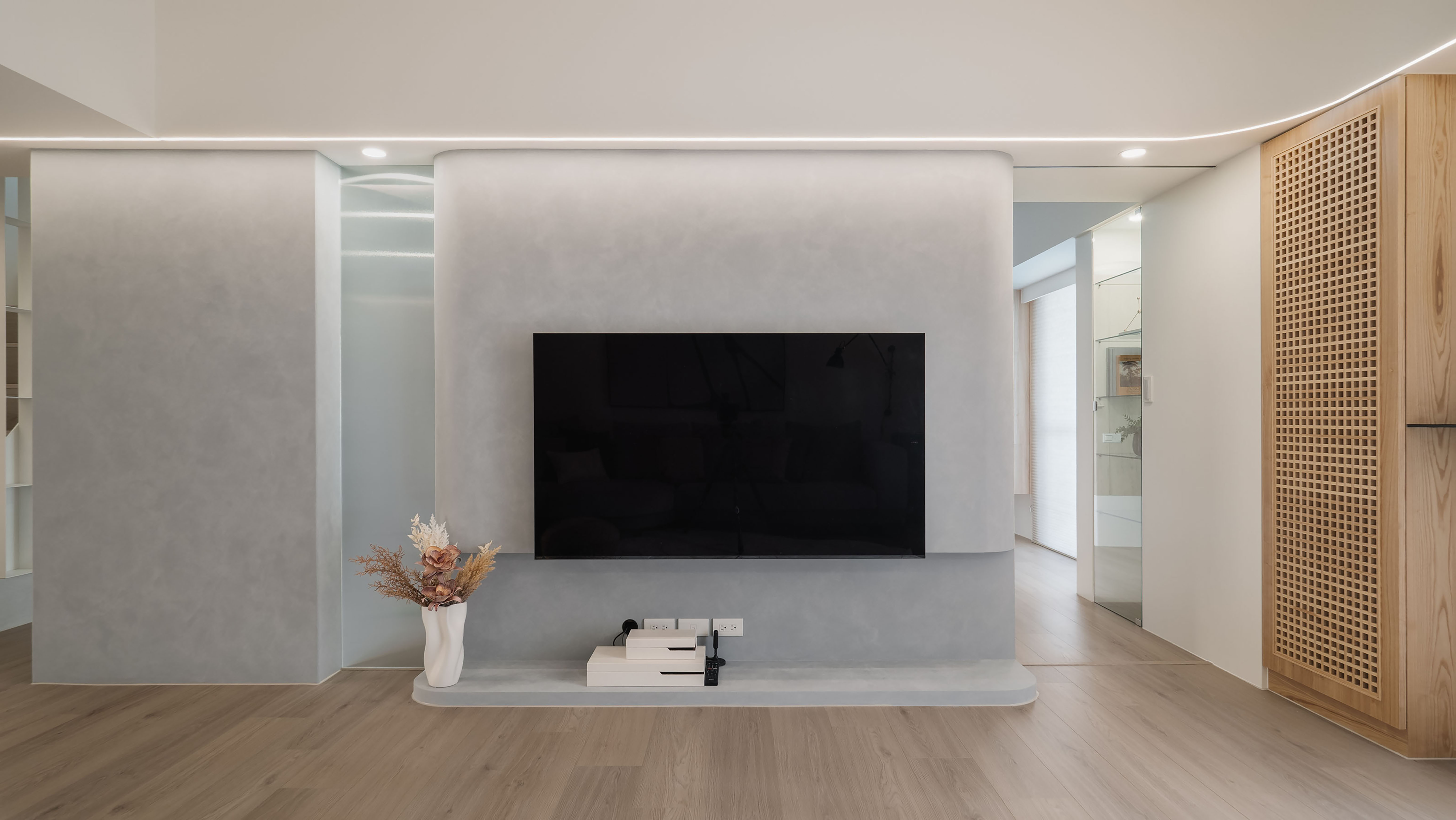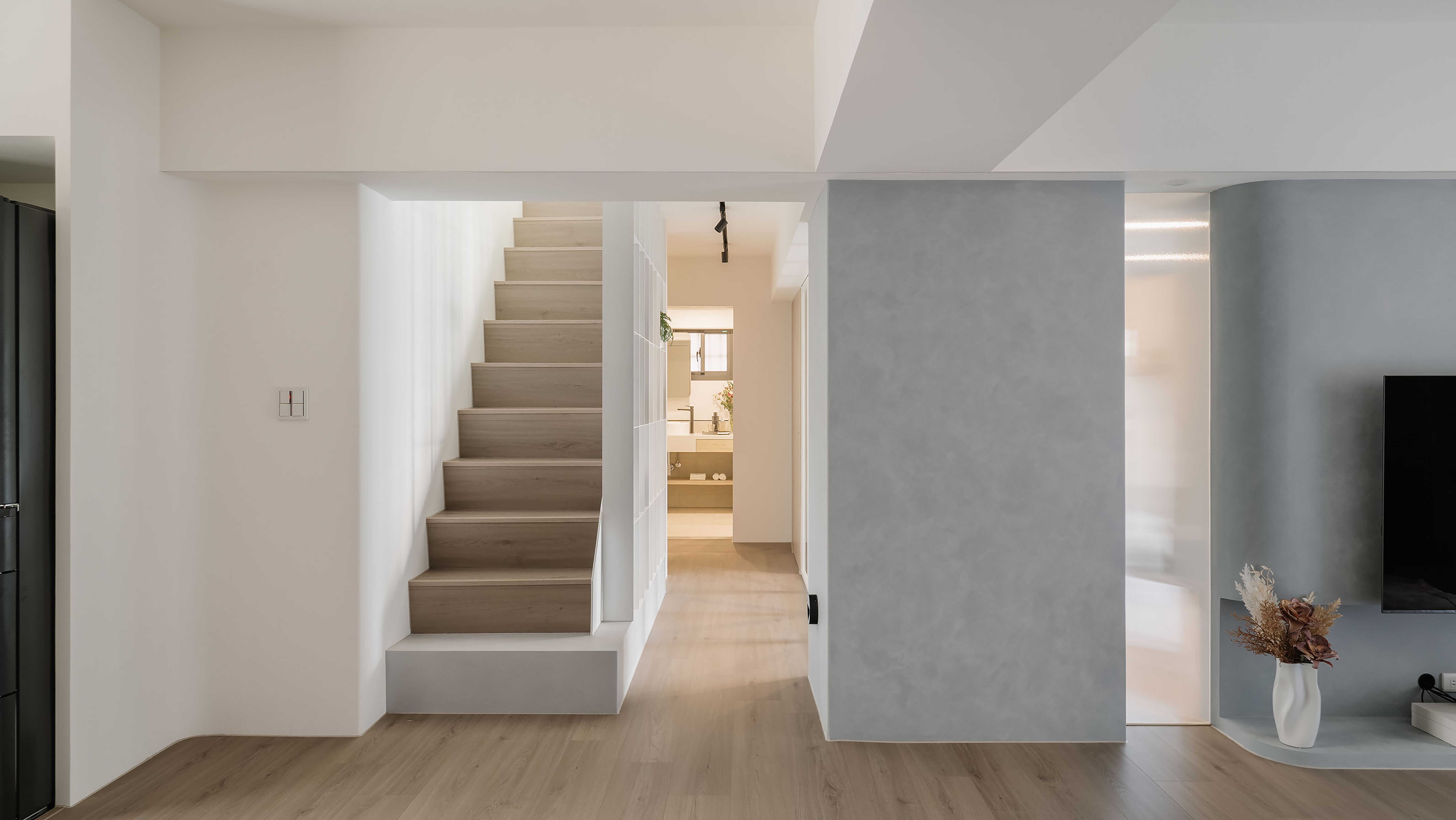 Given the relatively low ceiling height, the design team strategically introduced natural and artificial light as the defining language of the interior, alleviating visual pressure and fostering an open, easy ambiance. Concealed the beam structure in the living room ceiling to soften its presence, while rounded corners and a ribbon of diffused lighting trace along the edges, easing the rigidity of the architectural form. A gray-white palette forms the foundation, accented with restrained metal elements, warm wood tones, and selective touches of color. As daylight shifts throughout the day, shadows delicately glide across the varied materials and muted hues, shaping a refined and quietly expressive living environment with a rhythm akin to gentle breathing.