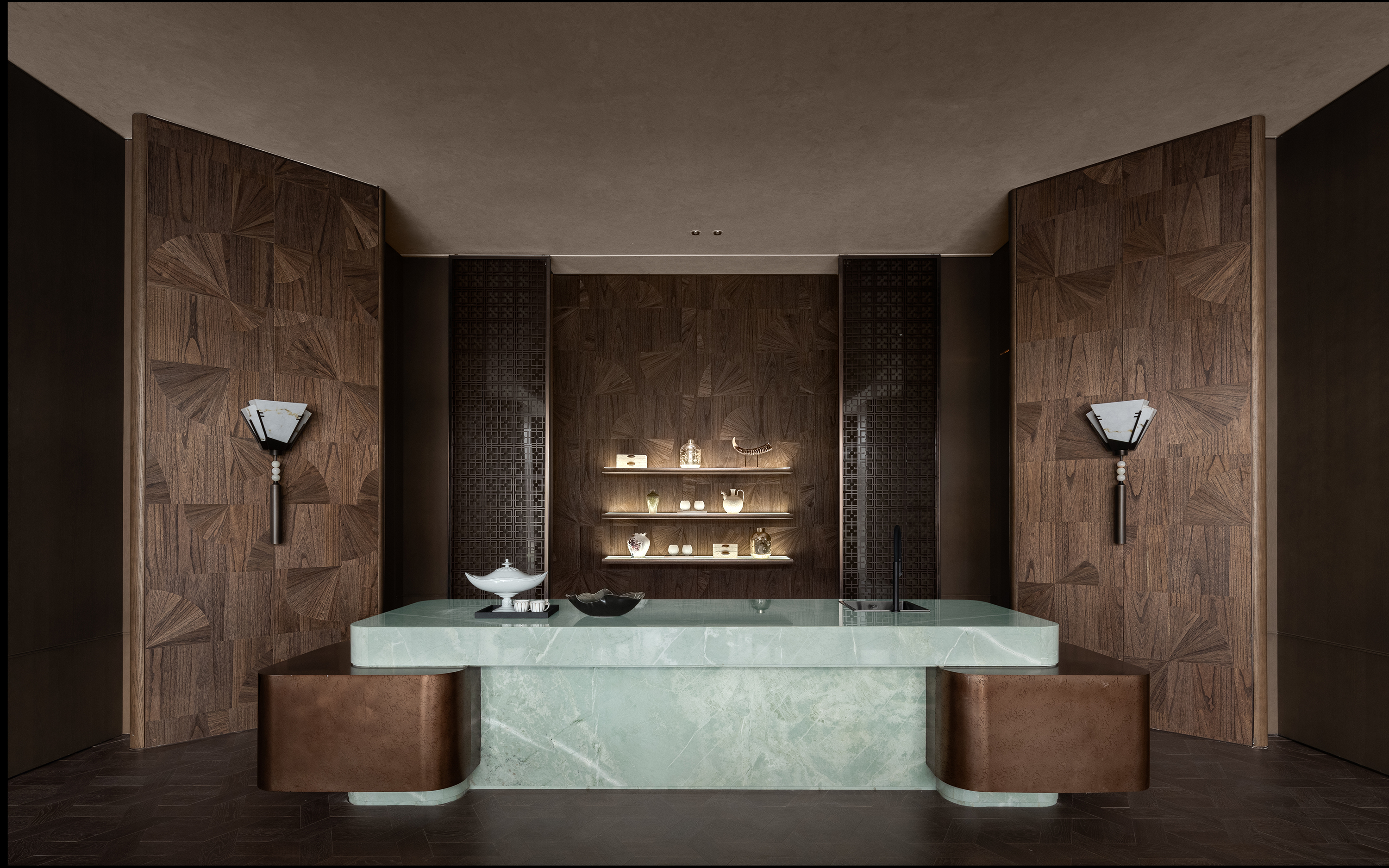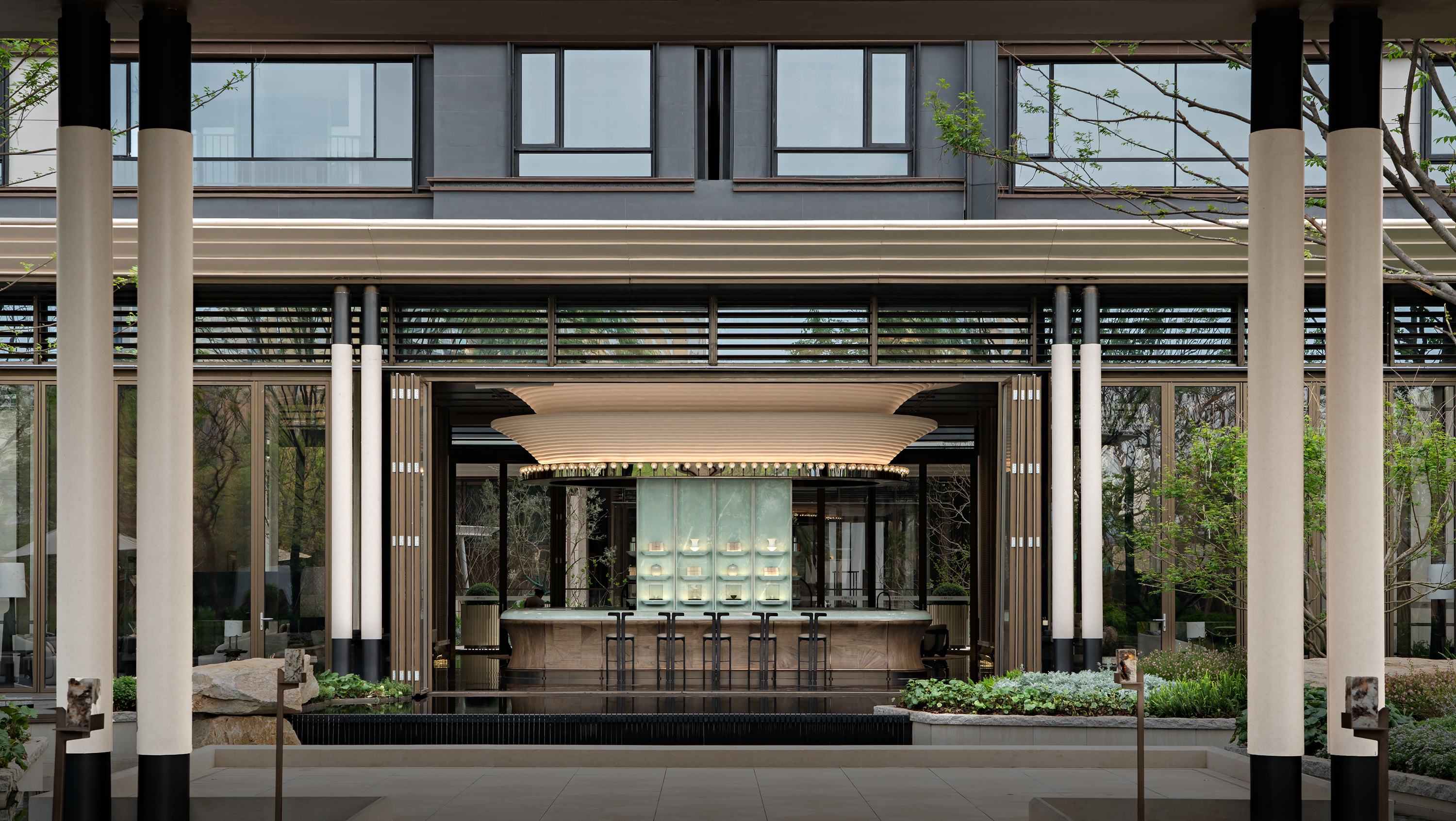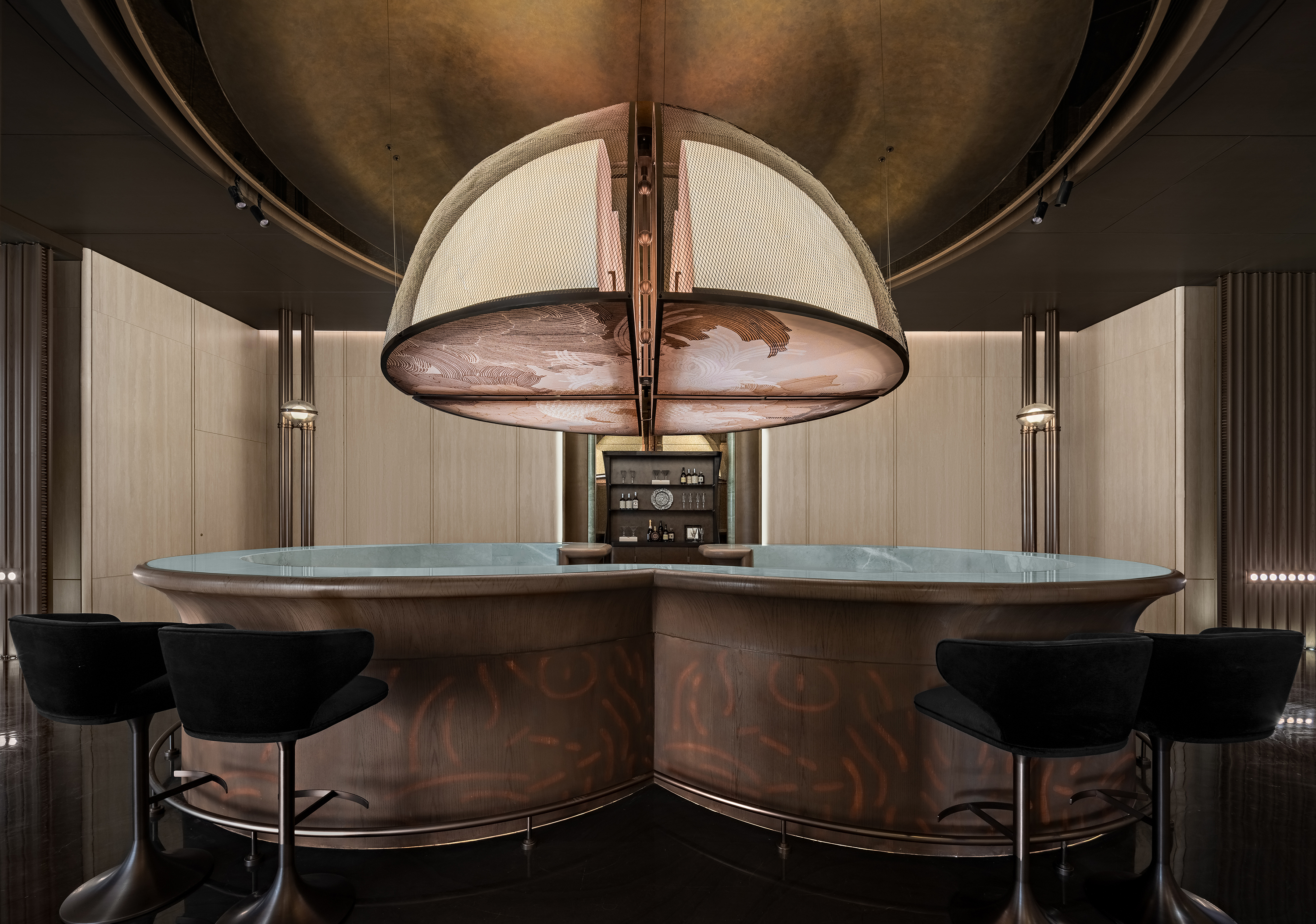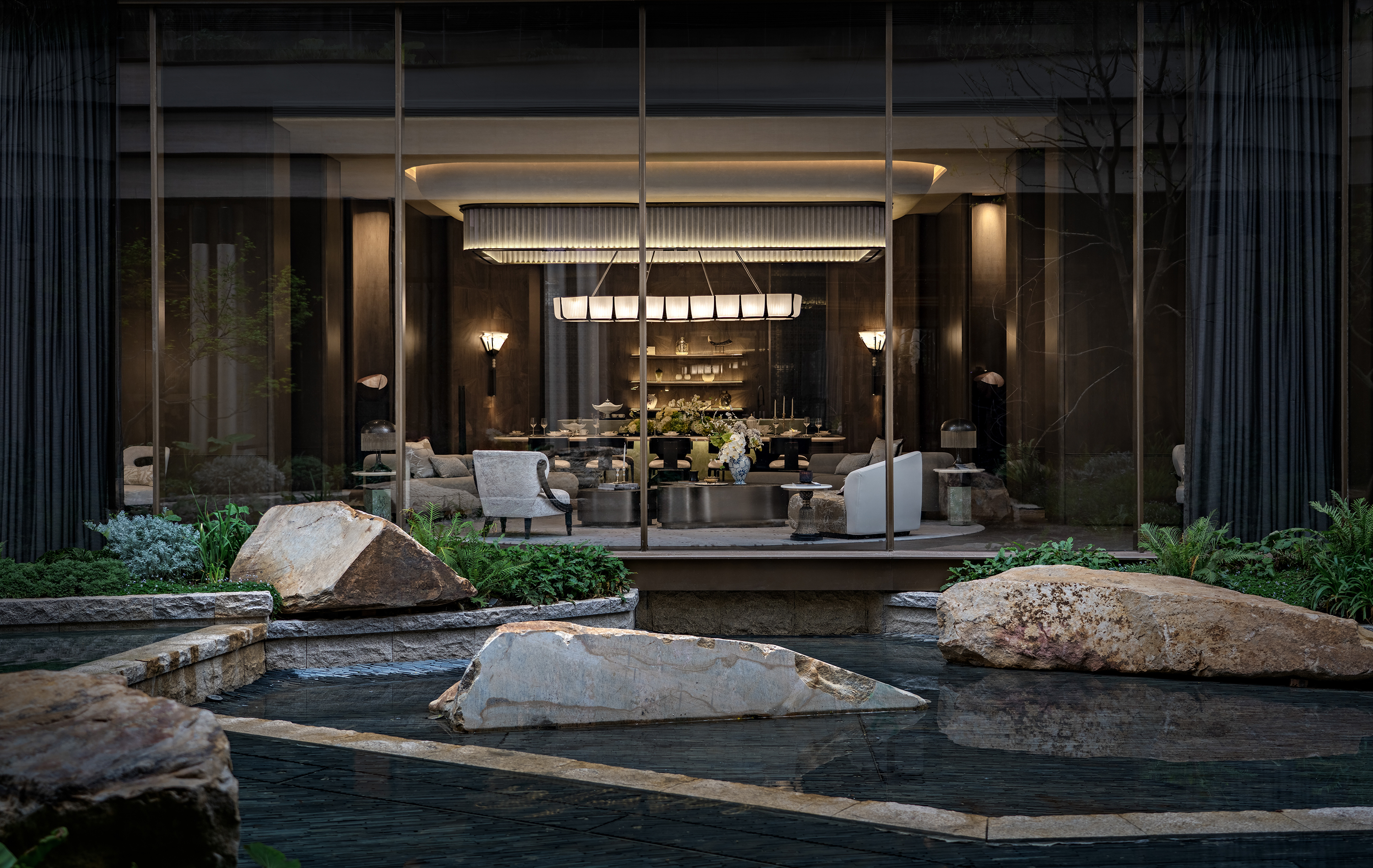 The project envisions a “Graceful Chengdu Aesthetic · A Refined Western Sanctuary,” and is developed around the core concept of “Three Thousand Years of Tianfu, Condensed into One Garden.” Drawing inspiration from the spatial pattern of the Western Sichuan Linpan and the legacy of ancient Shu civilization, the design reinterprets traditional garden rituals through a contemporary architectural language, creating a low-density, tranquil residential environment imbued with cultural depth. The spatial sequence unfolds as a narrative of “strolling through a garden,” where enclosure, transition, and layered vistas evoke an immersive experience of changing scenes with every step. From the reception area to the tea lounge, negotiation area, library bar, Western dining space, and the central spiral staircase, the circulation establishes a harmonious interplay between the tangible and the intangible, transforming the return home into a journey of ritual, emotion, and discovery. Cultural symbols are distilled into experiential memory points: the reception hall features a Shu brocade installation abstracting mountain and water imagery; the tea lounge employs teacup motifs to evoke serene elegance; the library bar interprets ridge lines and ripples to convey literati sentiment; while the Western dining area bridges cross-cultural aesthetics with a refined fusion of French and Chinese influences. Materiality combines wood grain, natural stone, and concrete, enhanced with semi-translucent onyx to enrich light and shadow, forming a restrained yet expressive visual language. A muted grey palette anchors the space, subtly contrasted with teal stone and textile details. With modernity as its structure and culture as its soul, the design integrates historical quietude with the warmth of the land, creating an elevated living environment that nurtures spiritual belonging and poetic experience.