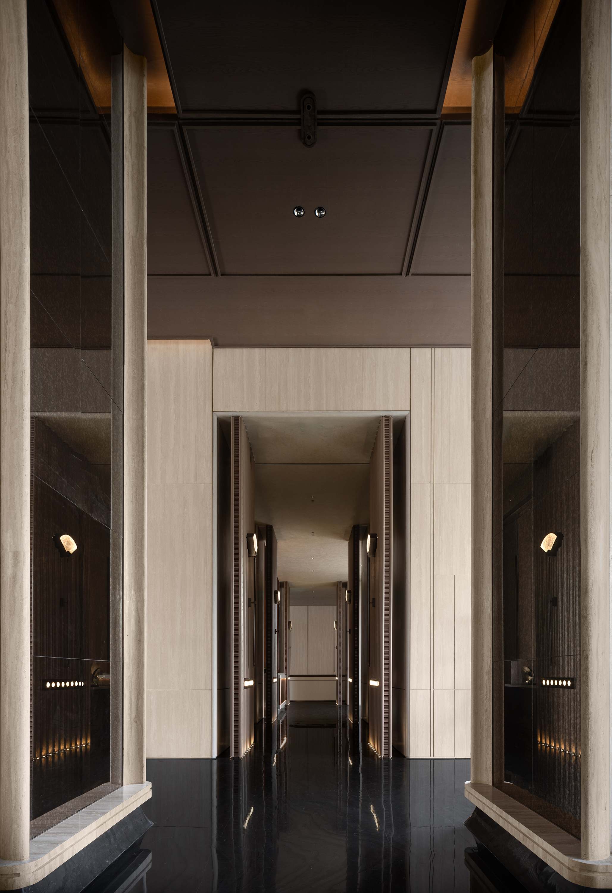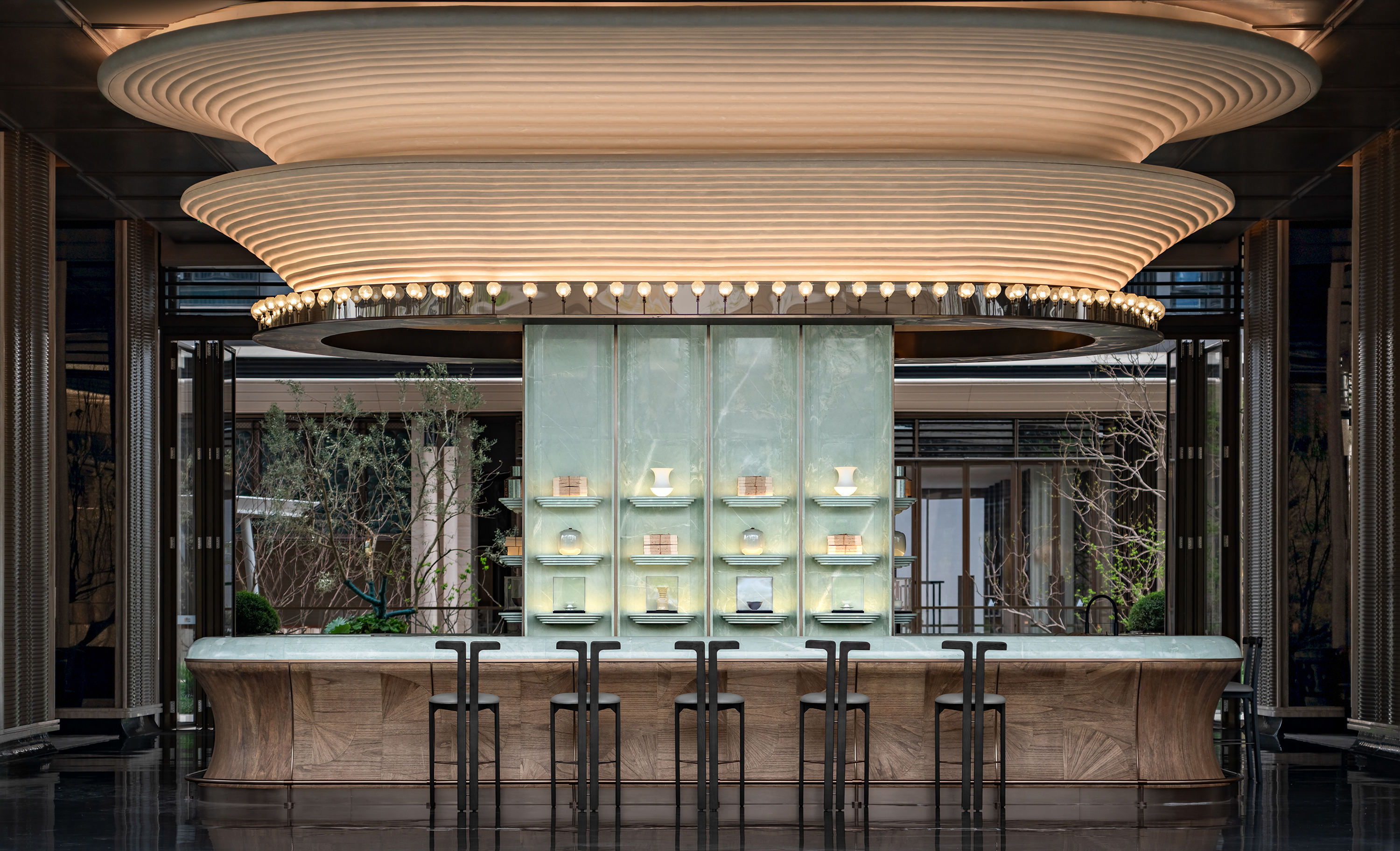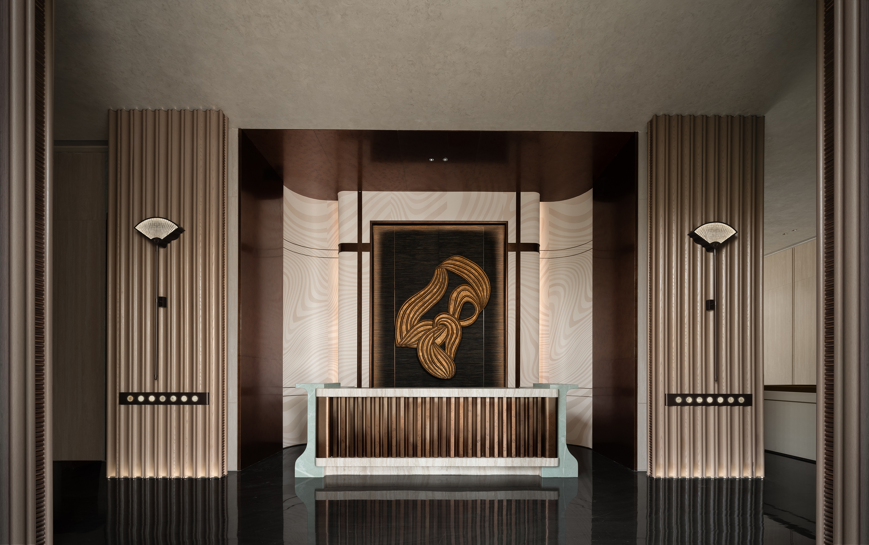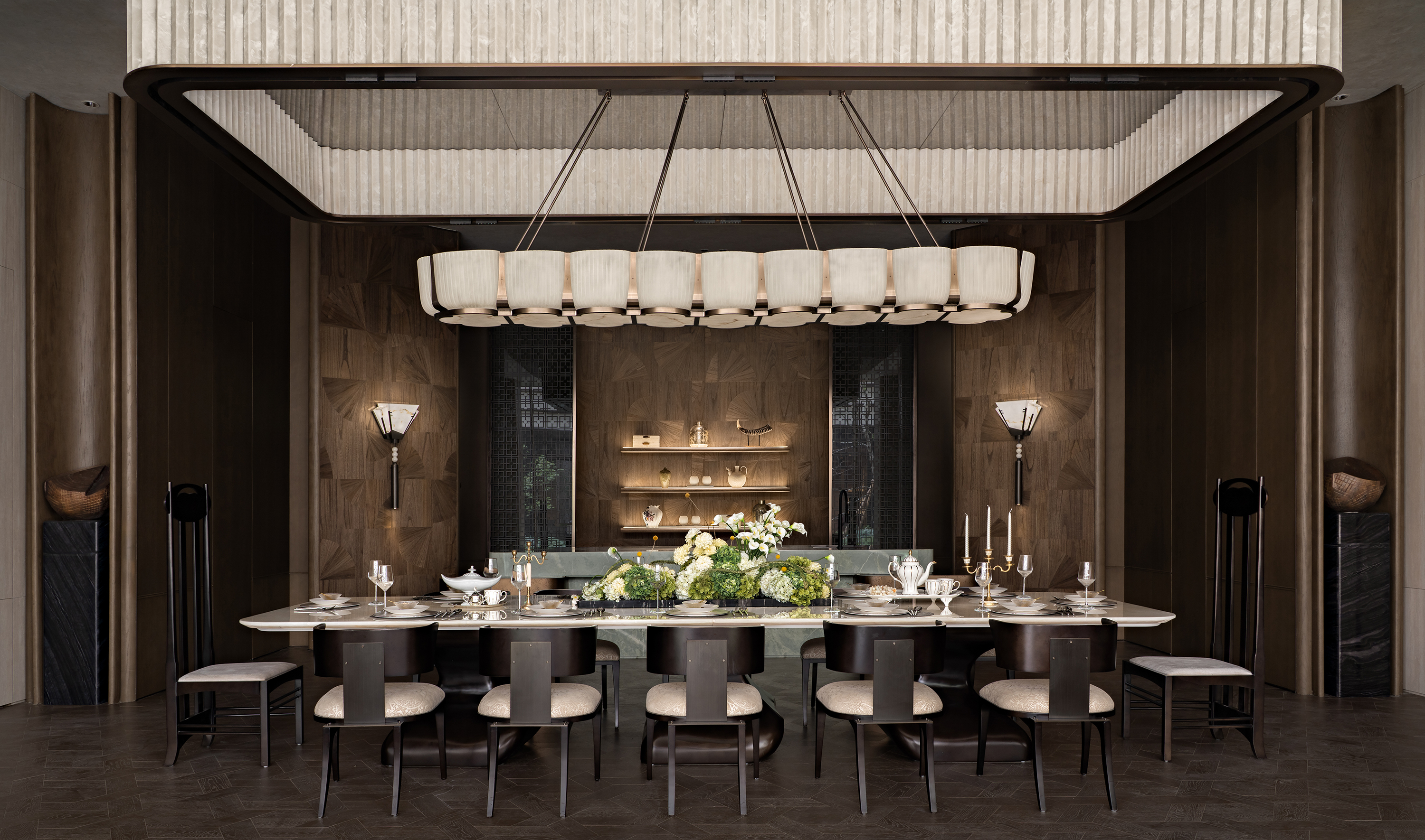 The project envisions a “Graceful Chengdu Aesthetic · A Refined Western Sanctuary,” and is developed around the core concept of “Three Thousand Years of Tianfu, Condensed into One Garden.” Drawing inspiration from the spatial pattern of the Western Sichuan Linpan and the legacy of ancient Shu civilization, the design reinterprets traditional garden rituals through a contemporary architectural language, creating a low-density, tranquil residential environment imbued with cultural depth. The spatial sequence unfolds as a narrative of “strolling through a garden,” where enclosure, transition, and layered vistas evoke an immersive experience of changing scenes with every step. From the reception area to the tea lounge, negotiation area, library bar, Western dining space, and the central spiral staircase, the circulation establishes a harmonious interplay between the tangible and the intangible, transforming the return home into a journey of ritual, emotion, and discovery. Cultural symbols are distilled into experiential memory points: the reception hall features a Shu brocade installation abstracting mountain and water imagery; the tea lounge employs teacup motifs to evoke serene elegance; the library bar interprets ridge lines and ripples to convey literati sentiment; while the Western dining area bridges cross-cultural aesthetics with a refined fusion of French and Chinese influences. Materiality combines wood grain, natural stone, and concrete, enhanced with semi-translucent onyx to enrich light and shadow, forming a restrained yet expressive visual language. A muted grey palette anchors the space, subtly contrasted with teal stone and textile details. With modernity as its structure and culture as its soul, the design integrates historical quietude with the warmth of the land, creating an elevated living environment that nurtures spiritual belonging and poetic experience.