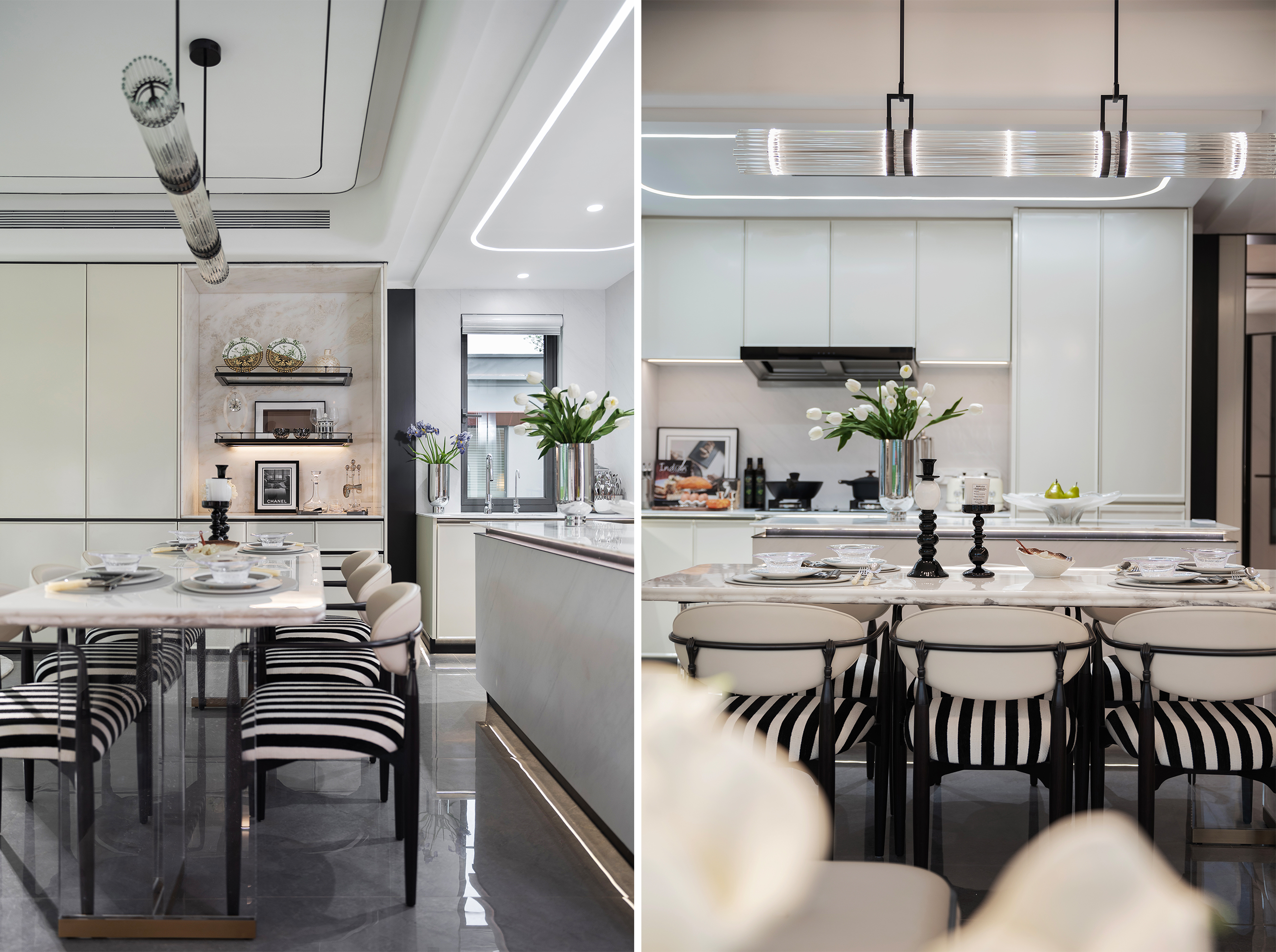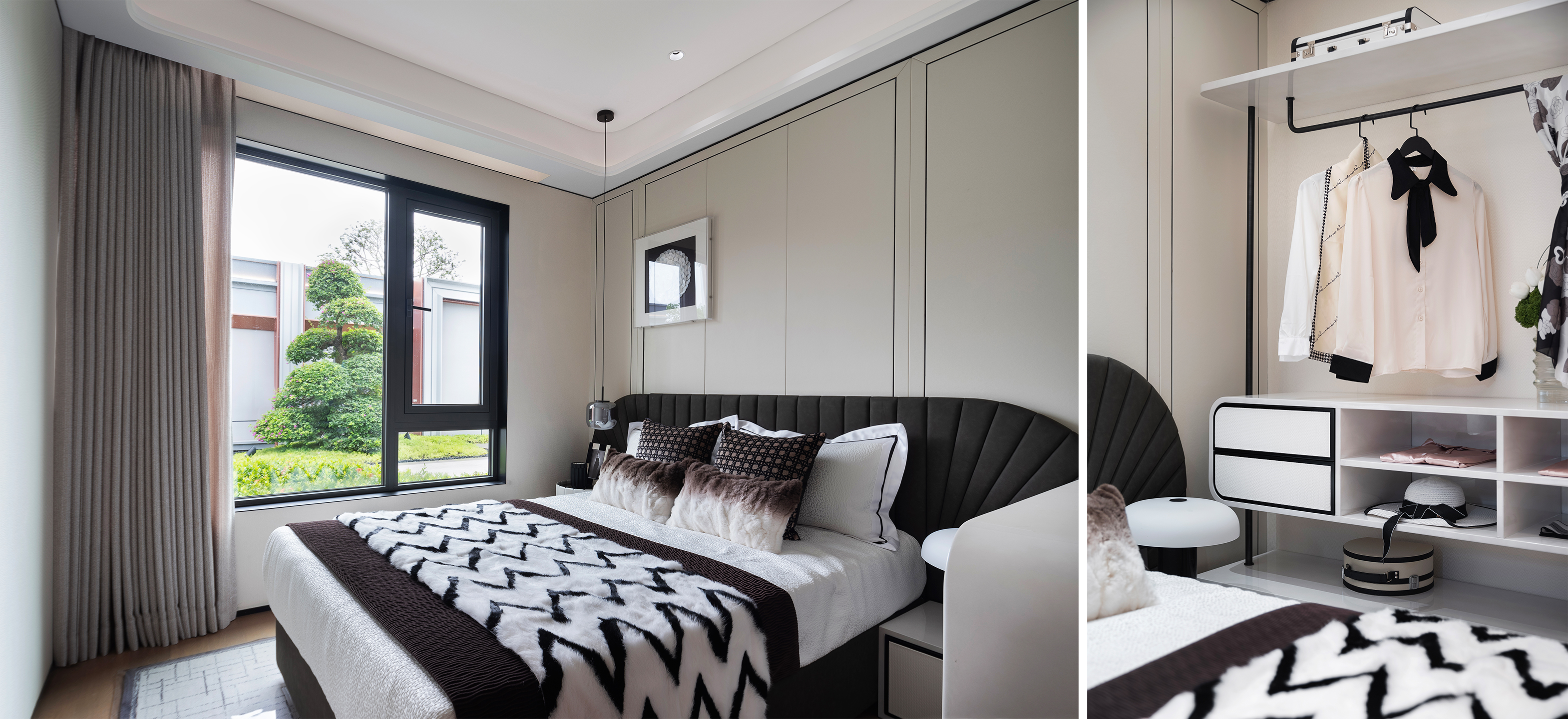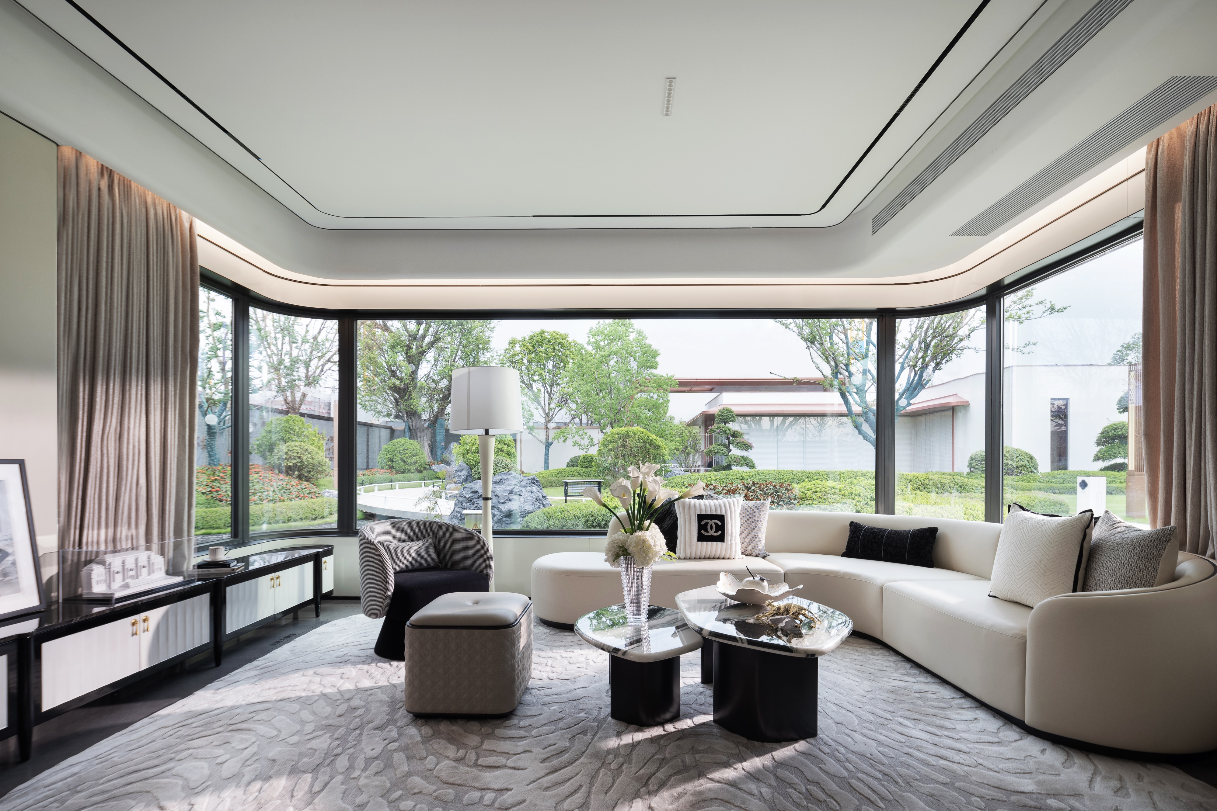 The interior palette is rendered in elegant, high-quality neutral tones, avoiding reliance on high-saturation colors in favor of tactile subtlety to evoke a warm ambiance. Black-and-white artistic touches recur throughout the home. From the diamond-patterned details in the entry corridor to the tweed textiles in the living area, from the minimalist cabinetry in the open kitchen to the velvet upholstery and quilted diamond cushions in the bedrooms—each detail quietly echoes the timeless aesthetics of Chanel.