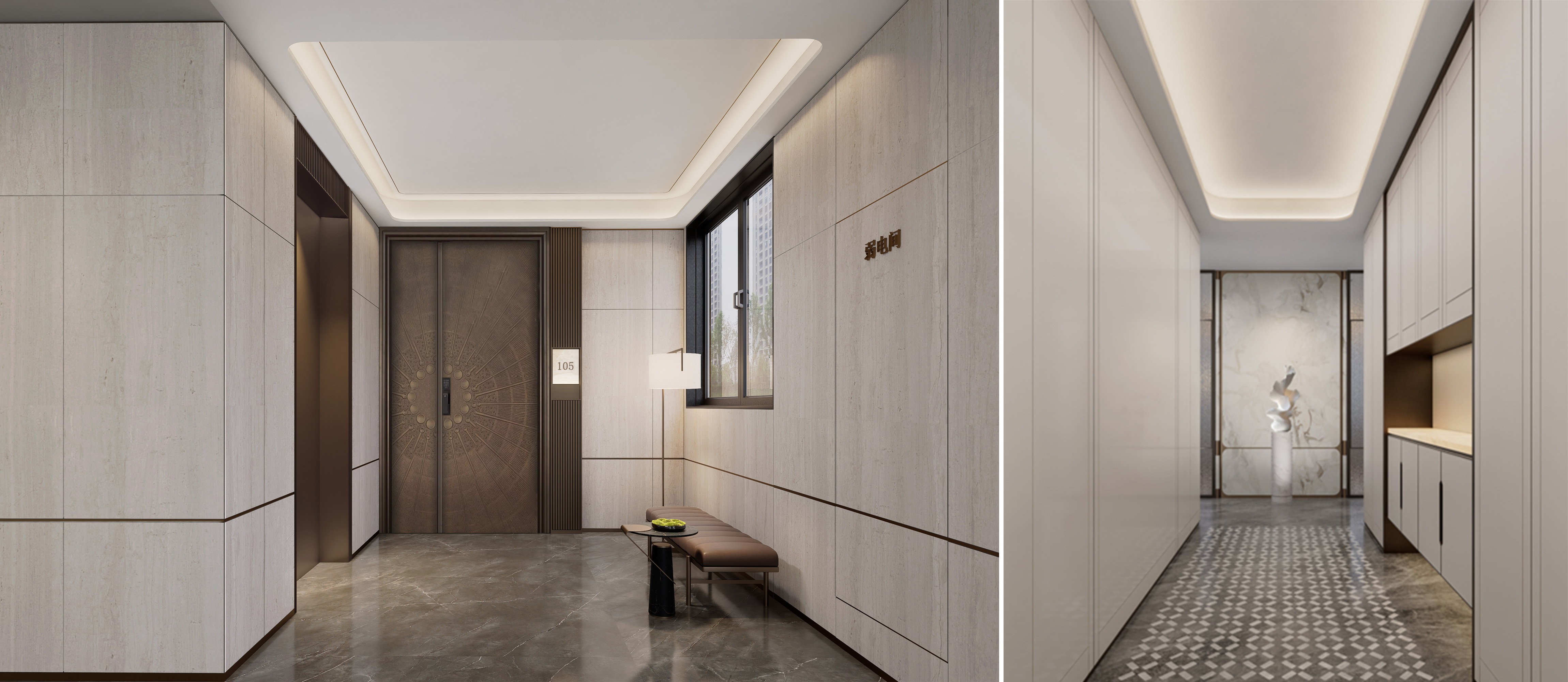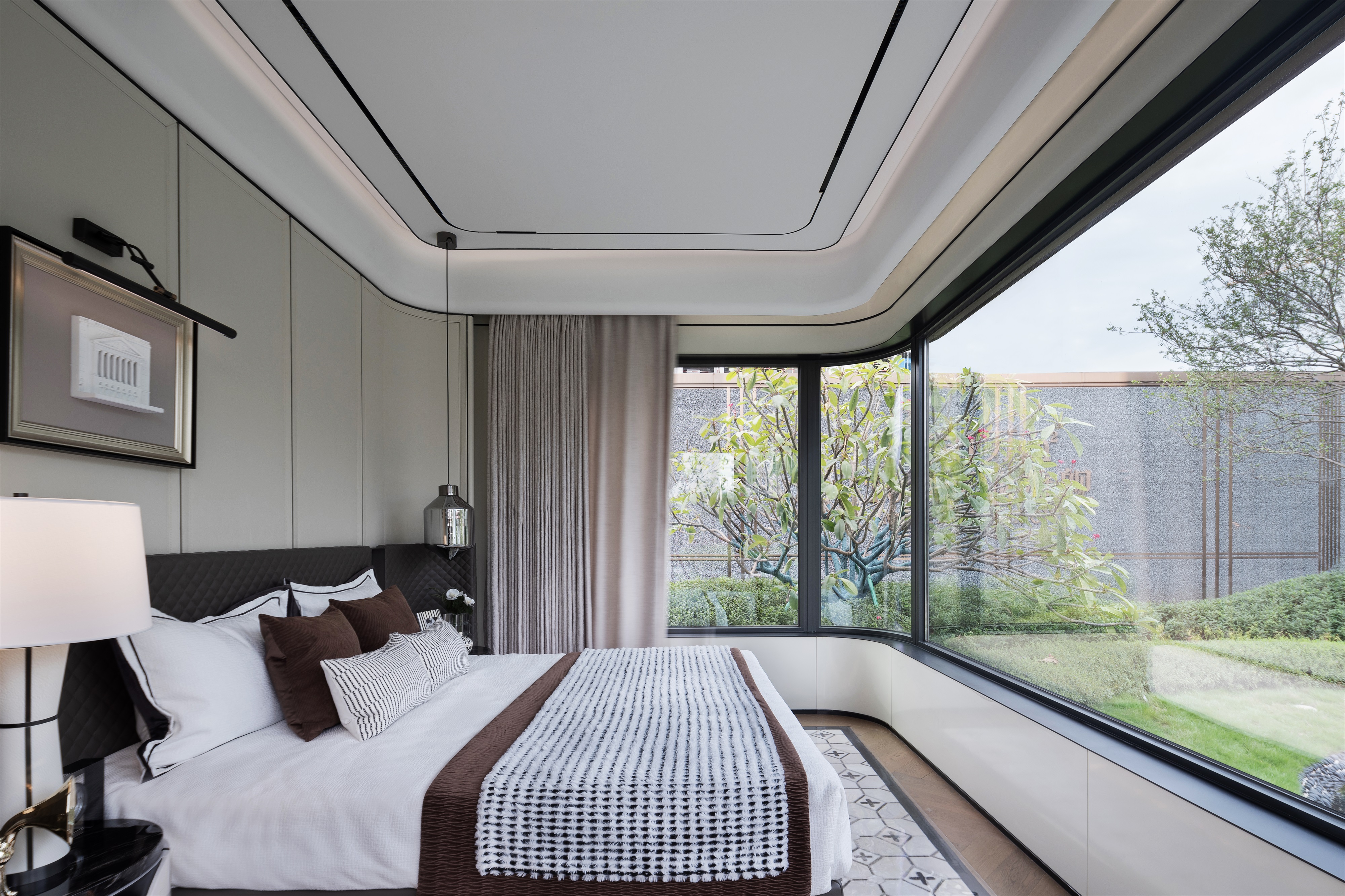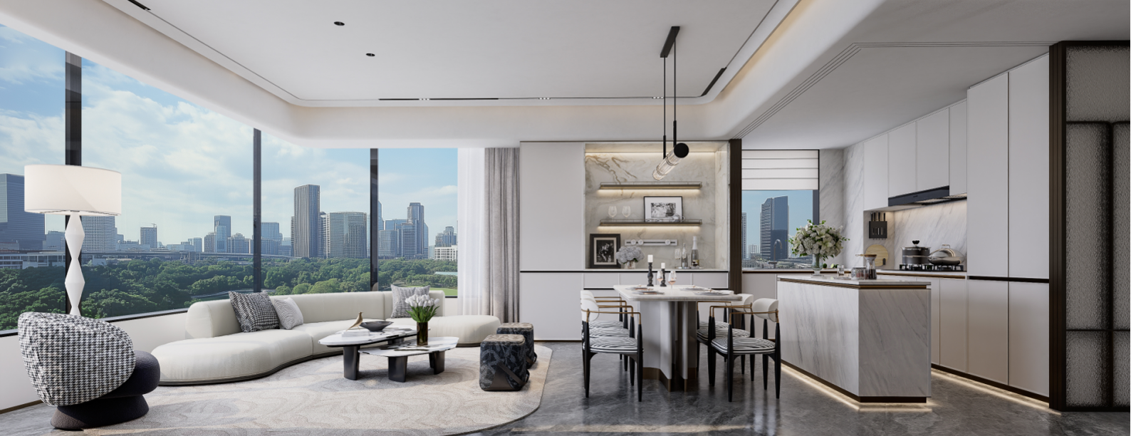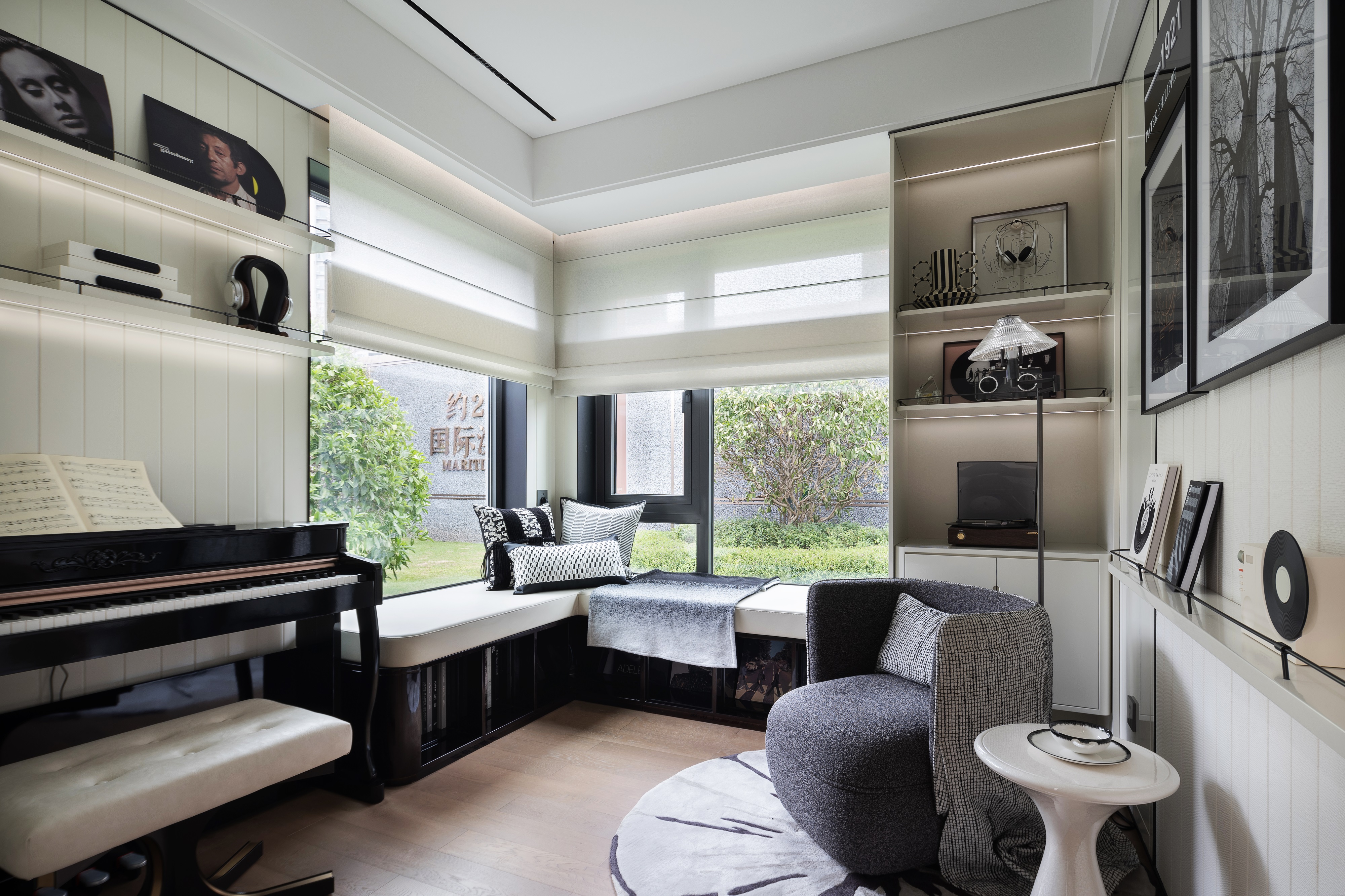 The interior palette is rendered in elegant, high-quality neutral tones, avoiding reliance on high-saturation colors in favor of tactile subtlety to evoke a warm ambiance. Black-and-white artistic touches recur throughout the home. From the diamond-patterned details in the entry corridor to the tweed textiles in the living area, from the minimalist cabinetry in the open kitchen to the velvet upholstery and quilted diamond cushions in the bedrooms—each detail quietly echoes the timeless aesthetics of Chanel.