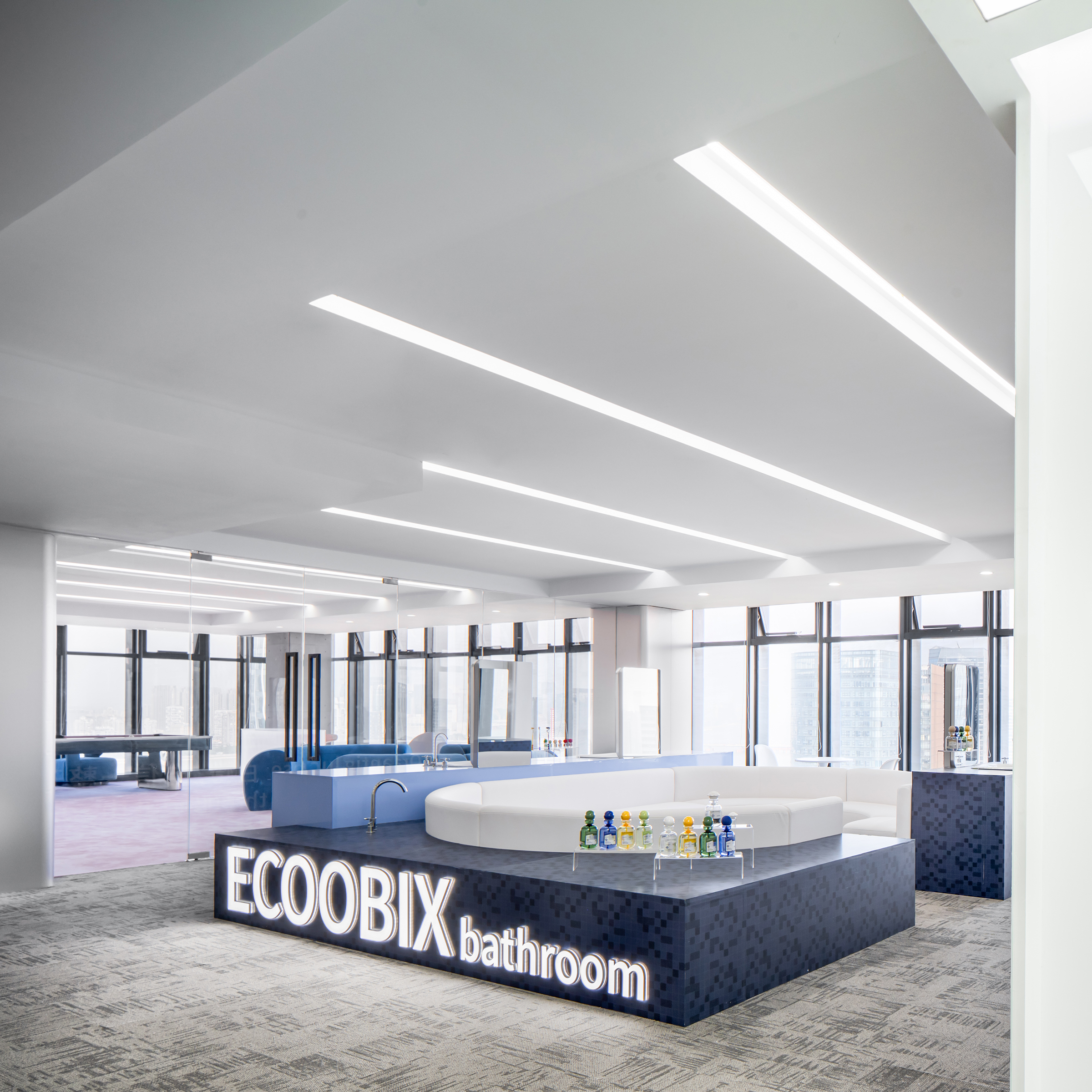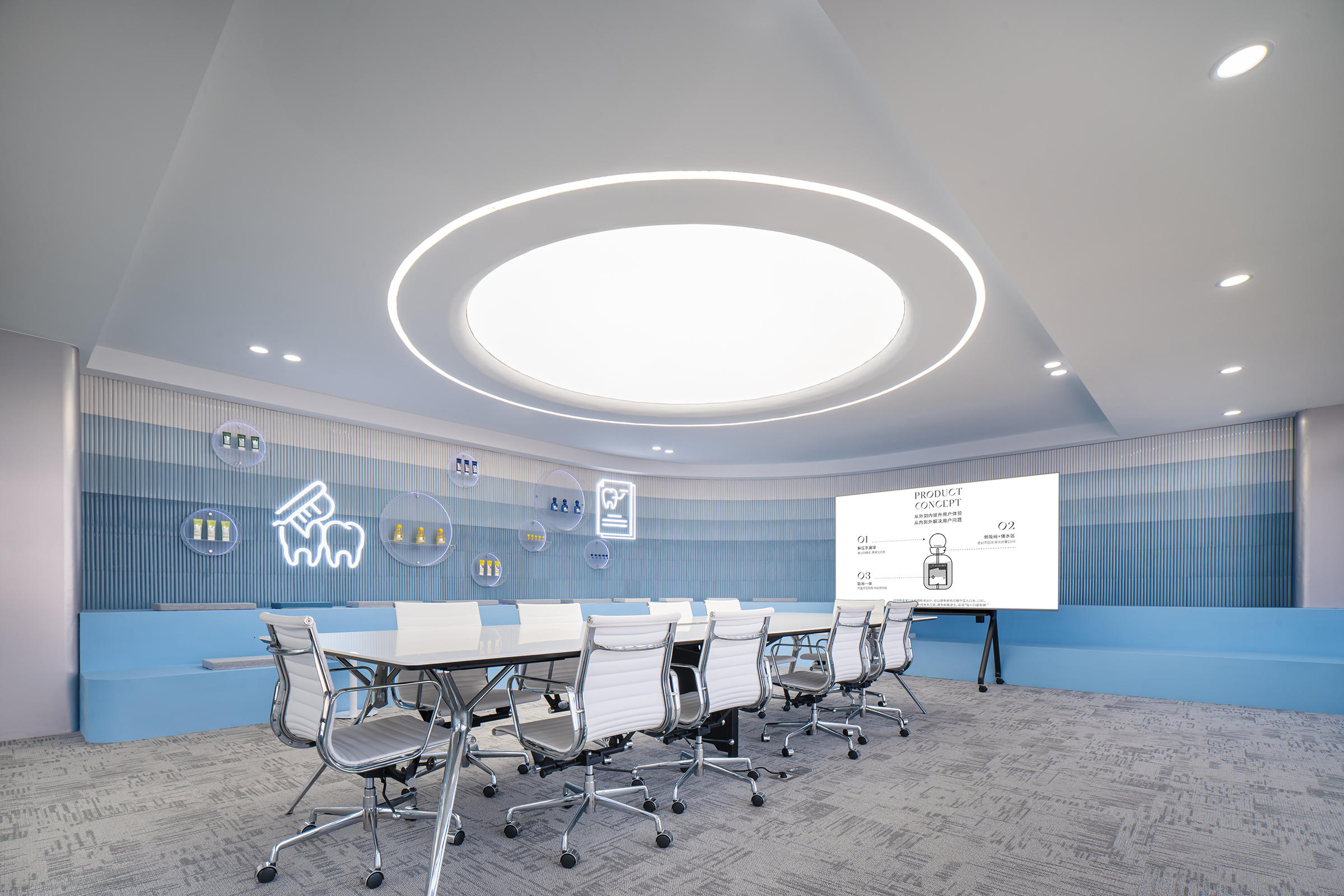 The project spans 2,450 square meters, aiming to redefine the traditional office environment by integrating brand exhibition, R&D promotion, and employee empowerment into a dynamic experience platform. The design is inspired by the brand’s core technology, "Marine Glycosidase," and adopts the concept of "Symbiotic Sea Isle," drawing parallels with the purity, inclusivity, and ceaseless energy of the ocean, reflecting the brand's commitment to cleanliness and innovation.