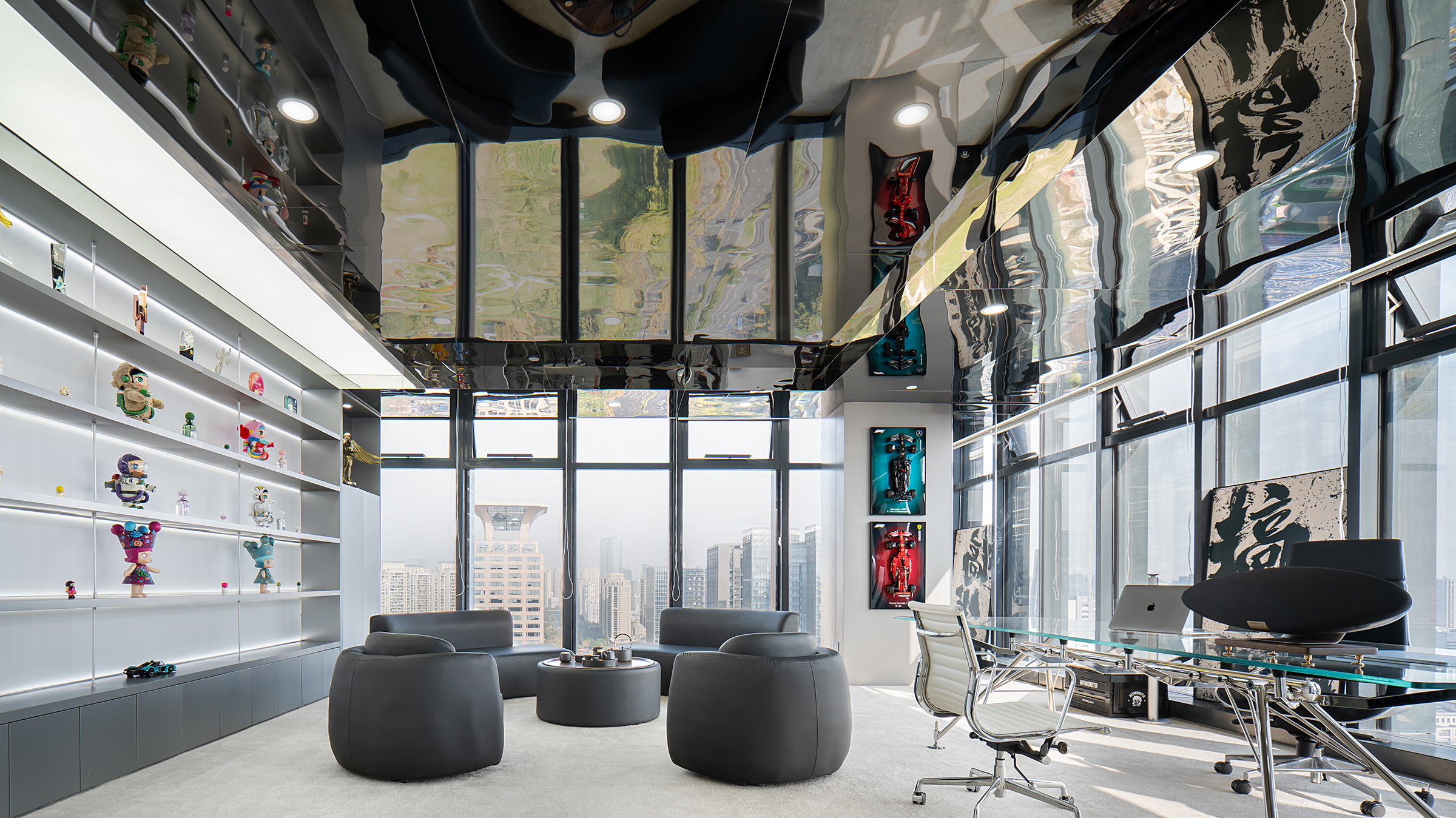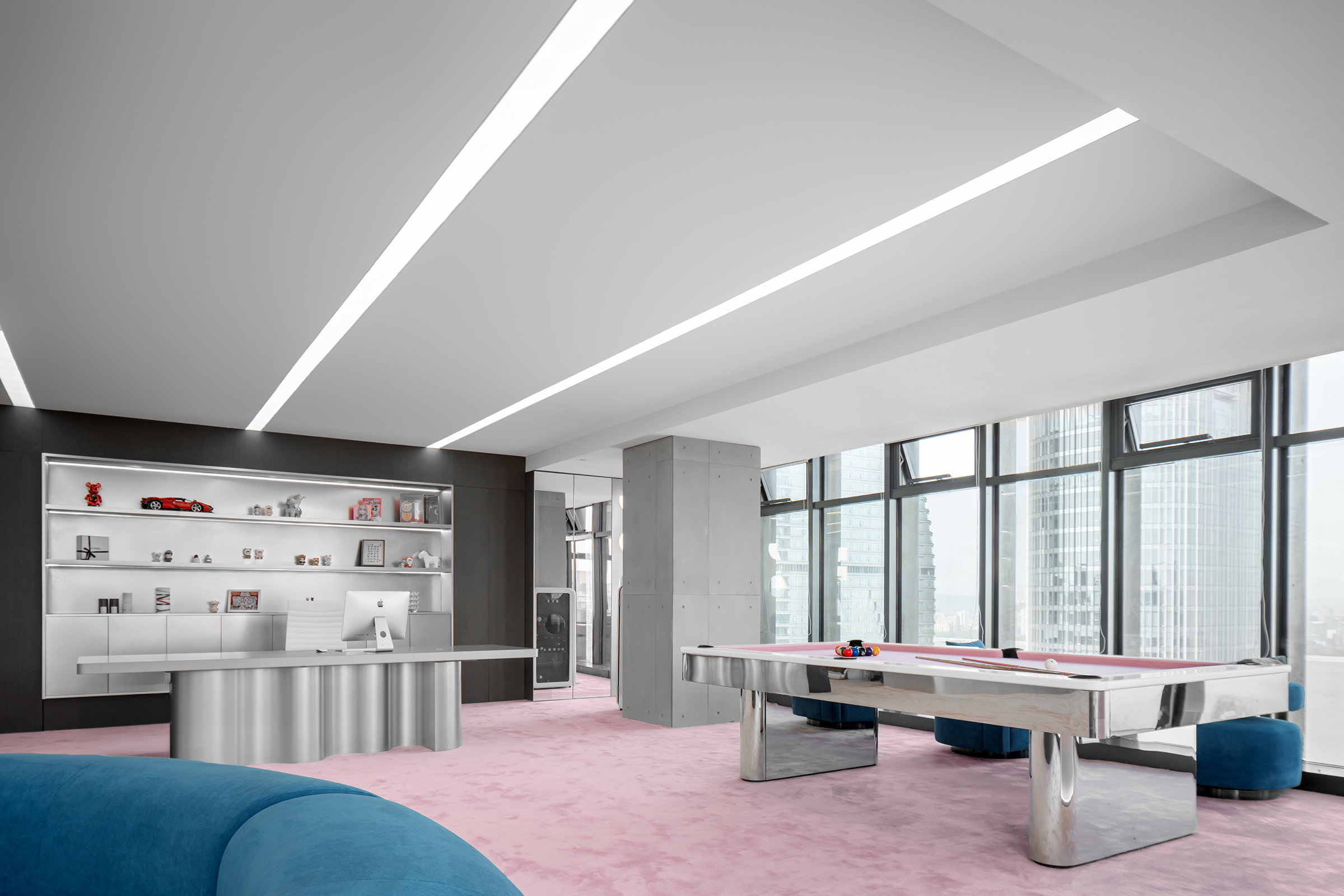 The design approach focuses on flexible growth, with adaptable workstations and multifunctional furniture to accommodate future changes. A systematic application of marine-themed elements, including wave-shaped furniture and light matrices, ensures a cohesive narrative throughout the space. The challenge of balancing highly experiential public areas with high-density workstations is addressed through functional layering and time-based sharing, enabling the space to serve different user groups at different times. The tiered meeting area, for example, functions both as a product display stage and an all-hands meeting venue, while the LAB Café blends exhibition displays, light dining, and flexible workspaces.
