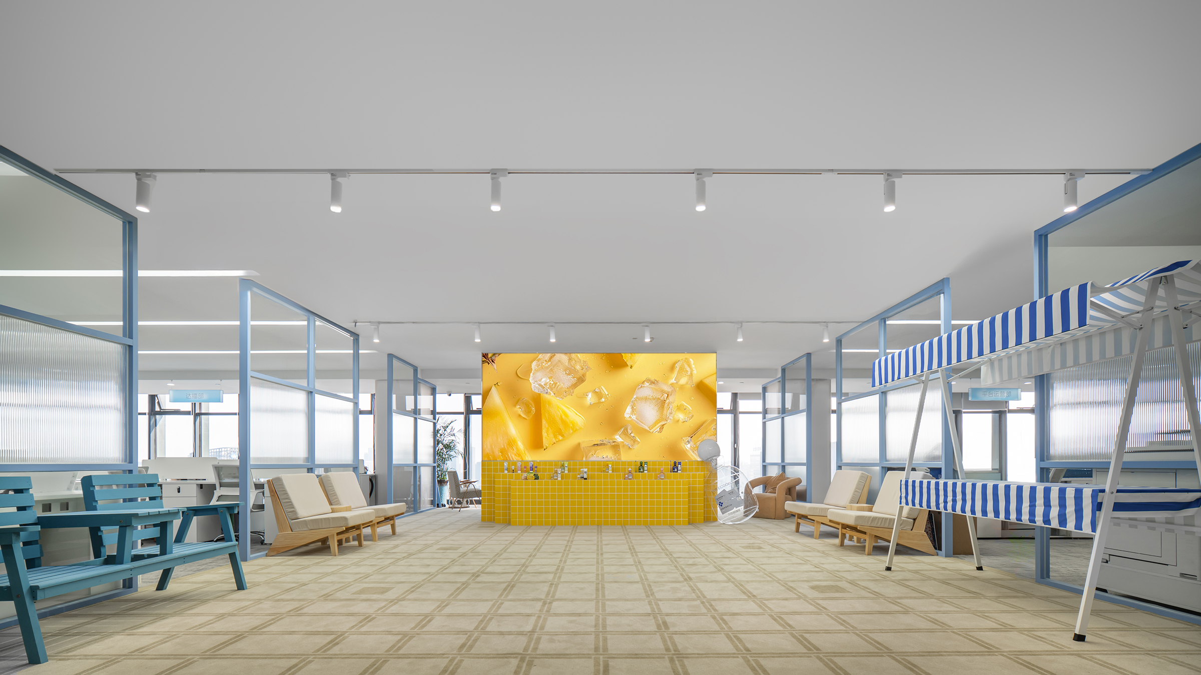 Inspiration Beach: A creative recharge zone for employees, fostering innovation through informal interaction, enhanced by tropical fruit carts and specialty drink bars.