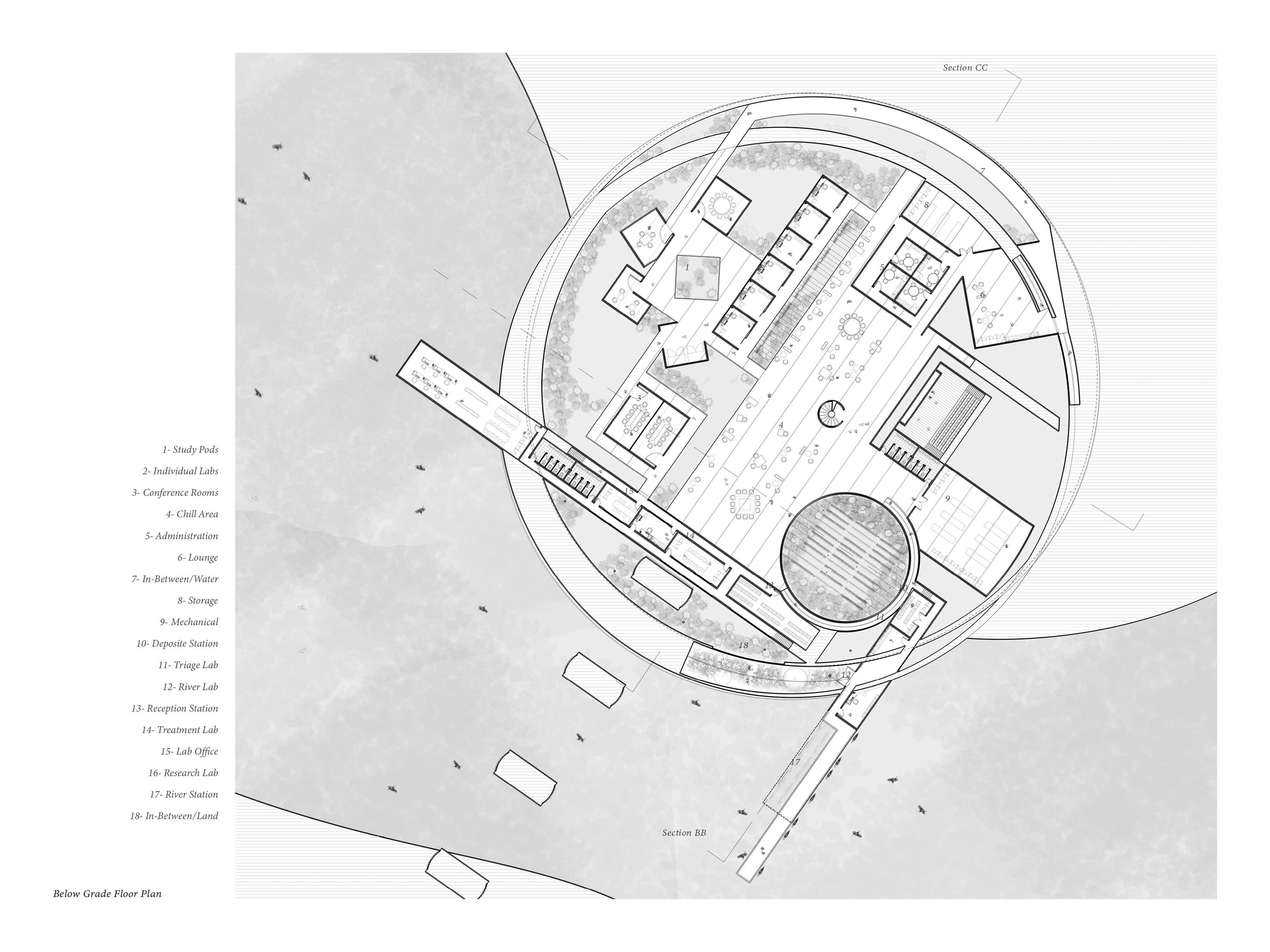 Architecturally, the project employs modular, permeable structures embedded within the river corridor. These platforms and enclosures accommodate the movement of water, sediment, and light, functioning as bio-productive infrastructure. Constructed from recycled steel, cast-in-place concrete, and timber walkways, the system is designed for climatic durability and ecological porosity. The modules form an adaptable framework capable of expanding or contracting as environmental conditions evolve.