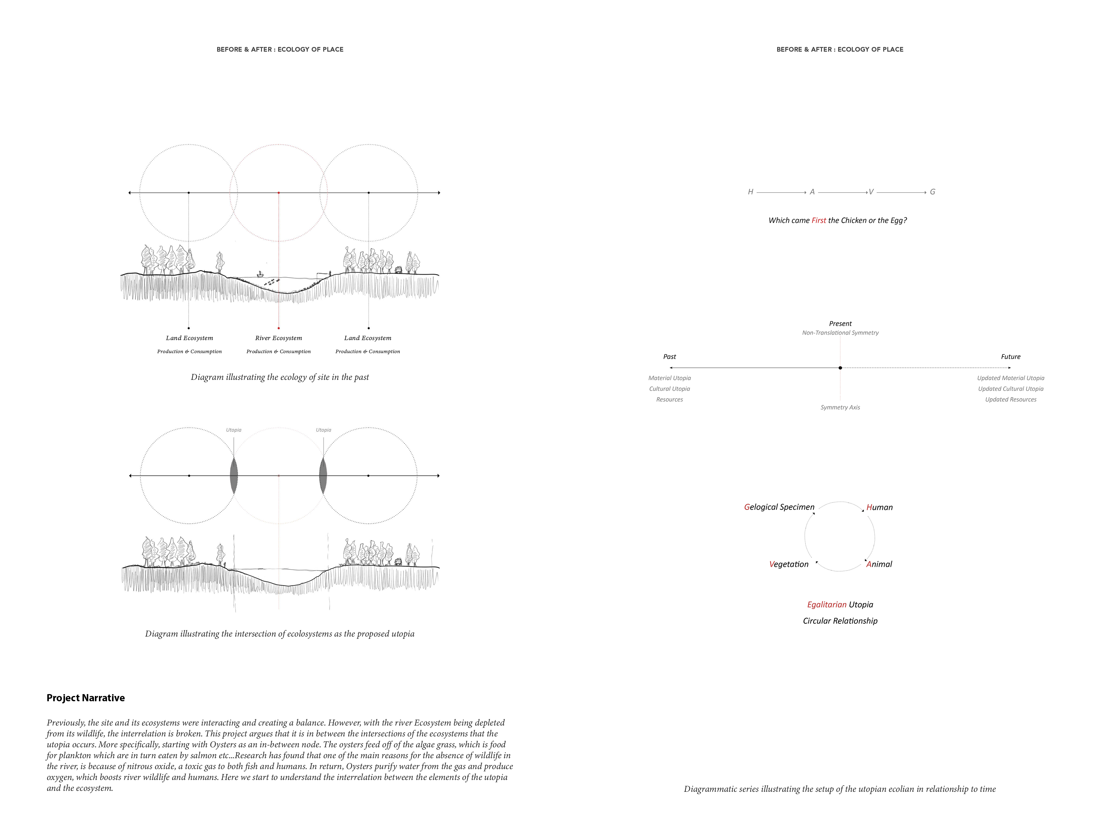 Rather than embracing a hierarchical, human-centered utopia, the project proposes a circular and interdependent model, where humans, animals, vegetation, and geological processes coexist within a shared ecological framework. The familiar “chicken or egg” paradox becomes a metaphor for rejecting linear narratives; in this vision, each organism and element is part of a reciprocal cycle that sustains the whole. Historically, the river supported such balance until pollution and habitat depletion fractured its interdependencies.