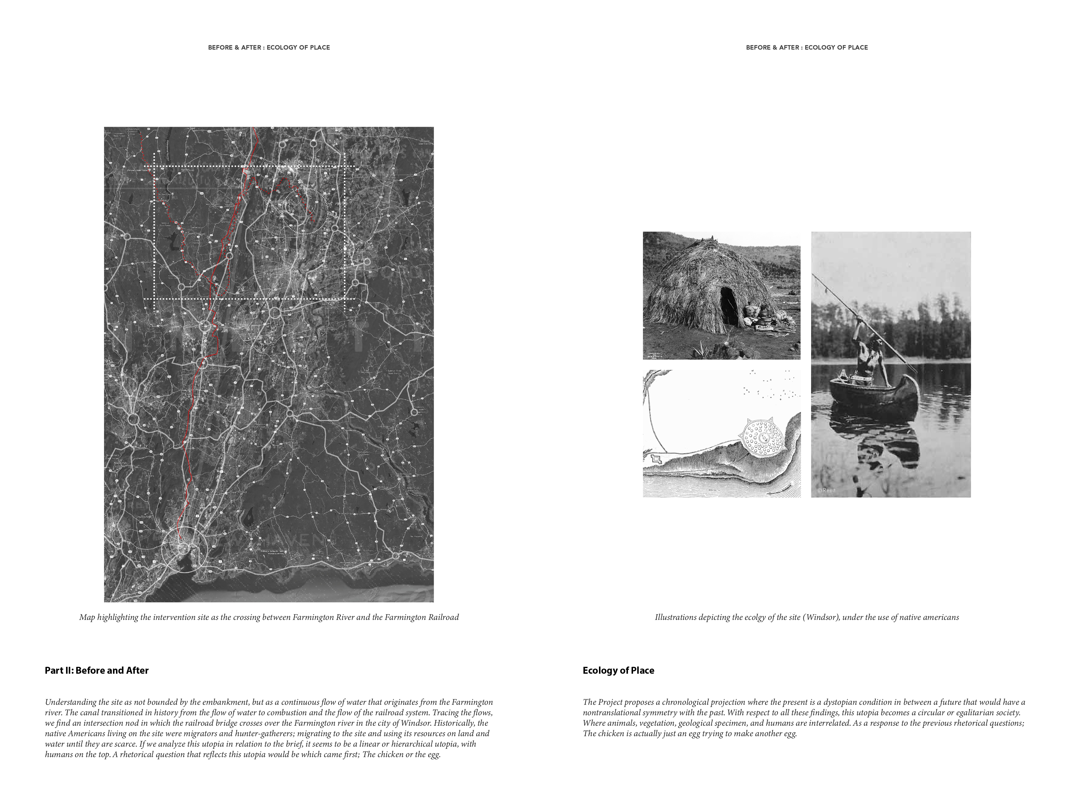 This project reconceives the site not as a fixed edge along the embankment, but as part of a continuous system of flows originating from the Farmington River. Historically, this landscape transitioned from an Indigenous ecology of seasonal migration and balanced resource use, to an industrial waterway powered by combustion, and later to a linear corridor structured by the railroad. At the moment where the rail bridge crosses the river in Windsor, these layers of movement—ecological, cultural, and infrastructural—converge, forming the conceptual foundation of the proposal.