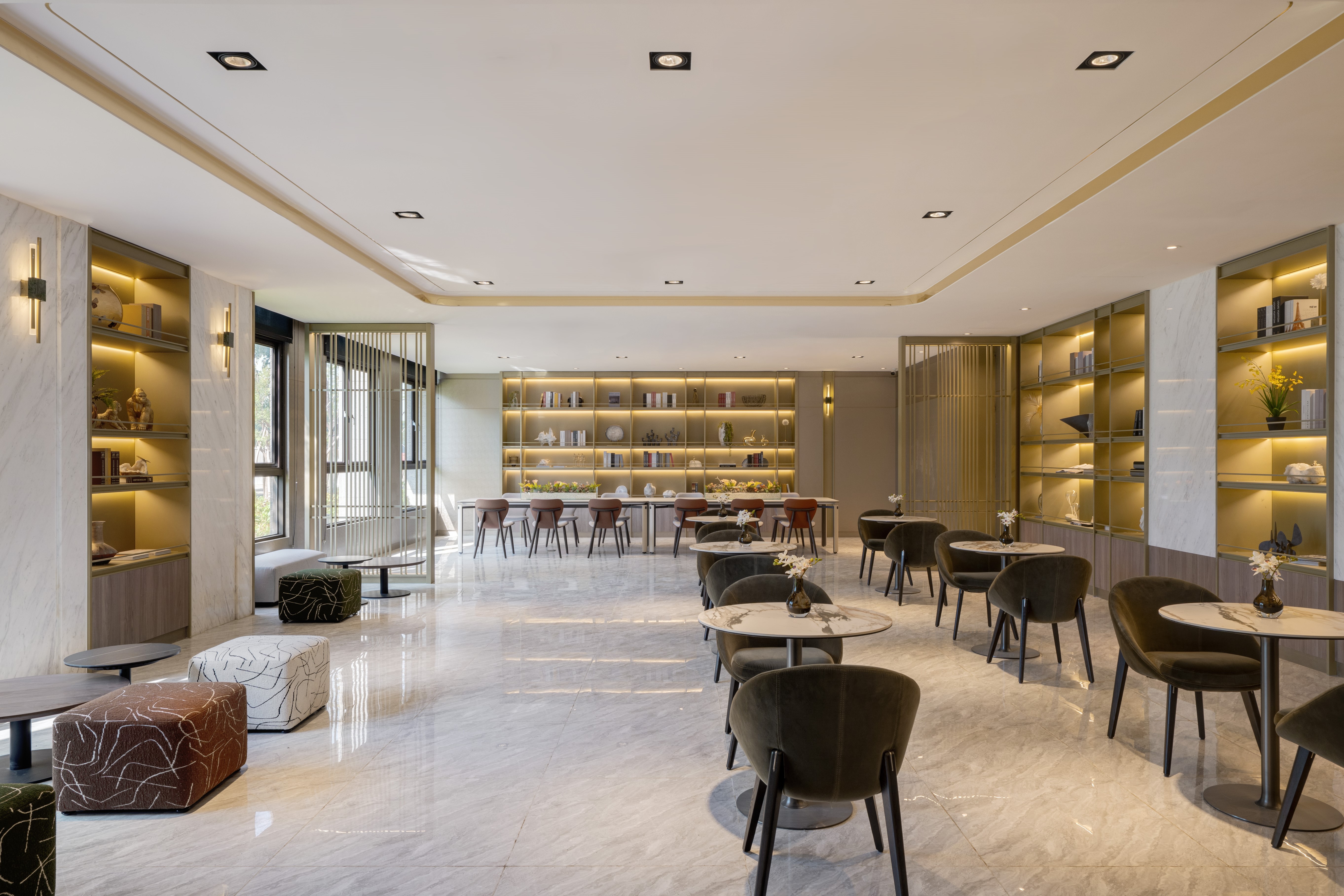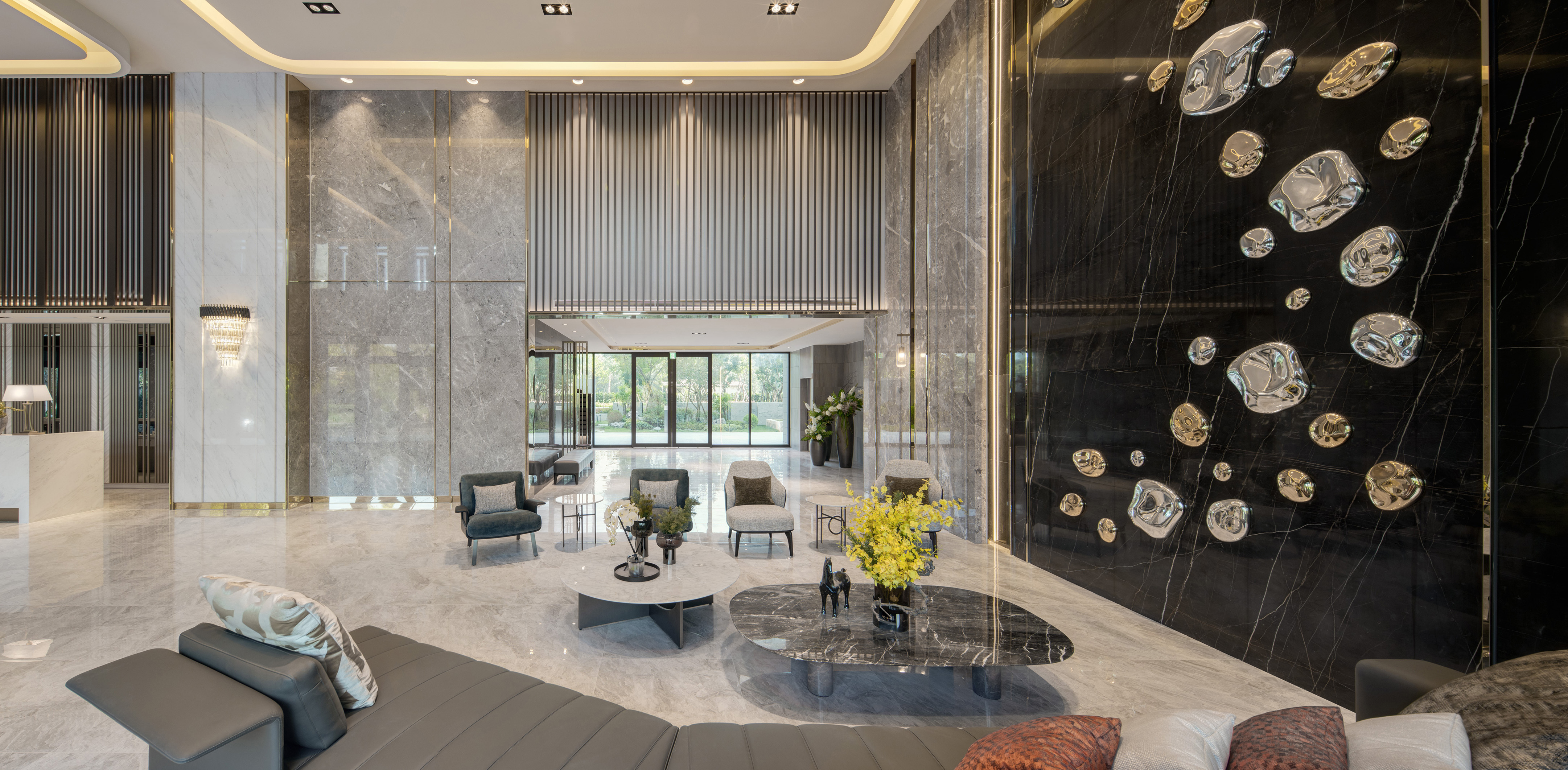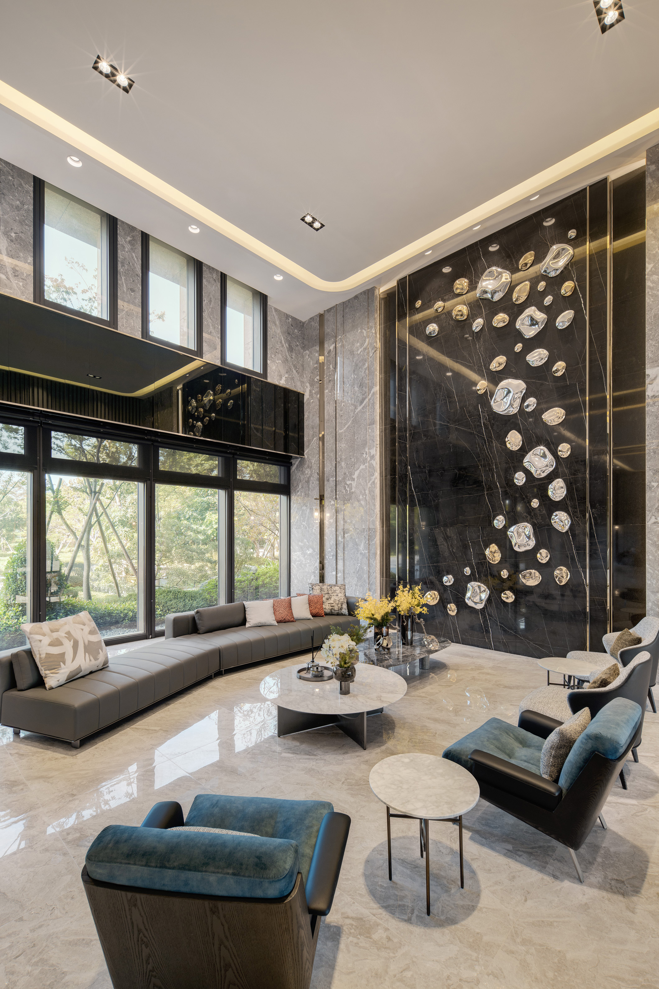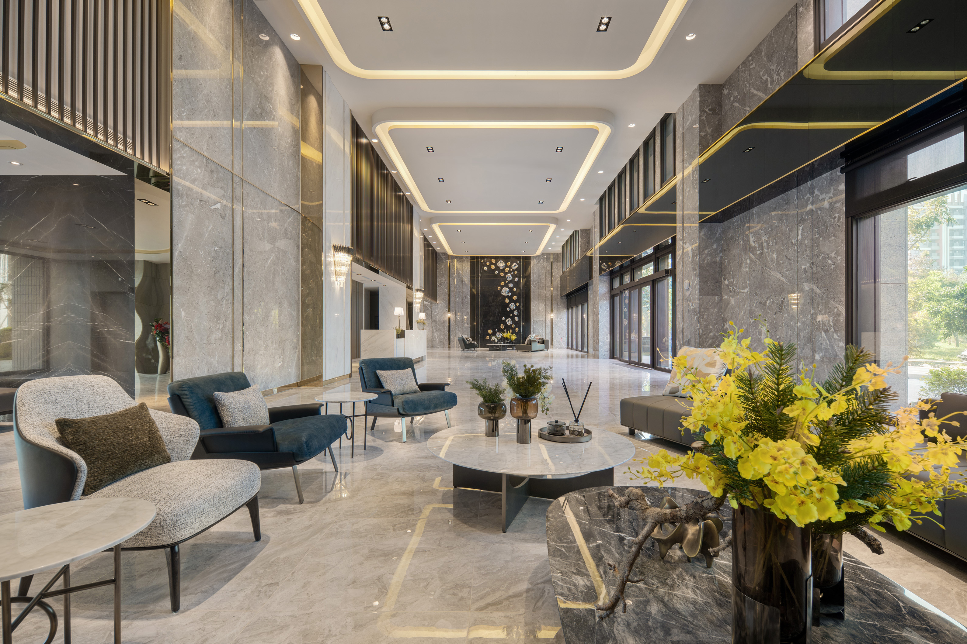 The design of this common area in the property development is centered around a captivating luxurious modern aesthetic. To begin with, the stone paving establishes a grand foundation, setting an elegant tone for the entire space. Moreover, the incorporation of black mirror and champagne gold metal accents adds a touch of opulence, creating an atmosphere reminiscent of a prestigious mansion. At the heart of this design lies a continuous motif of metal grilles, which seamlessly integrate across ceilings, facades, and screens. This deliberate choice not only enhances visual coherence but also reinforces a rhythmic pattern throughout the area. As one moves through the space, the interplay of light and shadow further enriches the experience, crafting an elegant flow that captivates the senses. Furthermore, the thoughtful combination of materials, clean lines, and strategically placed lighting merges harmoniously to transform the environment into a refined realm. Here, cool and warm tones gracefully intertwine, layered thoughtfully to define distinct visual dimensions that invite exploration and appreciation.