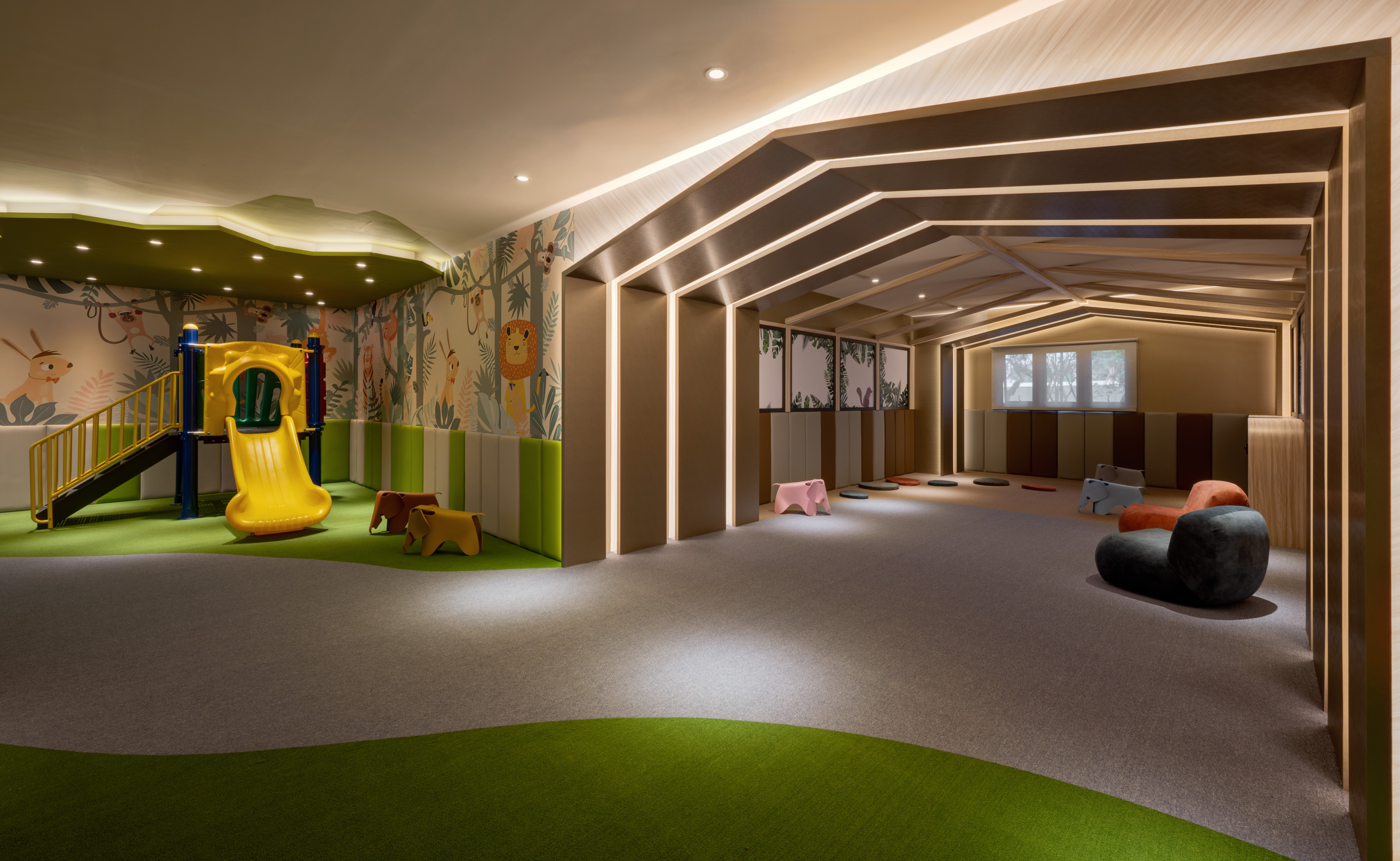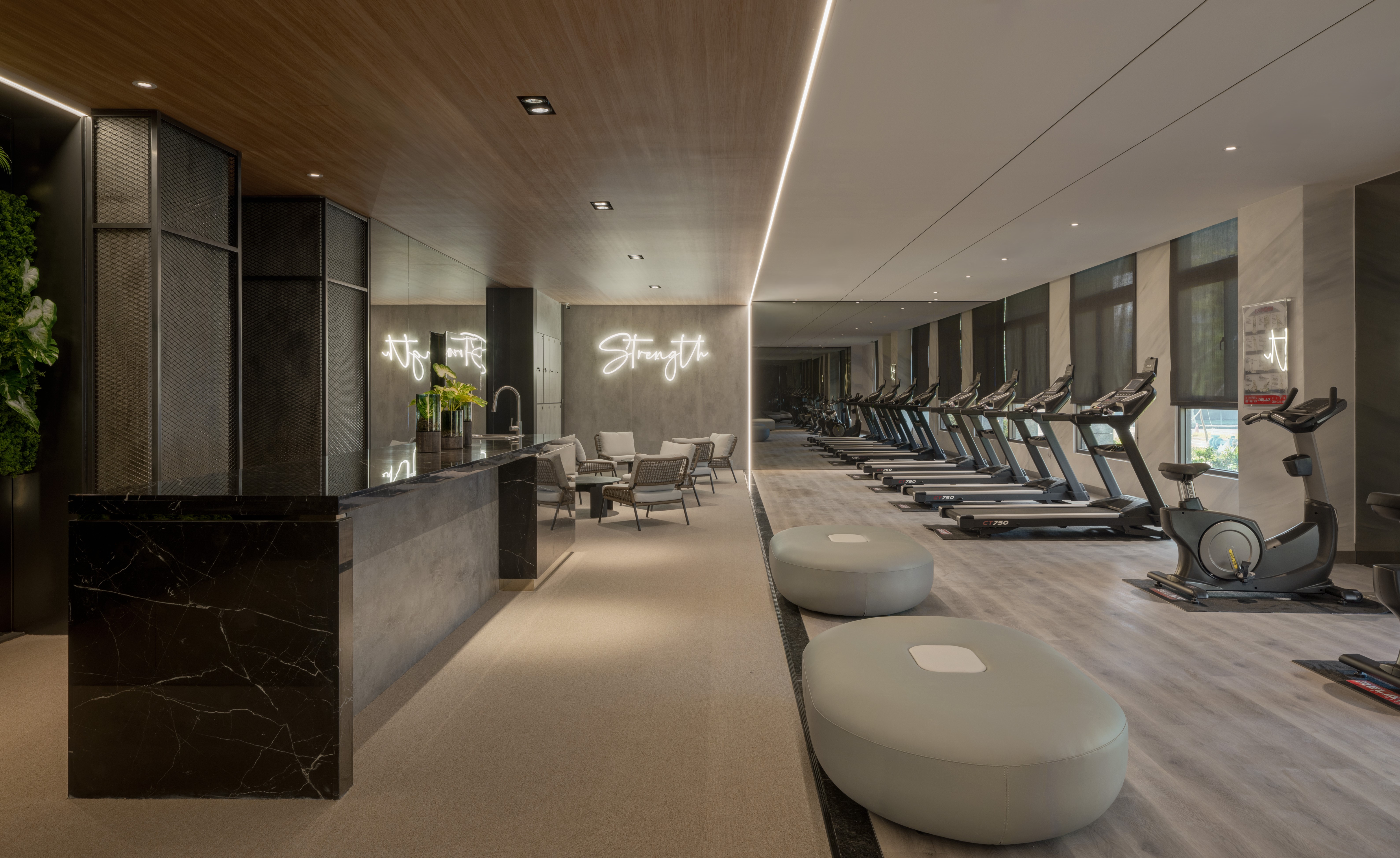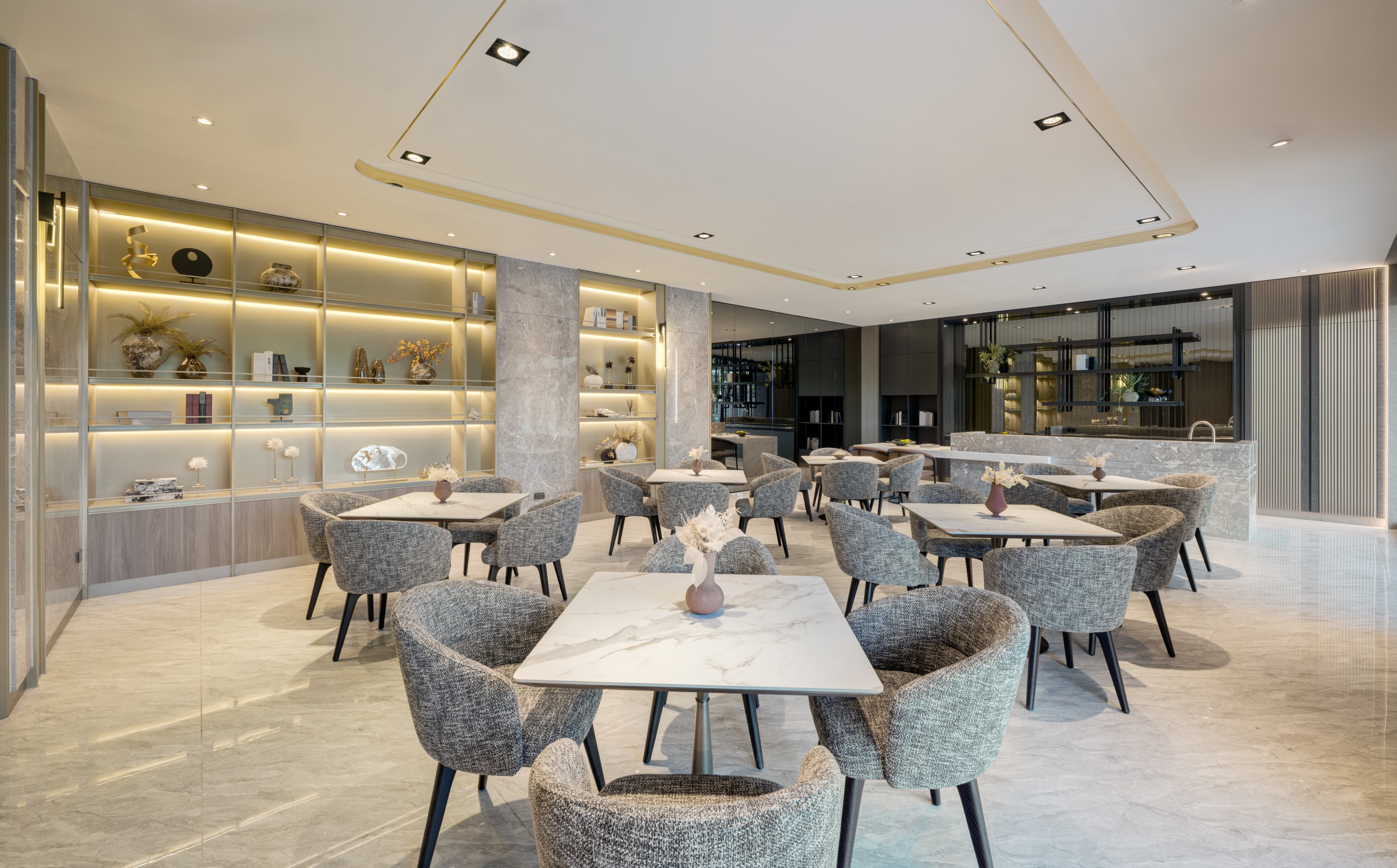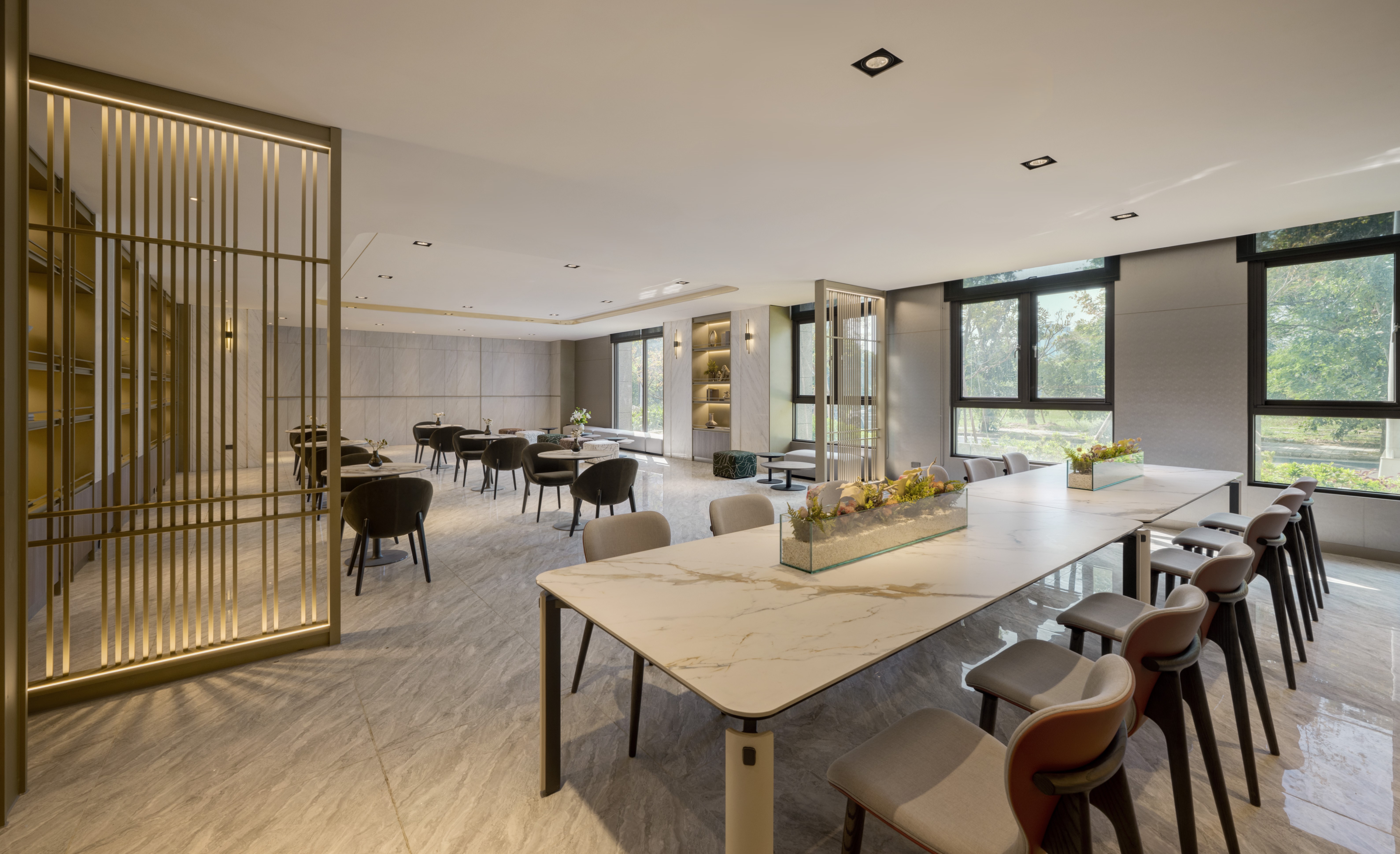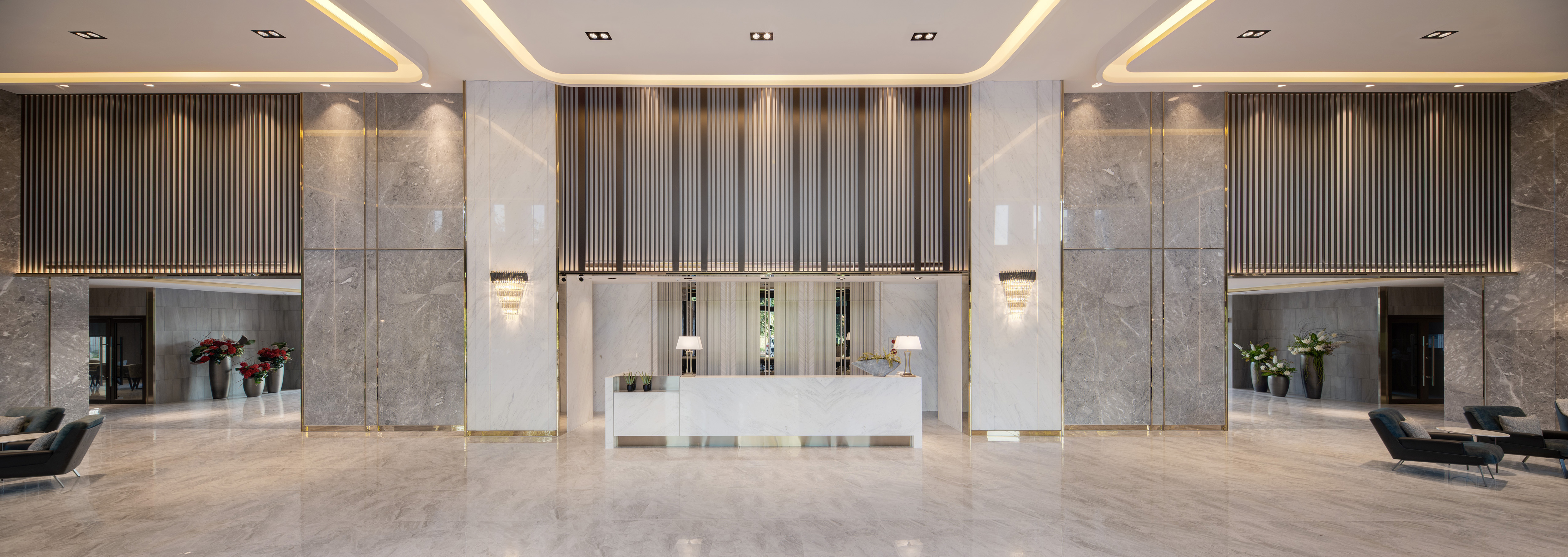 The design of this common area in the property development is centered around a captivating luxurious modern aesthetic. To begin with, the stone paving establishes a grand foundation, setting an elegant tone for the entire space. Moreover, the incorporation of black mirror and champagne gold metal accents adds a touch of opulence, creating an atmosphere reminiscent of a prestigious mansion. At the heart of this design lies a continuous motif of metal grilles, which seamlessly integrate across ceilings, facades, and screens. This deliberate choice not only enhances visual coherence but also reinforces a rhythmic pattern throughout the area. As one moves through the space, the interplay of light and shadow further enriches the experience, crafting an elegant flow that captivates the senses. Furthermore, the thoughtful combination of materials, clean lines, and strategically placed lighting merges harmoniously to transform the environment into a refined realm. Here, cool and warm tones gracefully intertwine, layered thoughtfully to define distinct visual dimensions that invite exploration and appreciation.