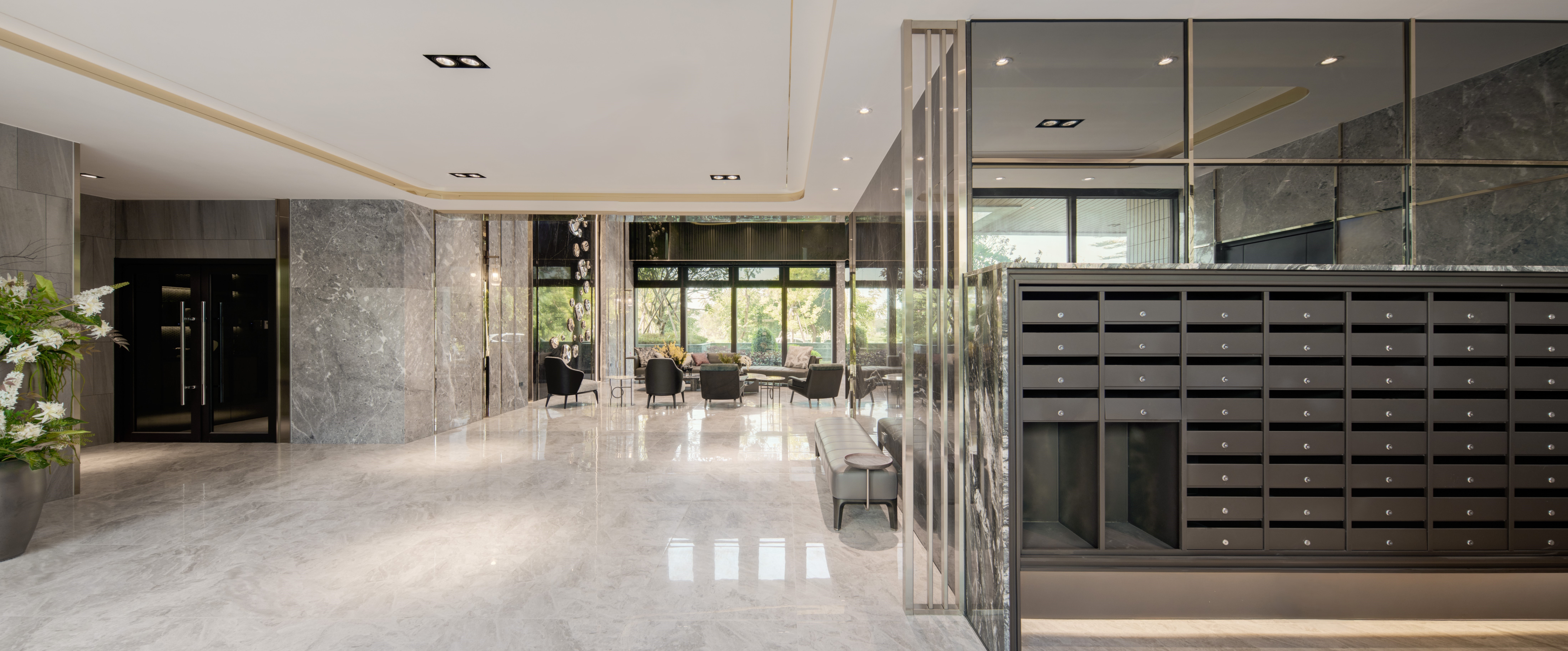 Moreover, the ceiling continues this elegant grille motif, further elevating the atmosphere and creating an expansive feel. An art wall, painted in a deep black, is tastefully embellished with gold and silver circular ornaments. These circular accents resemble jewels, artfully catching and reflecting light and shadow, thereby infusing the lobby with an aura of sophistication and refinement. Finally, the mailbox area showcases a thoughtful design, finished in dark stone and enhanced by black mirrors, exuding a dignified and welcoming style that leaves a lasting impression. Every element in this lobby has been carefully crafted to create an engaging and professional environment for all who enter.