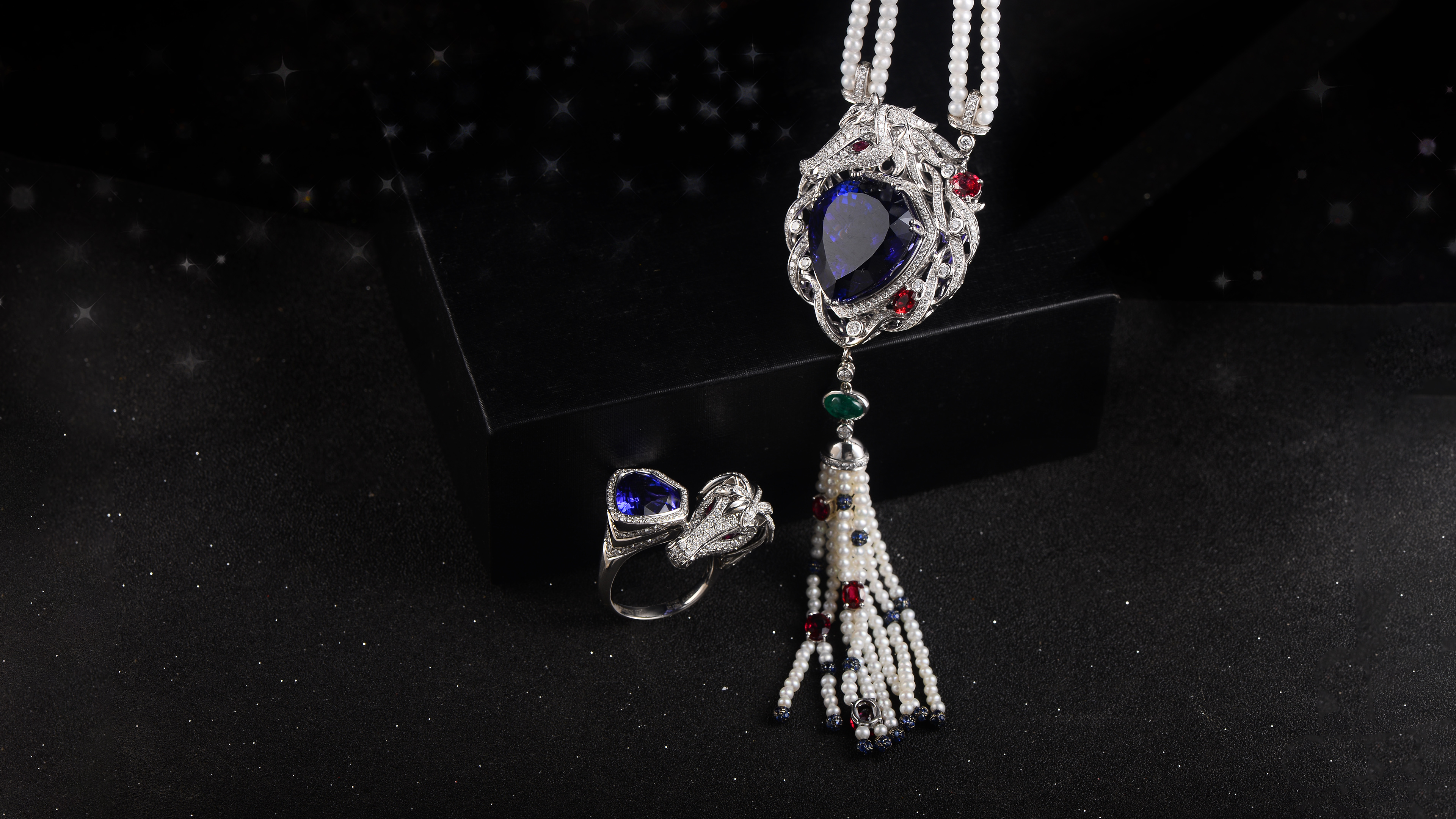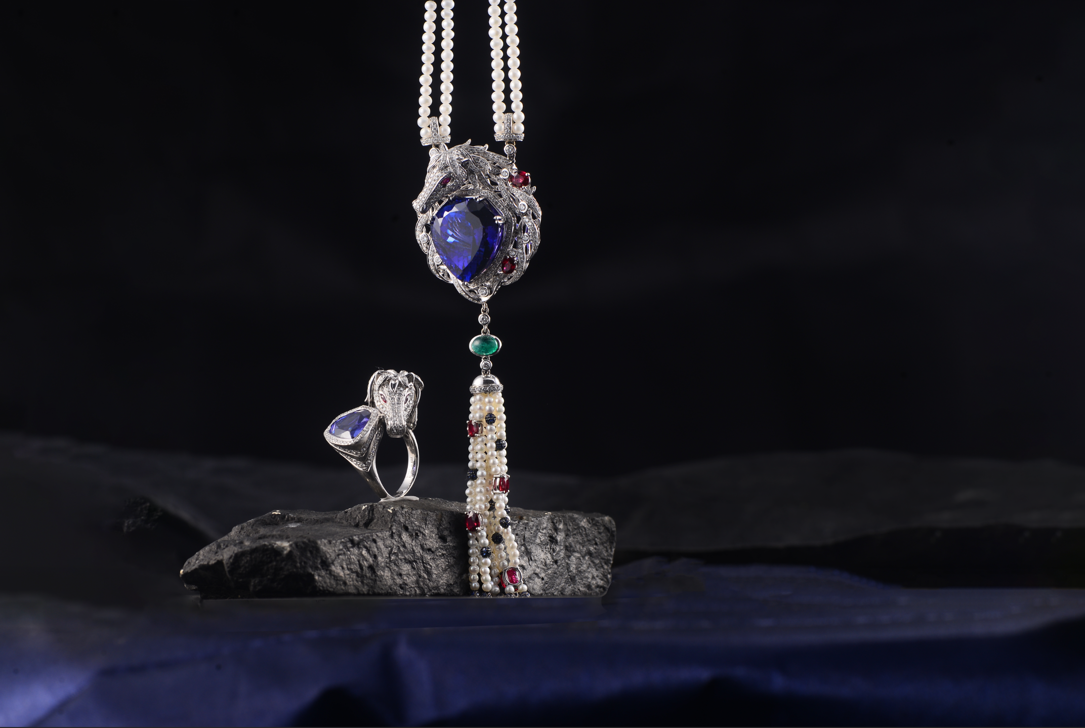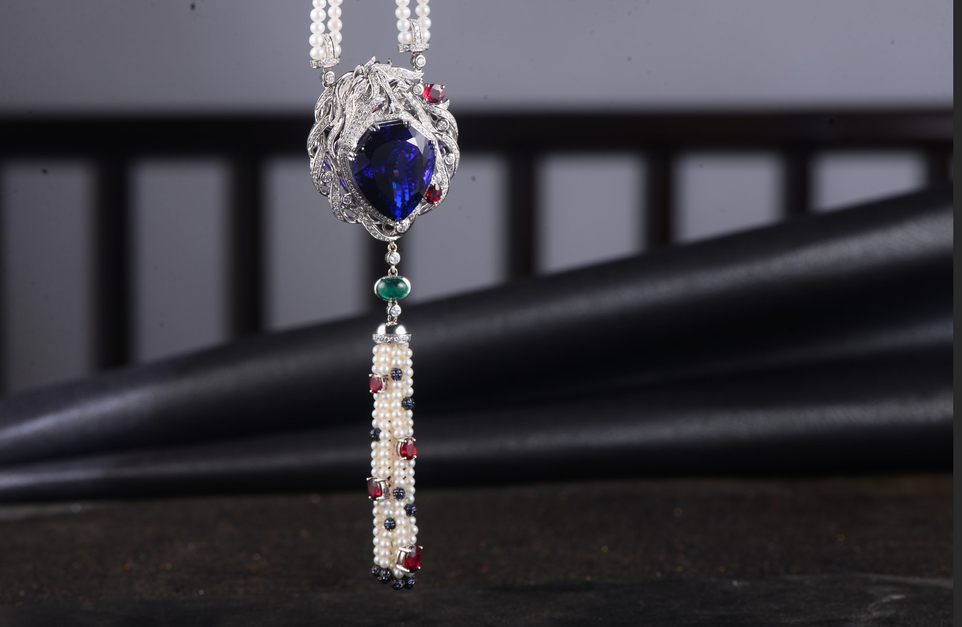 The necklace draws from the legendary romance of knights and princesses. Its design features a graceful white horse and a protective shield, symbolizing courage and guardianship in love. The central Tanzanite is complemented by red tourmaline, pearls, and diamonds set in white gold, transforming each gem into a testament of devotion and timeless affection. The fusion of precious materials and refined craftsmanship brings this narrative to life, where the horse signifies bold pursuit and the Tanzanite, framed by diamonds, becomes a steadfast guardian of love.