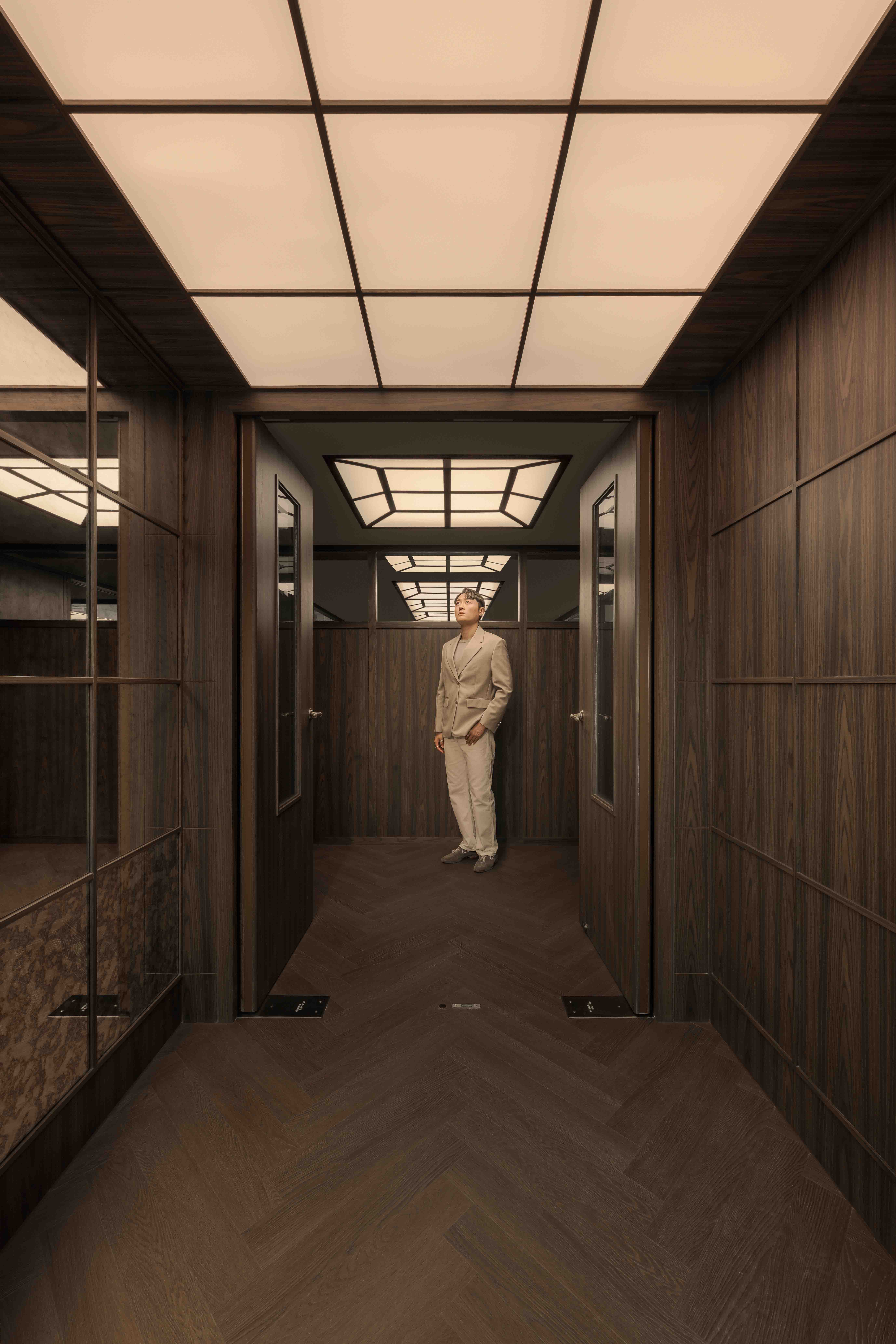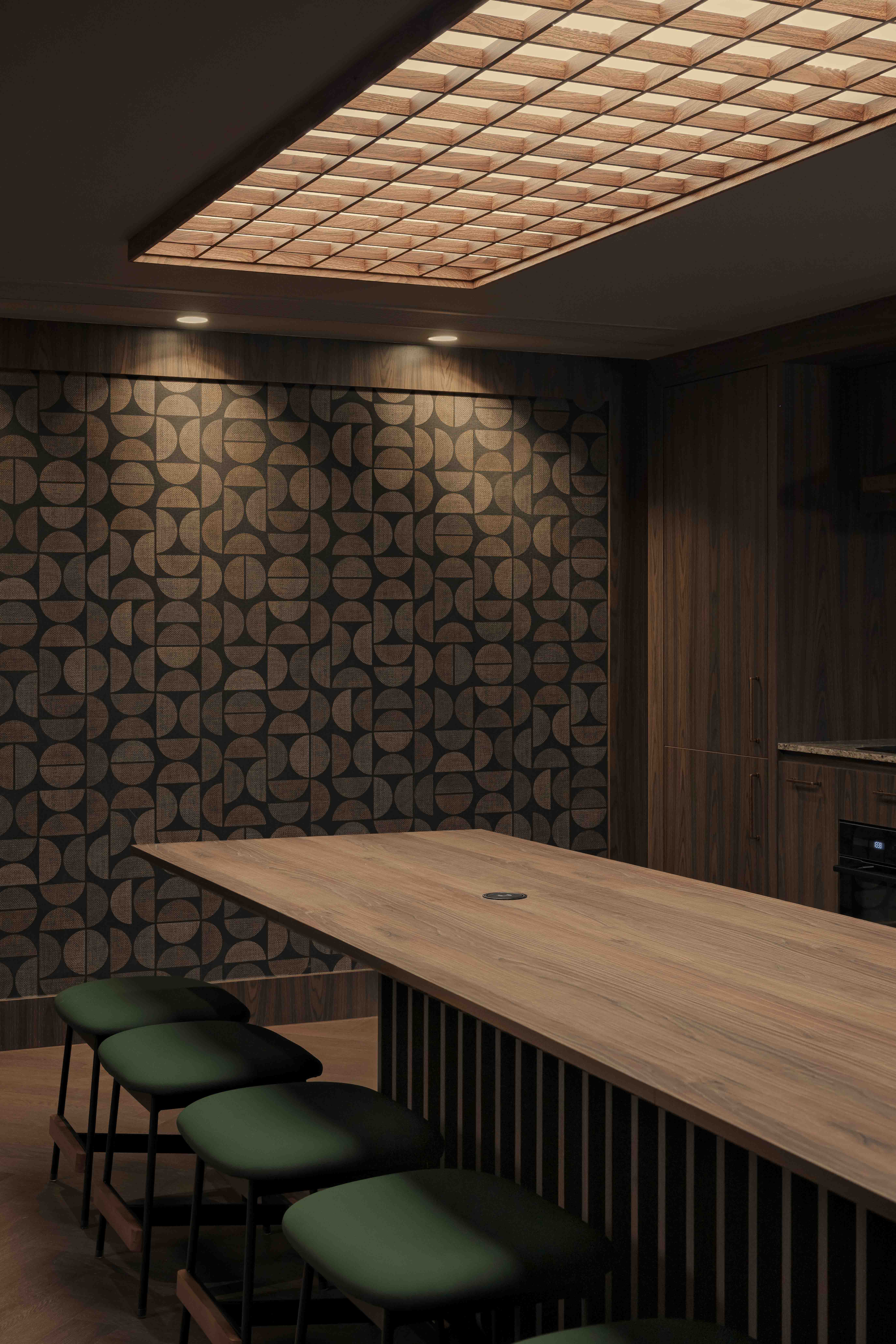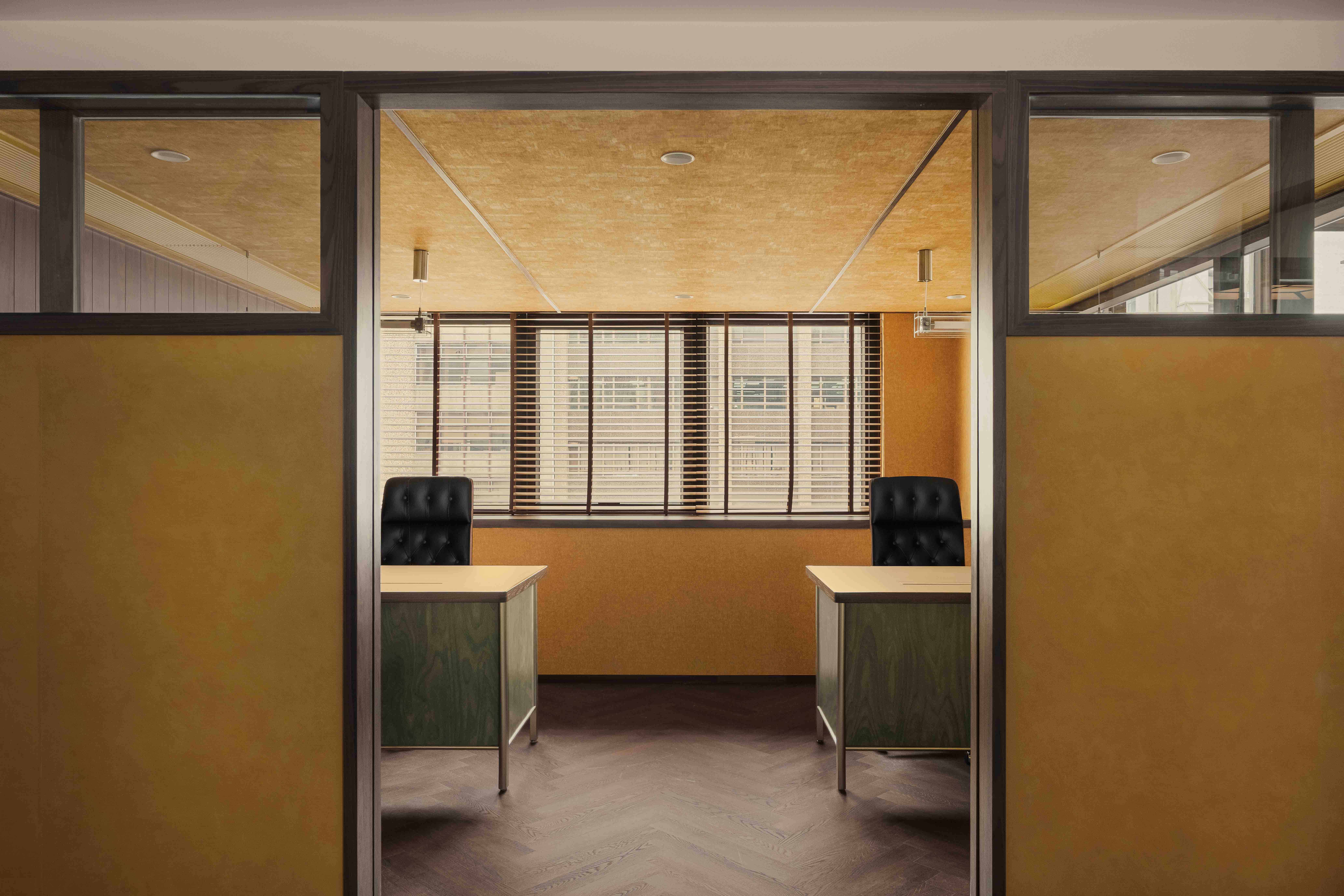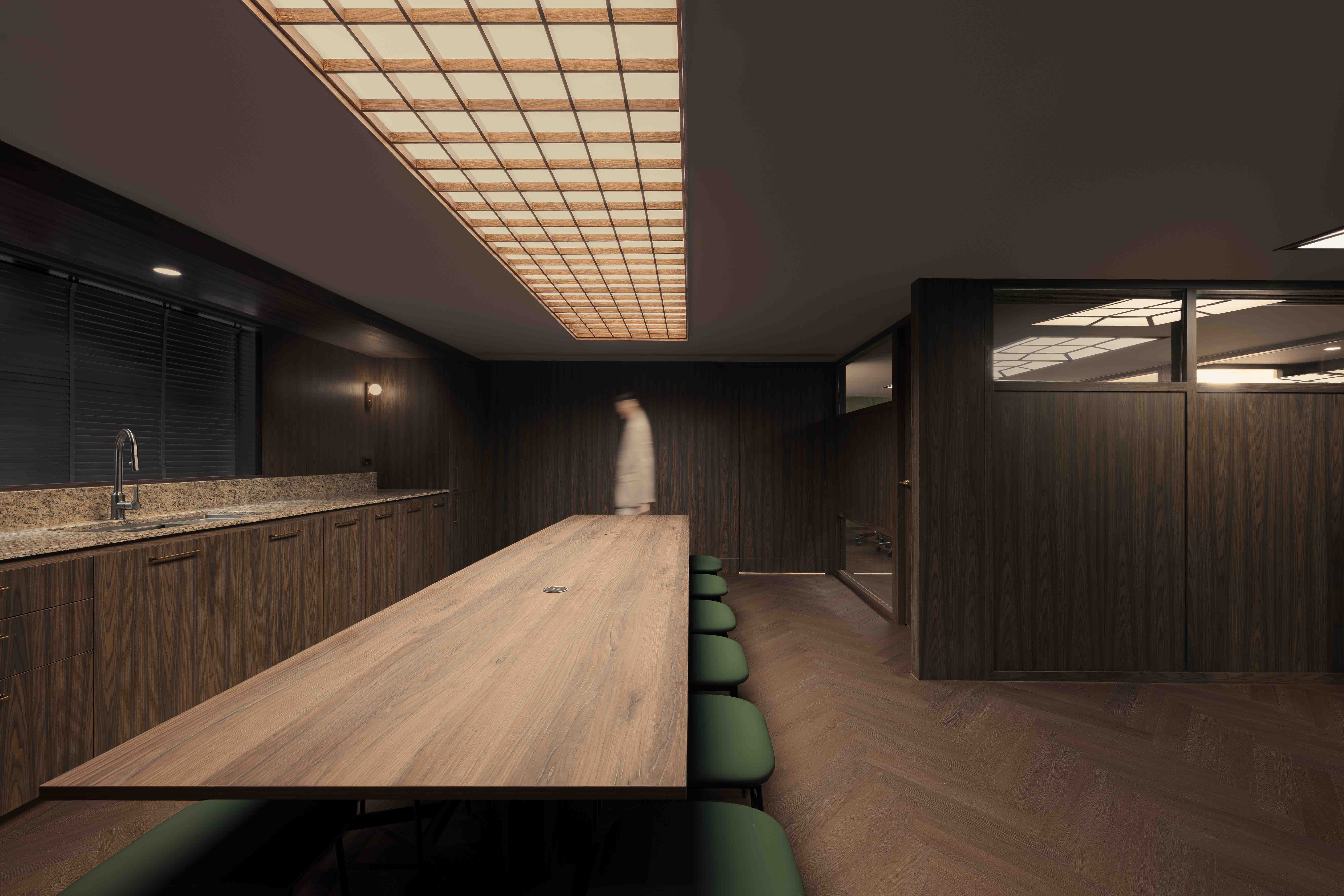 Our design direction began with a core idea: to reinterpret the aesthetic language of the 70s through a modern lens, producing an environment that feels rooted, timeless, and relevant. The entrance, common area, and meeting rooms adopt a mid‑century foundation—warm wood tones, geometric ceiling lighting, bespoke furniture, and patterned surfaces reminiscent of the cultural textures of old Hong Kong. These elements are carefully layered to tell a story of continuity: from the city’s design history, to the building’s original character, to the creative identity of Pen & Paper.