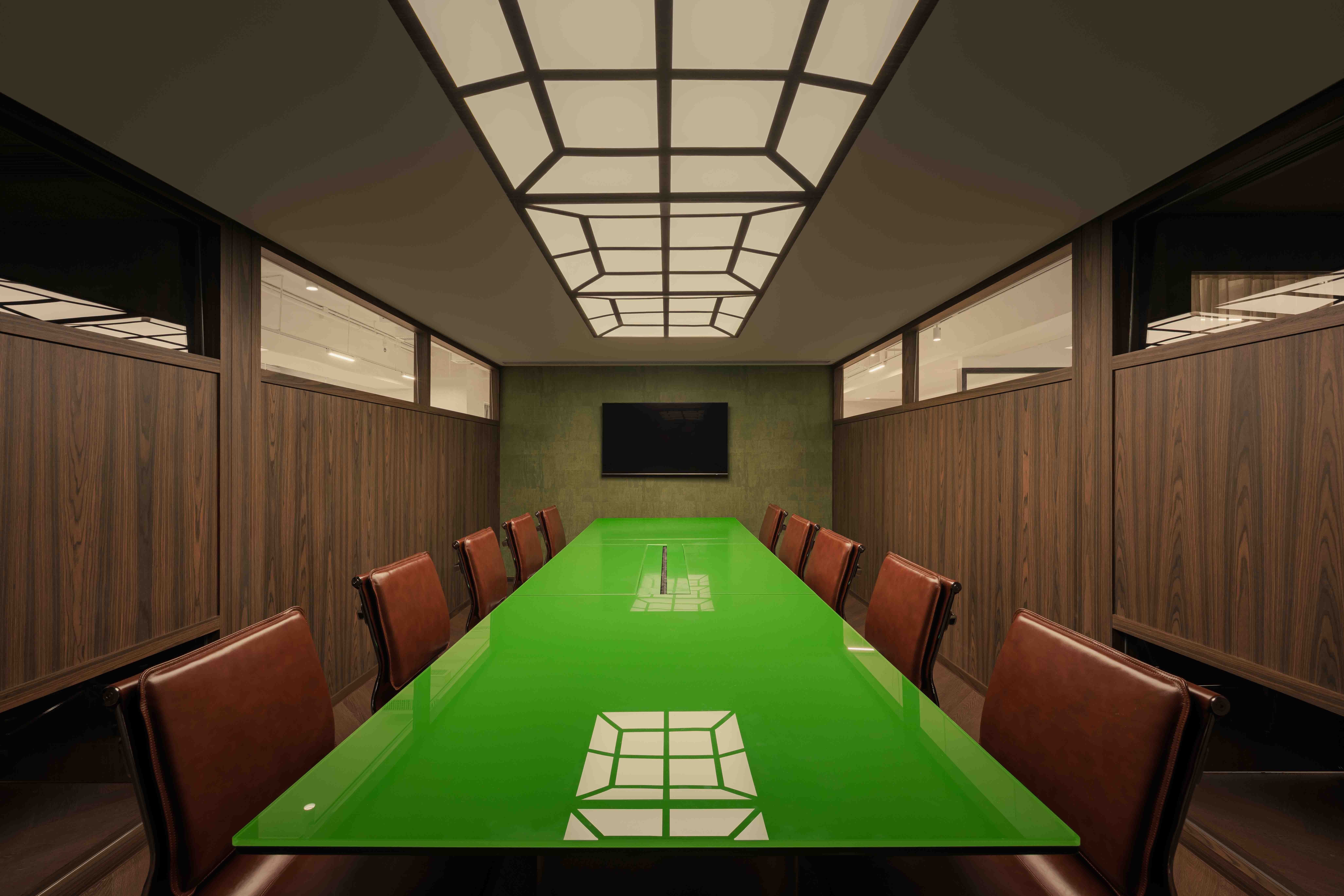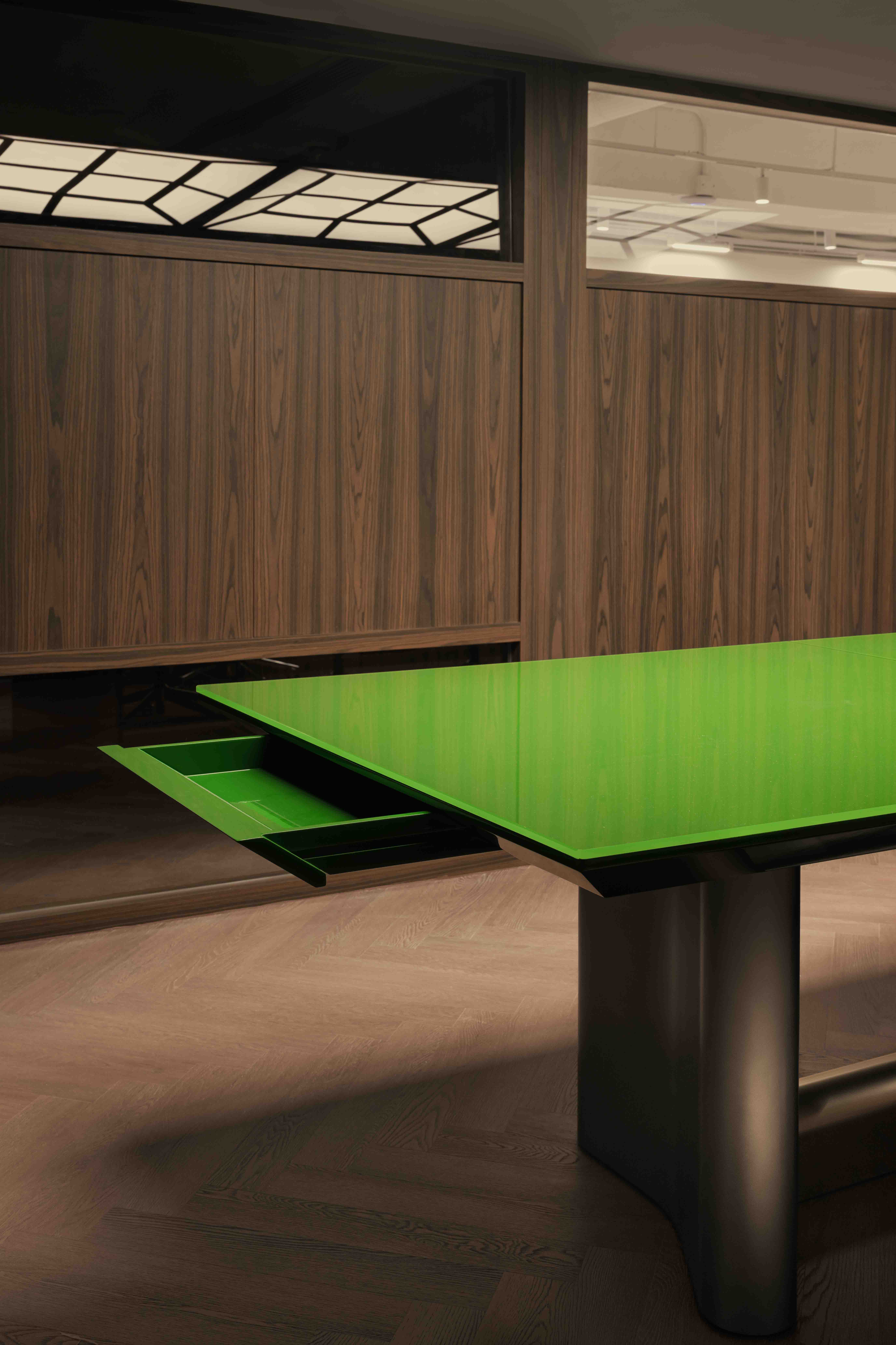 At the heart of the space is a fully bespoke approach. Every loose piece of furniture and every lighting element was designed specifically for this project. The meeting table, crafted with a bold surface and paired with a custom ceiling grid light, becomes a focal point that communicates confidence and taste. The lighting strategy is central to the experience; soft reflections, diffused warmth, and controlled highlights create a cinematic atmosphere that echoes the production company’s visual sensibility.