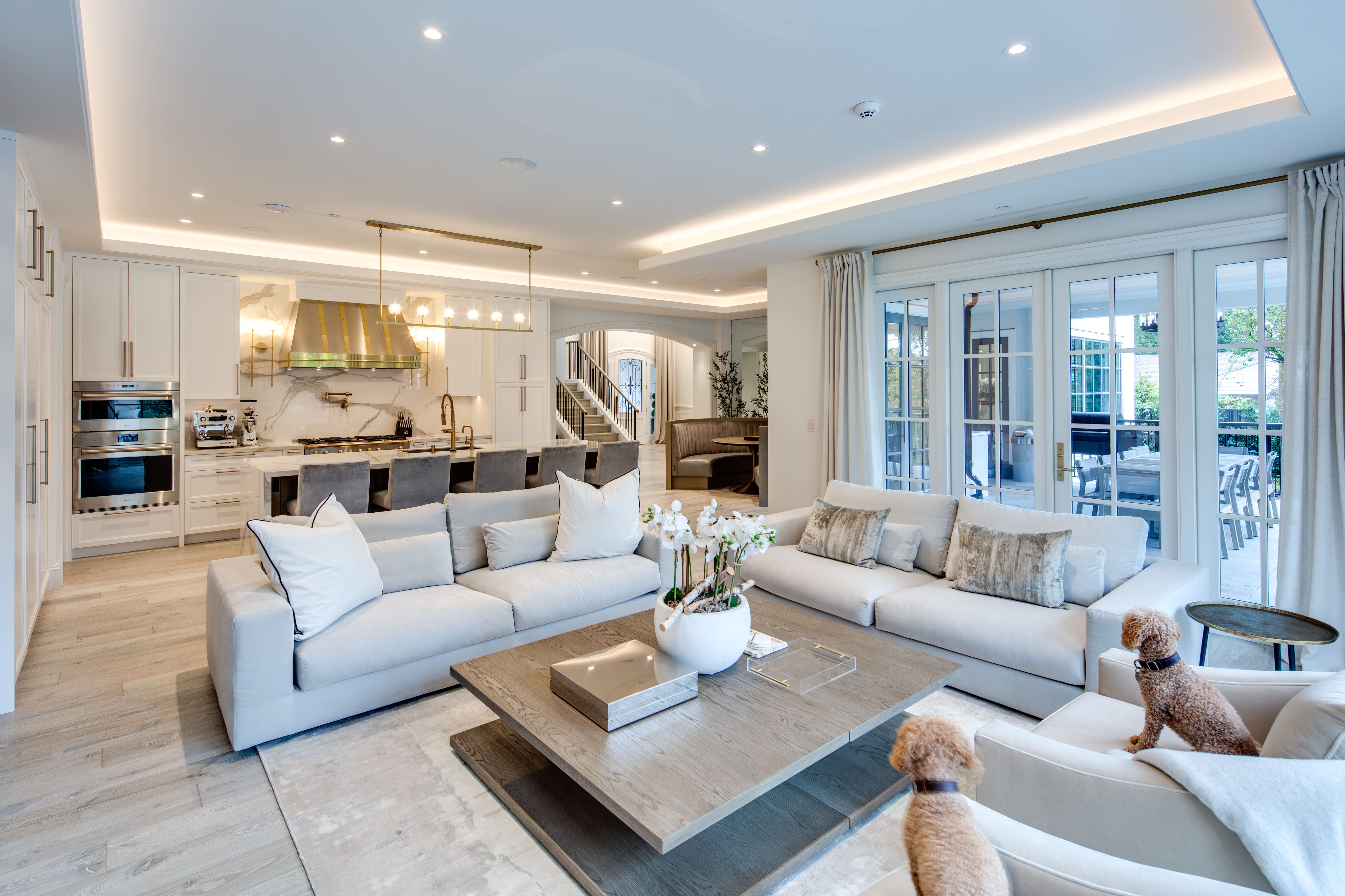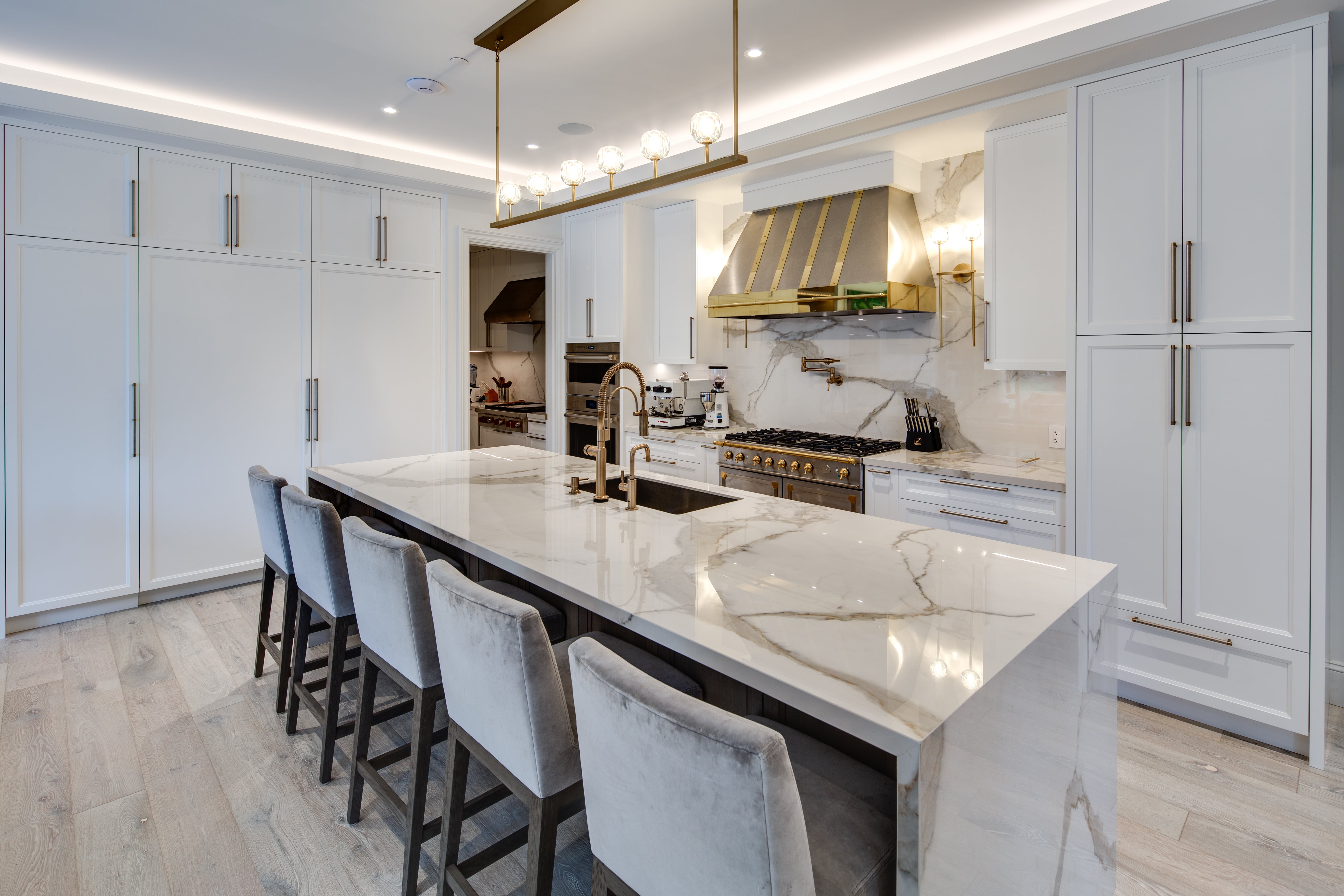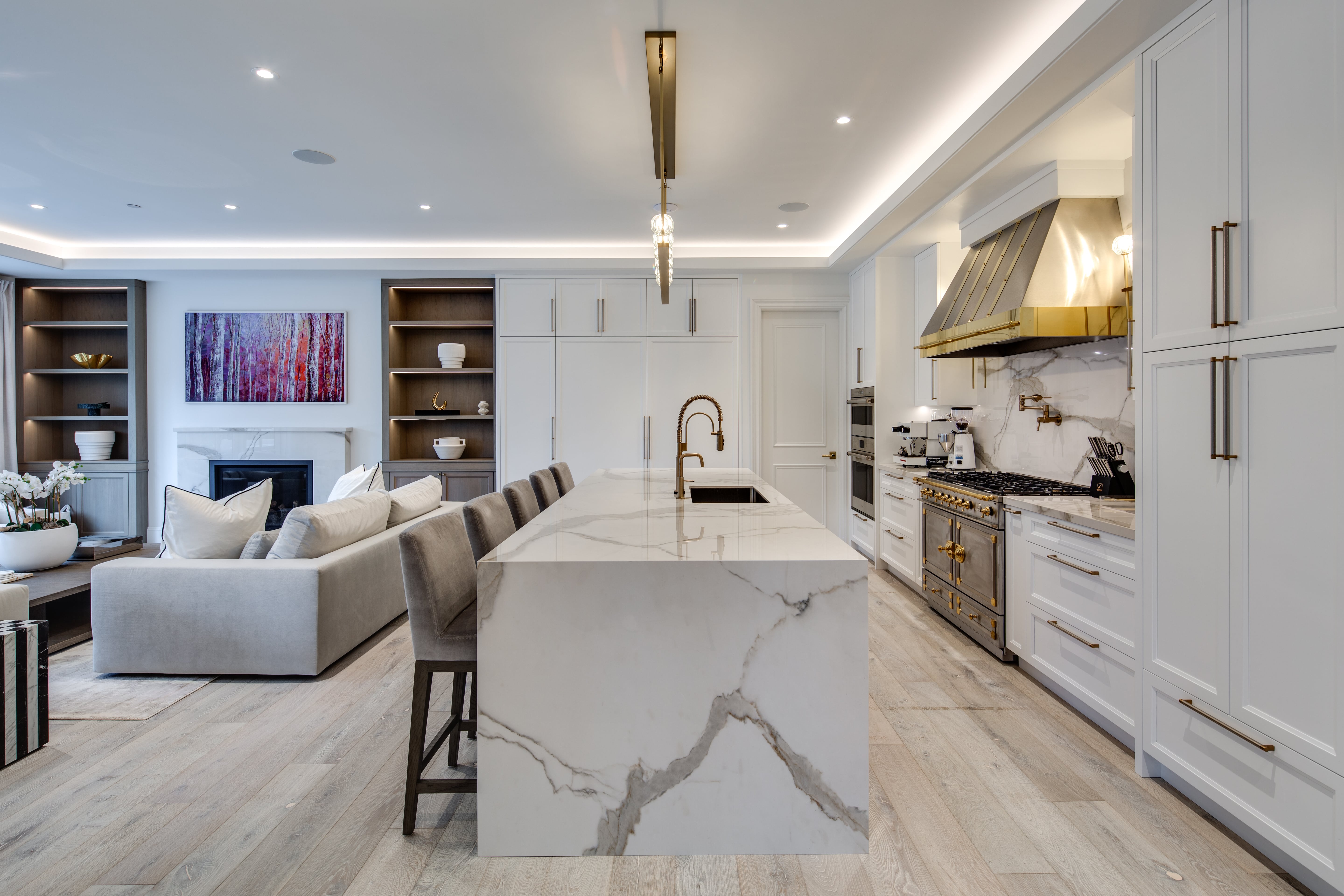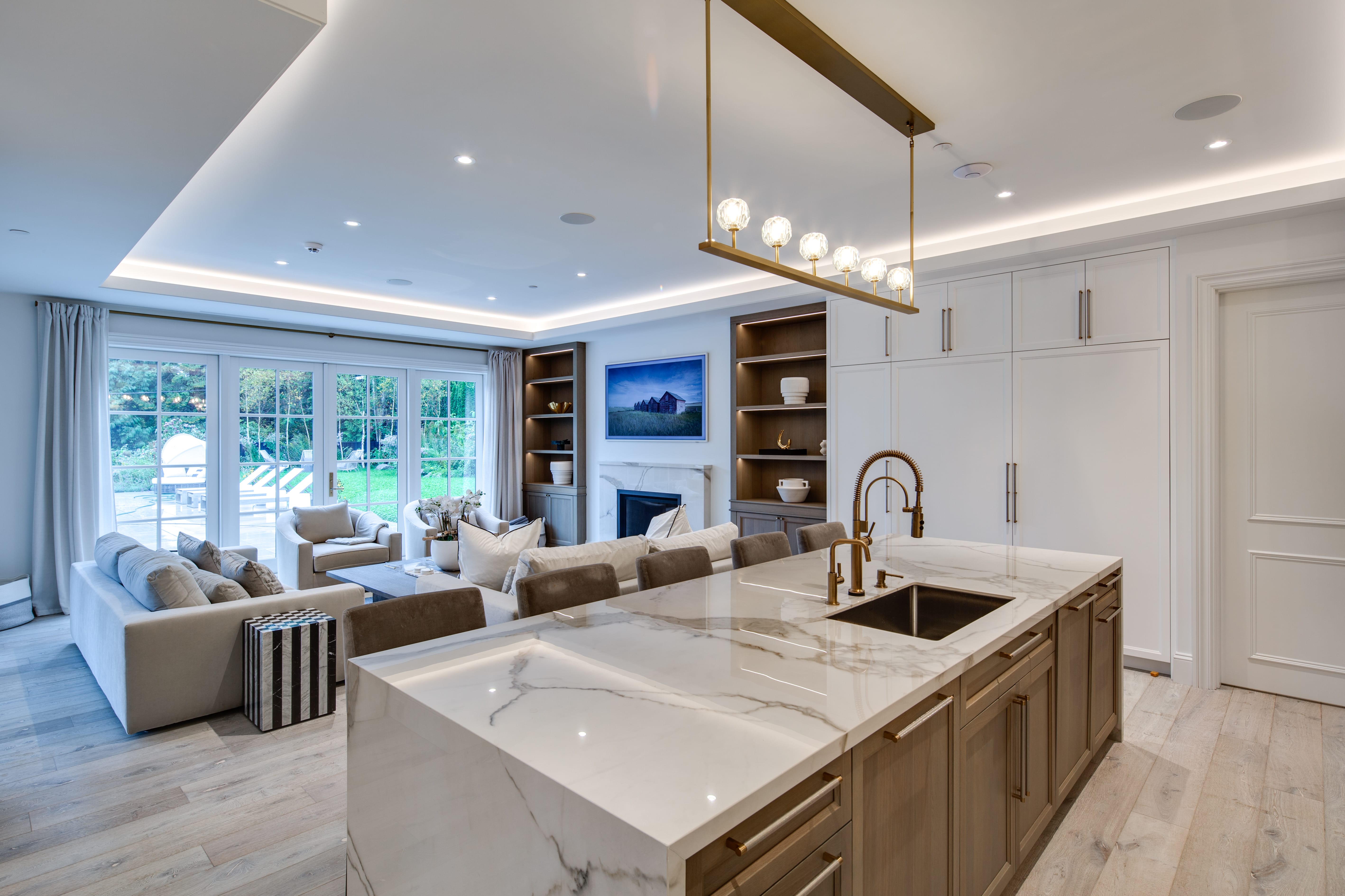 Materiality was chosen to elevate both luxury and livability. Custom oak cabinetry offers warmth and refinement, while honed marble countertops provide durability and timeless elegance. State-of-the-art appliances were fully integrated to preserve the kitchen’s serene, monochromatic palette, allowing the design to remain visually quiet yet highly functional. A handcrafted dining table adds a layer of intimacy, anchoring family meals and holiday celebrations. The temperature-controlled wine cellar, subtly embedded into the millwork, brings an element of sophistication without disrupting the room’s calm aesthetic.