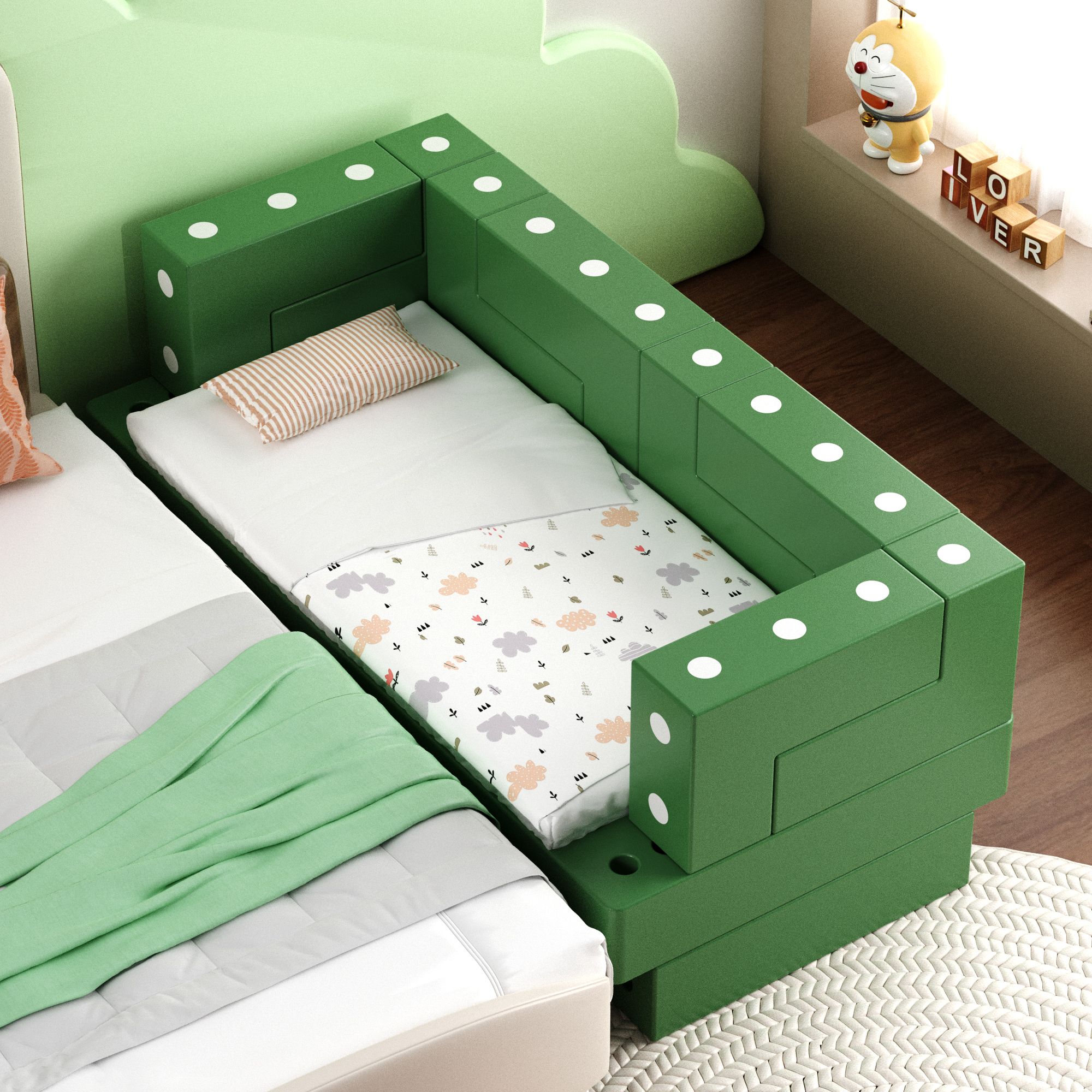 This bed utilizes a pure, rounded form without sharp edges to ensure children's safety, complemented by bright color palettes to stimulate children's color recognition. It comes with special treatment that enables doodles and marks to be effortlessly removed with a simple wipe, allowing it to maintain a clean and attractive appearance even after prolonged use. This enables the product to be circulated and exchanged among households, especially ideal for multi-child families.