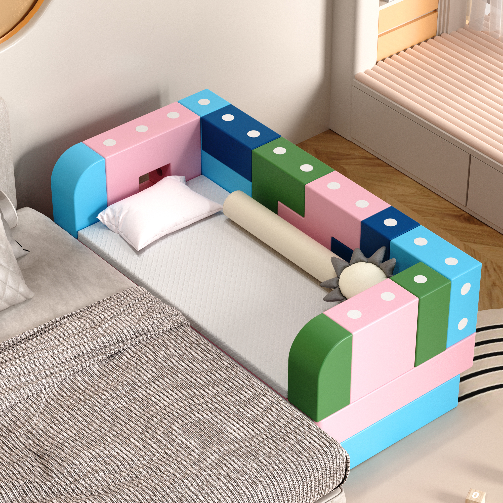The Kuai Kuai Bed is a modular children's furniture system centered around "free creation", transcending the limitations of traditional children's beds with fixed forms and short usage cycles. It enables flexible combinations to function as a standalone bed for infants and children, or to pair with an adult bed as an extended sleep solution, seamlessly adapting to evolving needs from early childhood to adulthood. Beyond sleeping use, it can also be easily transformed into a sofa, pet house, or training space, offering versatile utility.