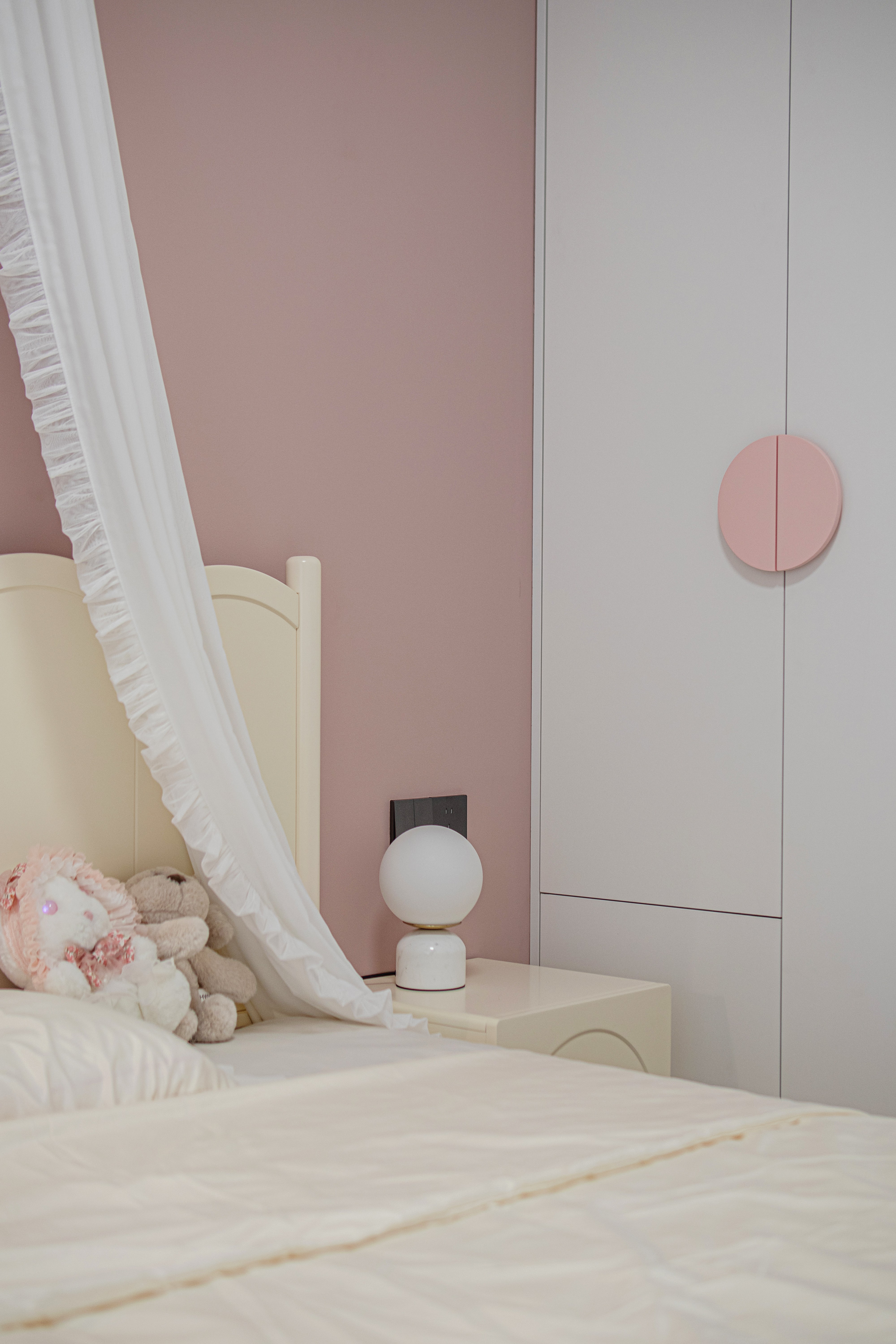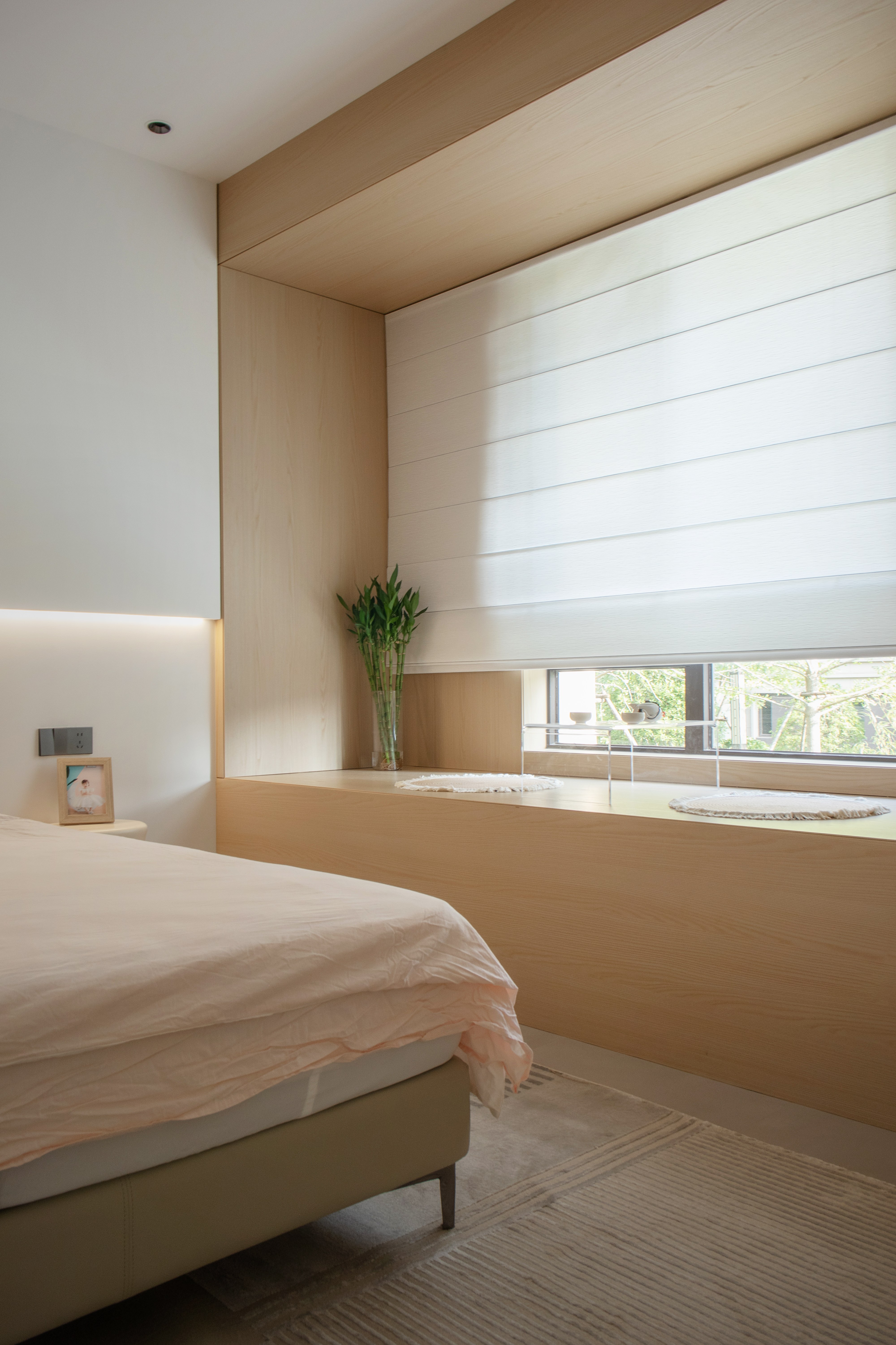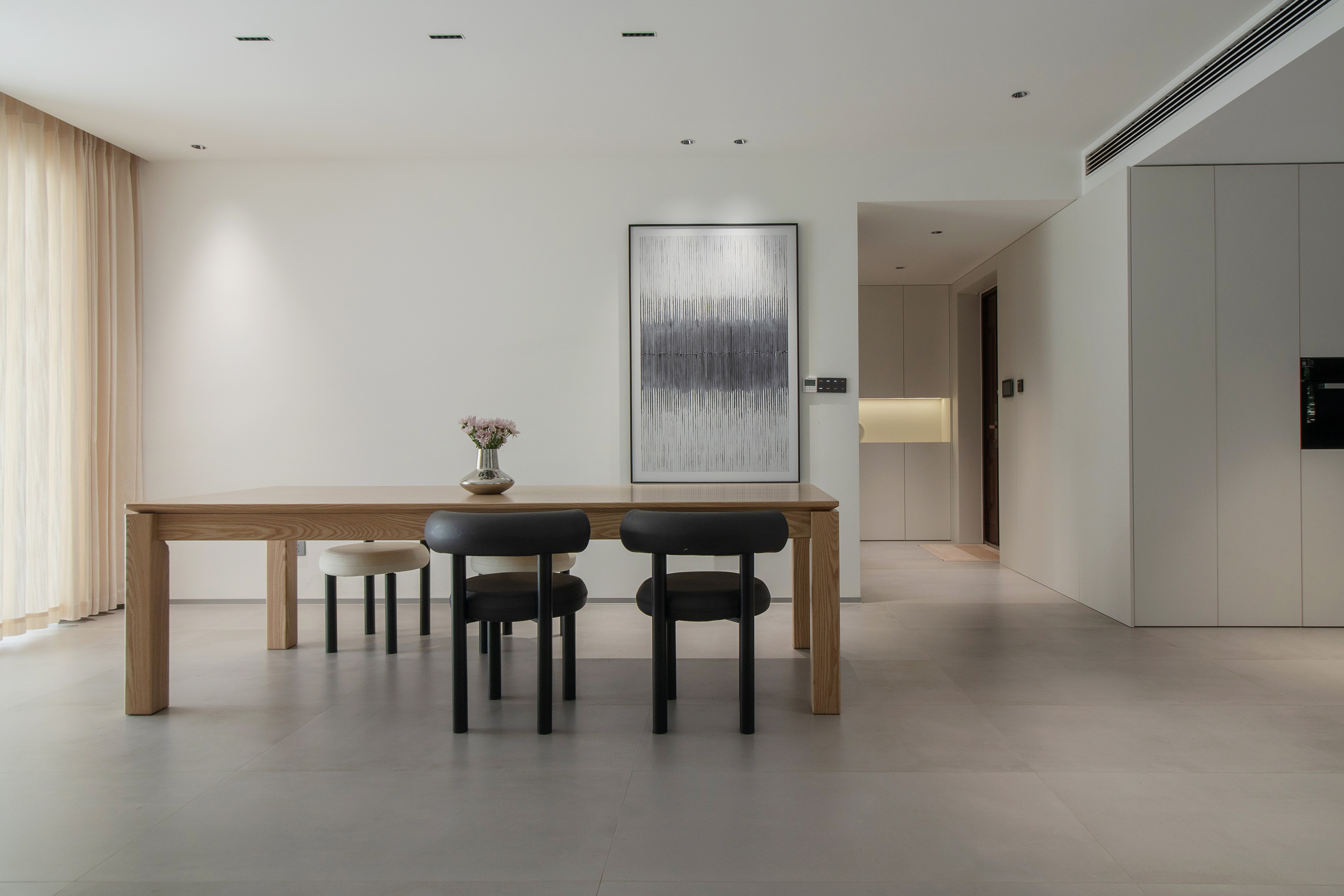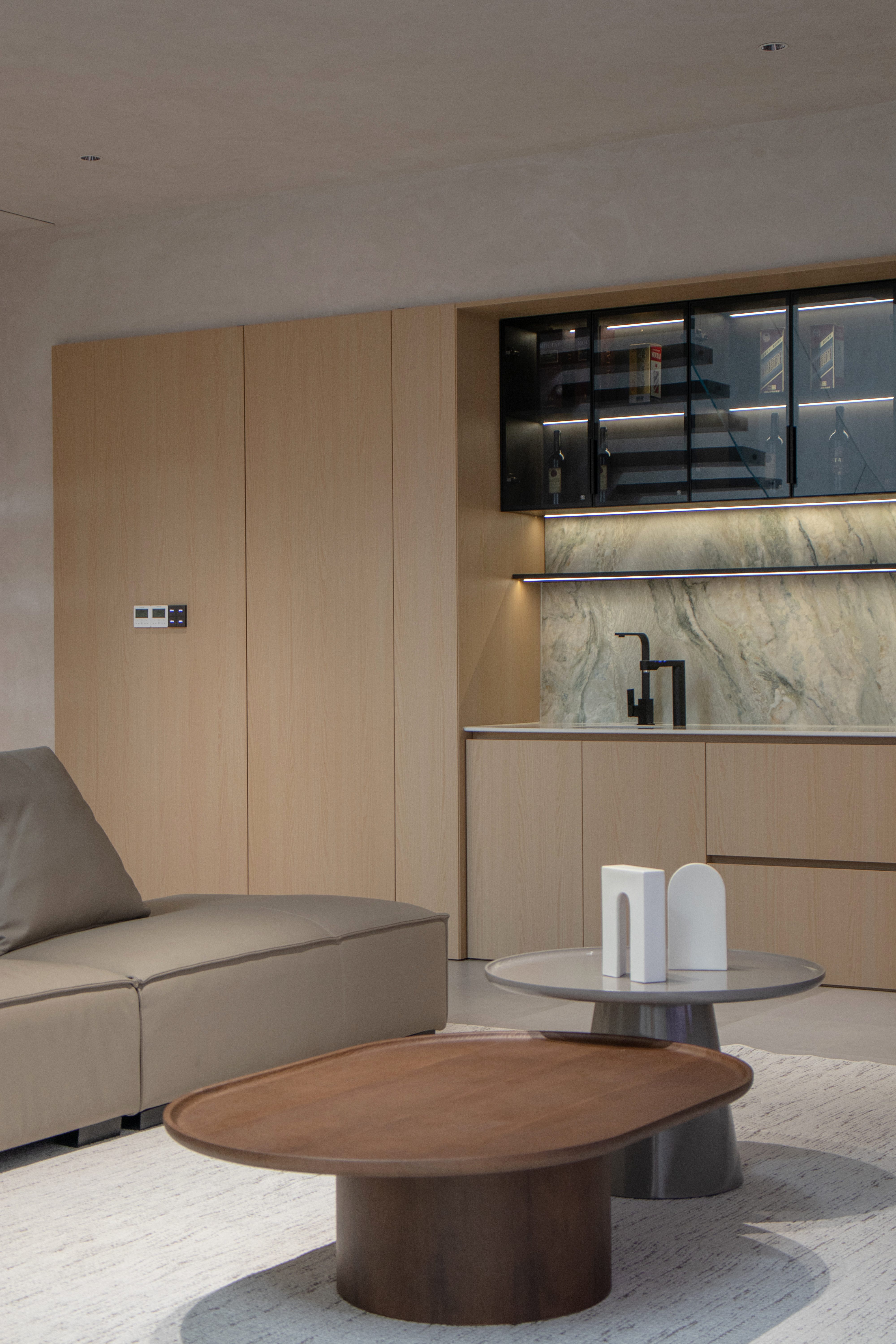 As the heart of domestic life, the living area is redefined by the insertion of a floating staircase, which disrupts the static horizontality of conventional layouts. More than a vertical connector, the staircase becomes a sculpture of light: each tread integrates linear LED strips that cast a gradient sequence of shadows onto the wall, evoking the rhythm of time’s passage and inviting occupants to embark on a gentle “journey through time” with every ascent or descent. A large-scale art installation on the backdrop wall responds to these shifting light patterns through gradations of gray, creating a dynamic interplay of solid and void with the staircase. To the right, floor-to-ceiling wooden cabinetry discreetly conceals storage, preserving a clean façade while extending the narrative of material continuity.