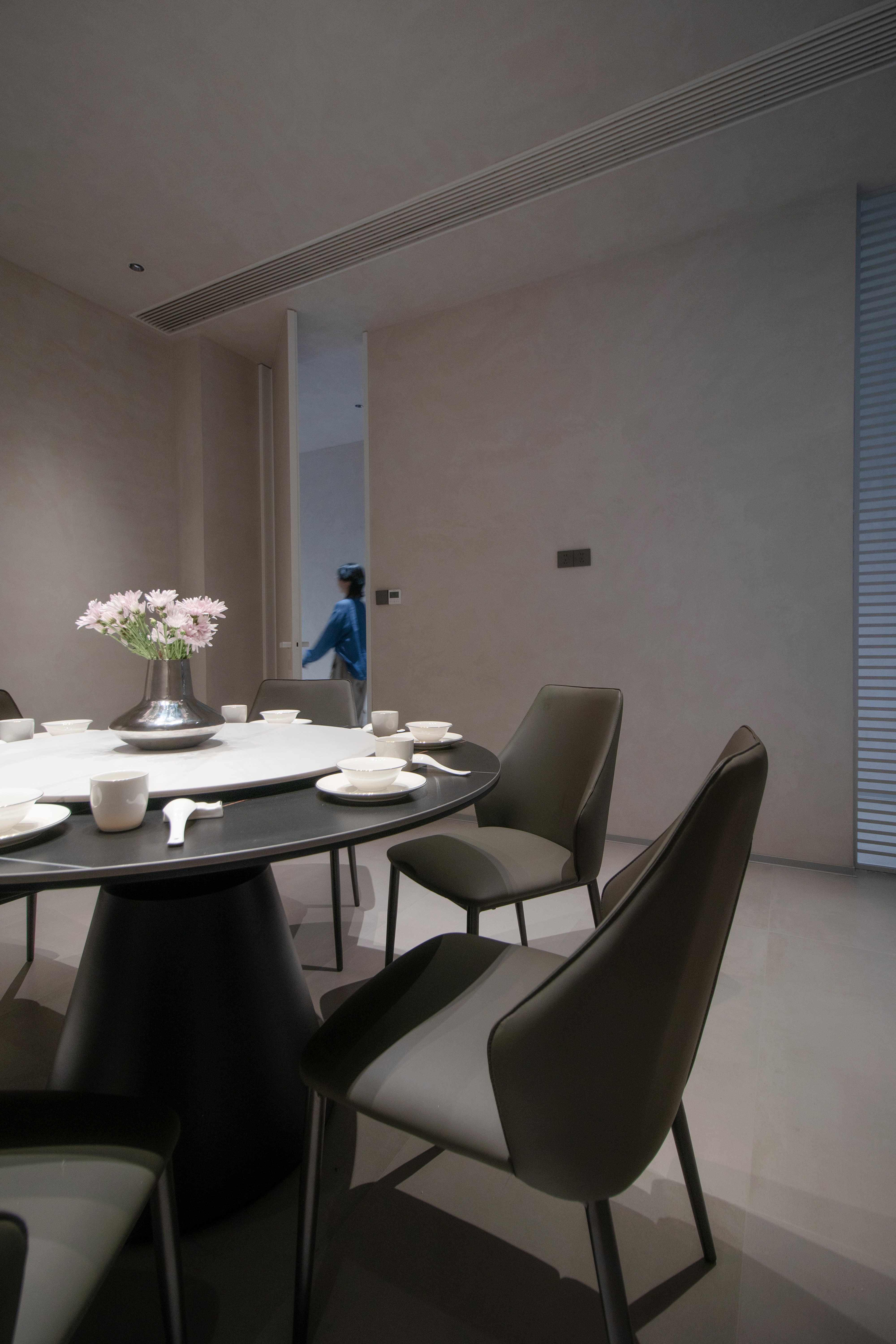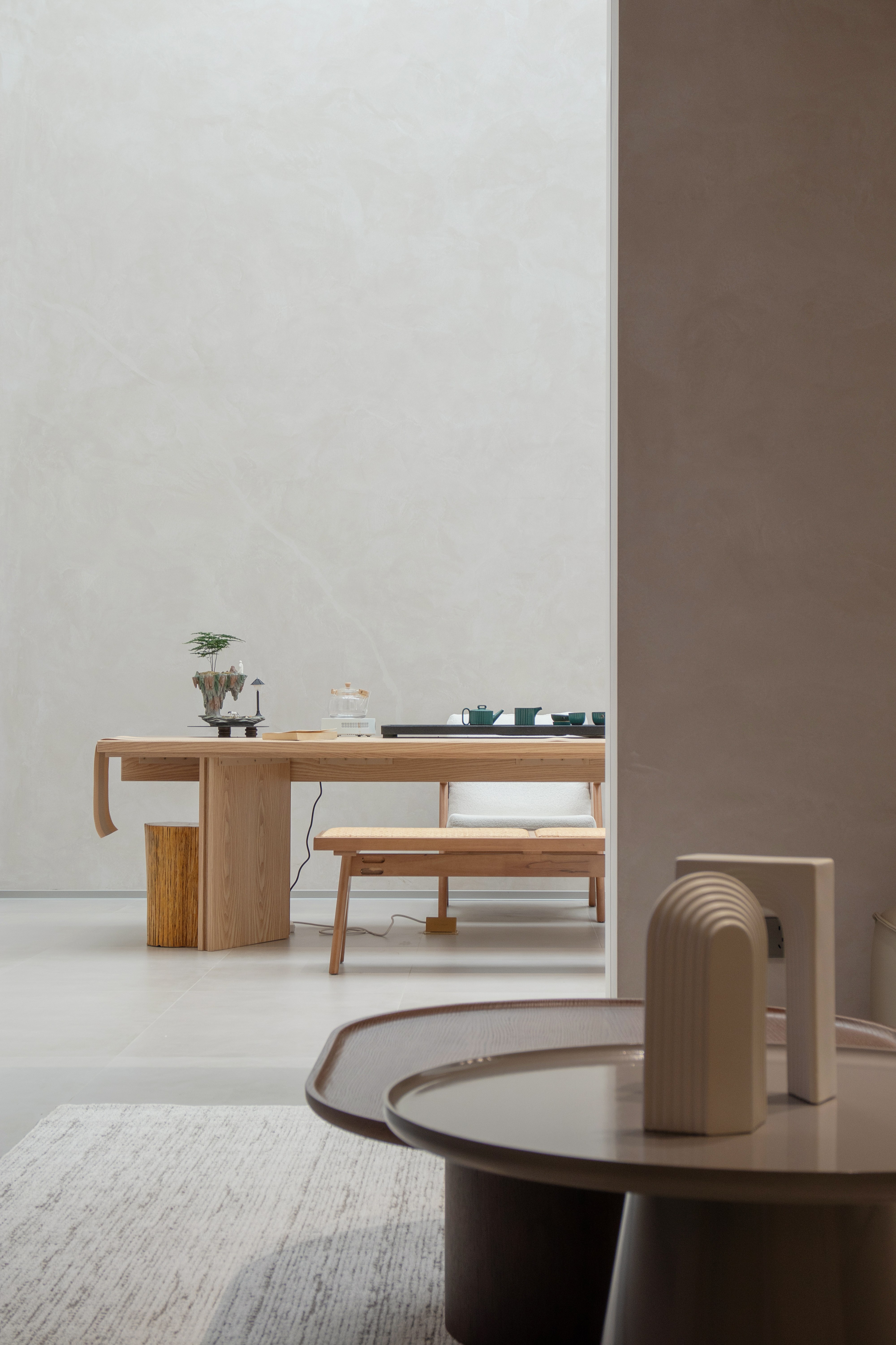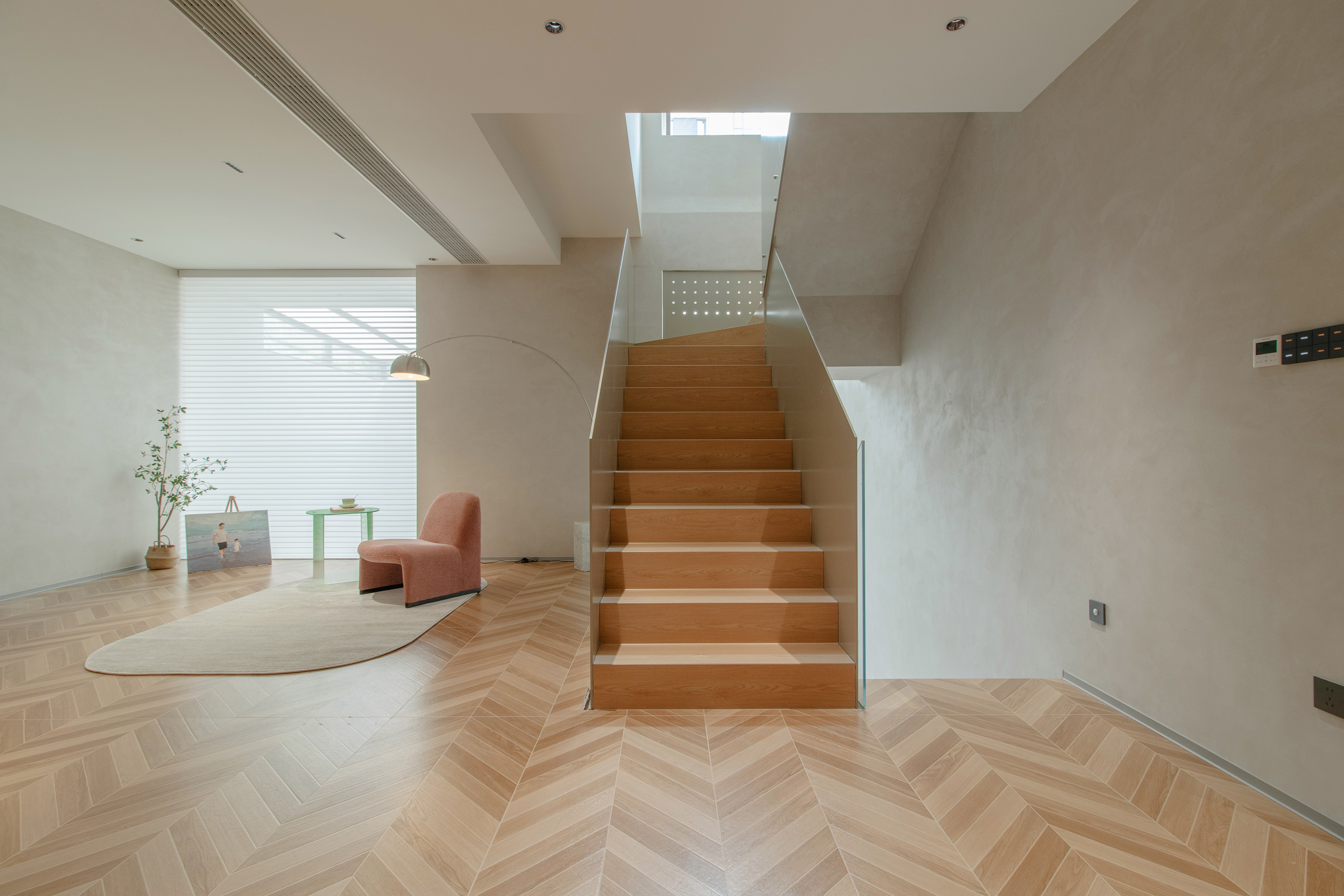 The space speaks in a minimalist language: warm off-white micro-cement walls, pale wood veneers, and matte concrete floors form a unified material palette that emphasizes raw texture and longevity. Over time, these surfaces naturally age, accumulating subtle traces of daily life. The seating area—defined by low-profile, modular furniture—carves out a social zone that is both intimate and open. The circular geometry of the coffee table engages in a visual dialogue with the staircase’s linear rhythm, enhancing spatial layering and tension.