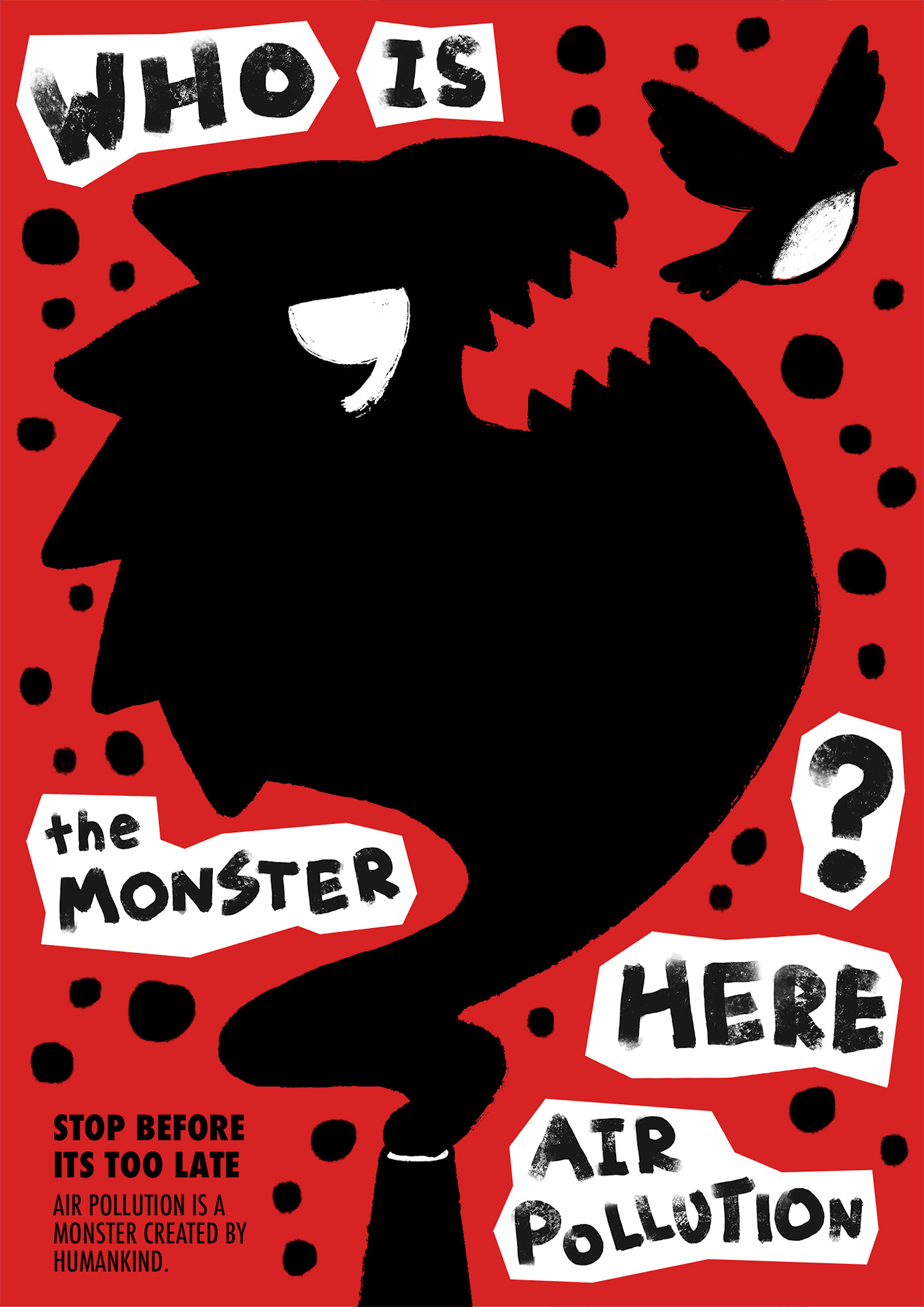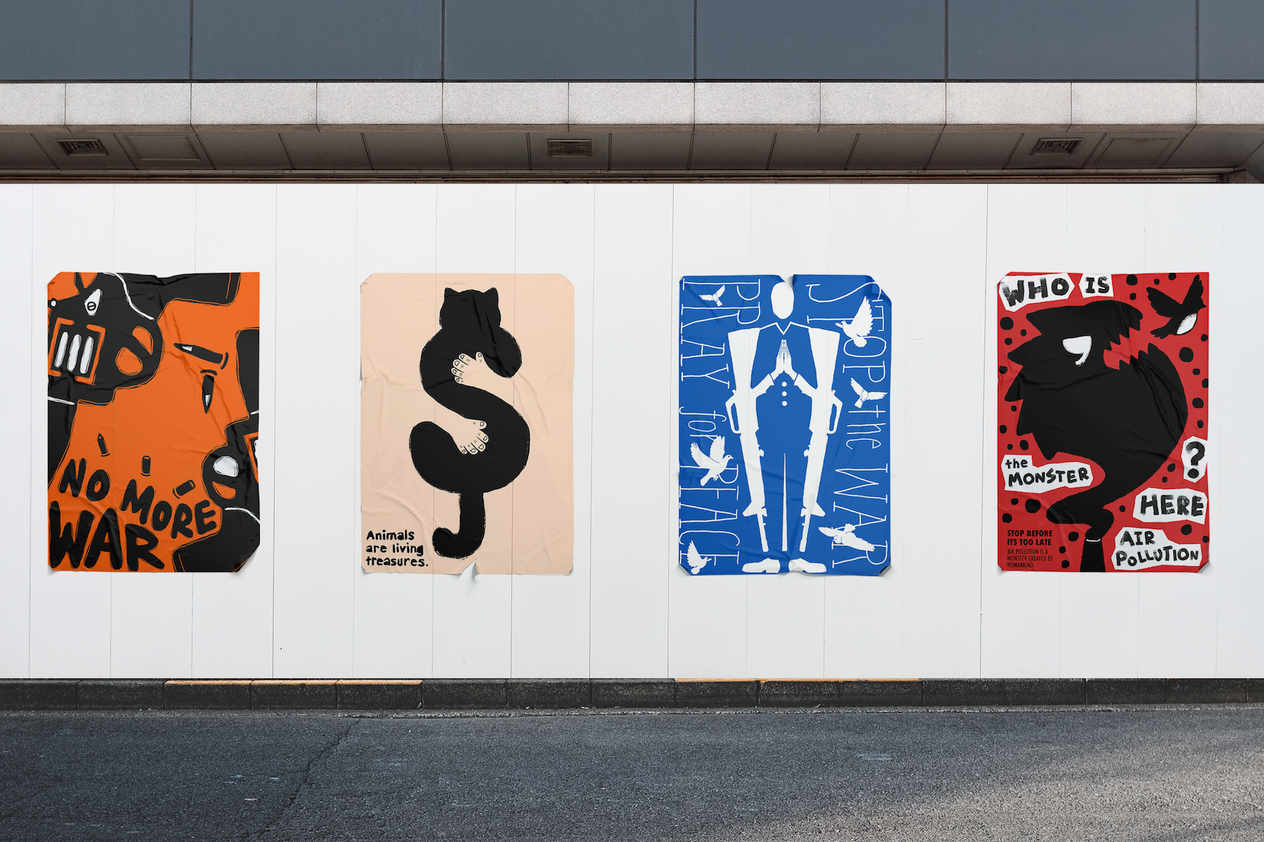 Voices of Responsibility is a hand-drawn poster series addressing animal protection, war, peace, and environmental pollution. Each poster uses bold silhouettes and visually direct imagery to communicate urgent issues. The posters turn metaphorical concepts into actionable visual messaging, understandable across cultures due to their simplicity and clarity.
