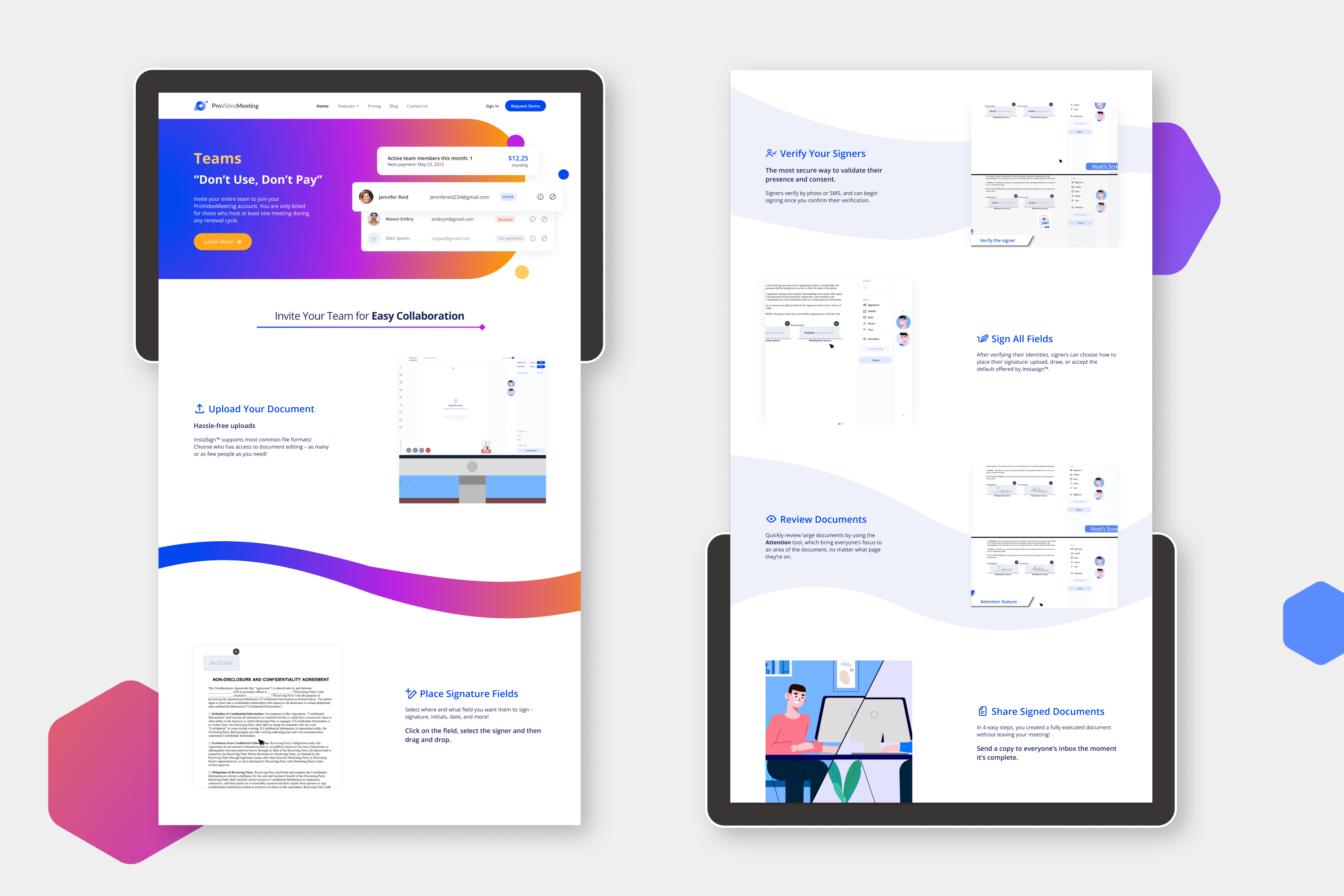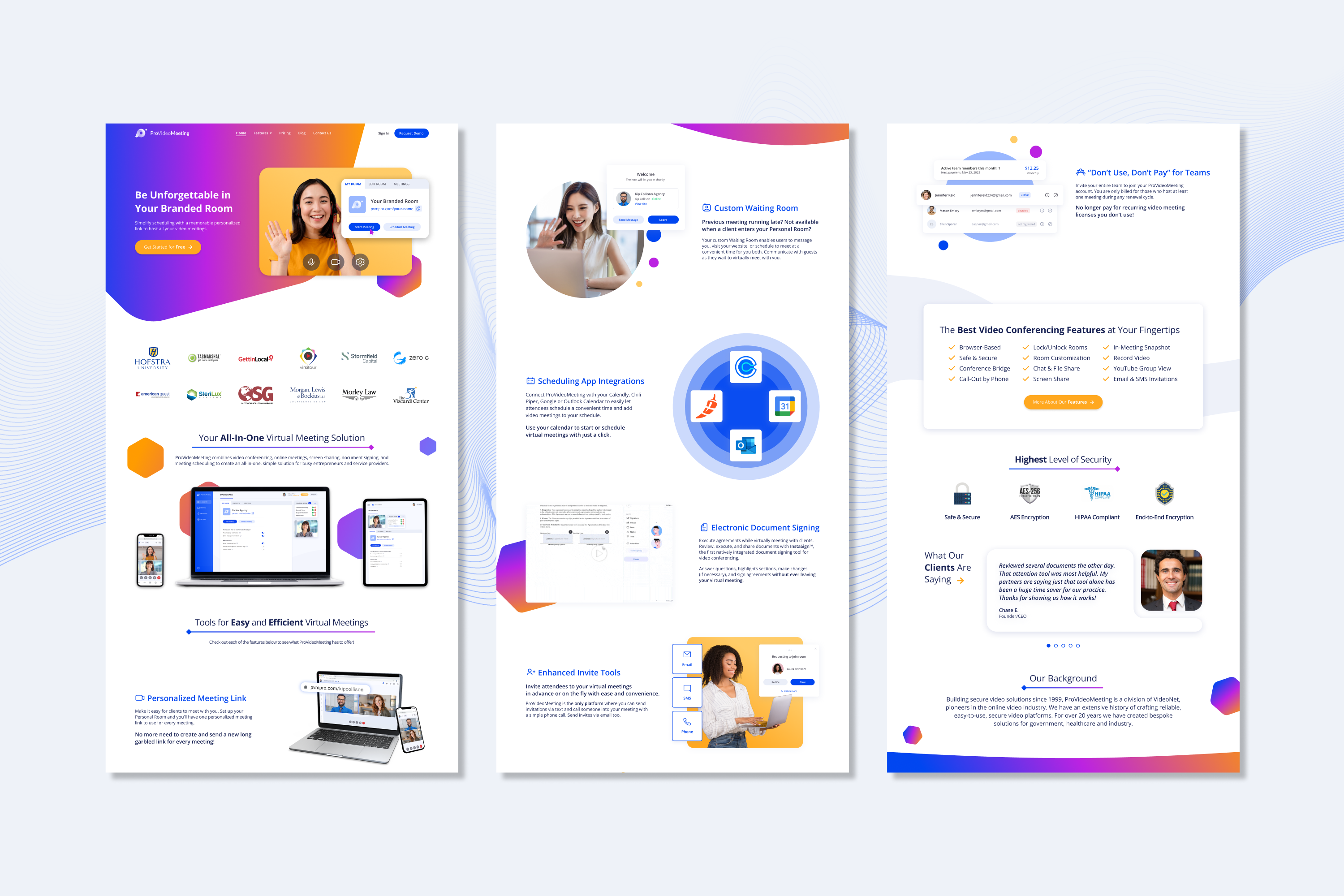 High-quality images from the platform itself are used extensively, allowing users to immediately visualize the experience and understand what to expect when using ProVideoMeeting. Key features such as personal meeting URLs, integrated scheduling, and in-browser document signing are highlighted clearly and intuitively, helping visitors imagine the platform as their own efficient workspace. The redesign strengthens the brand identity, communicates professionalism, and presents ProVideoMeeting as a polished, approachable, and engaging tool for virtual collaboration.