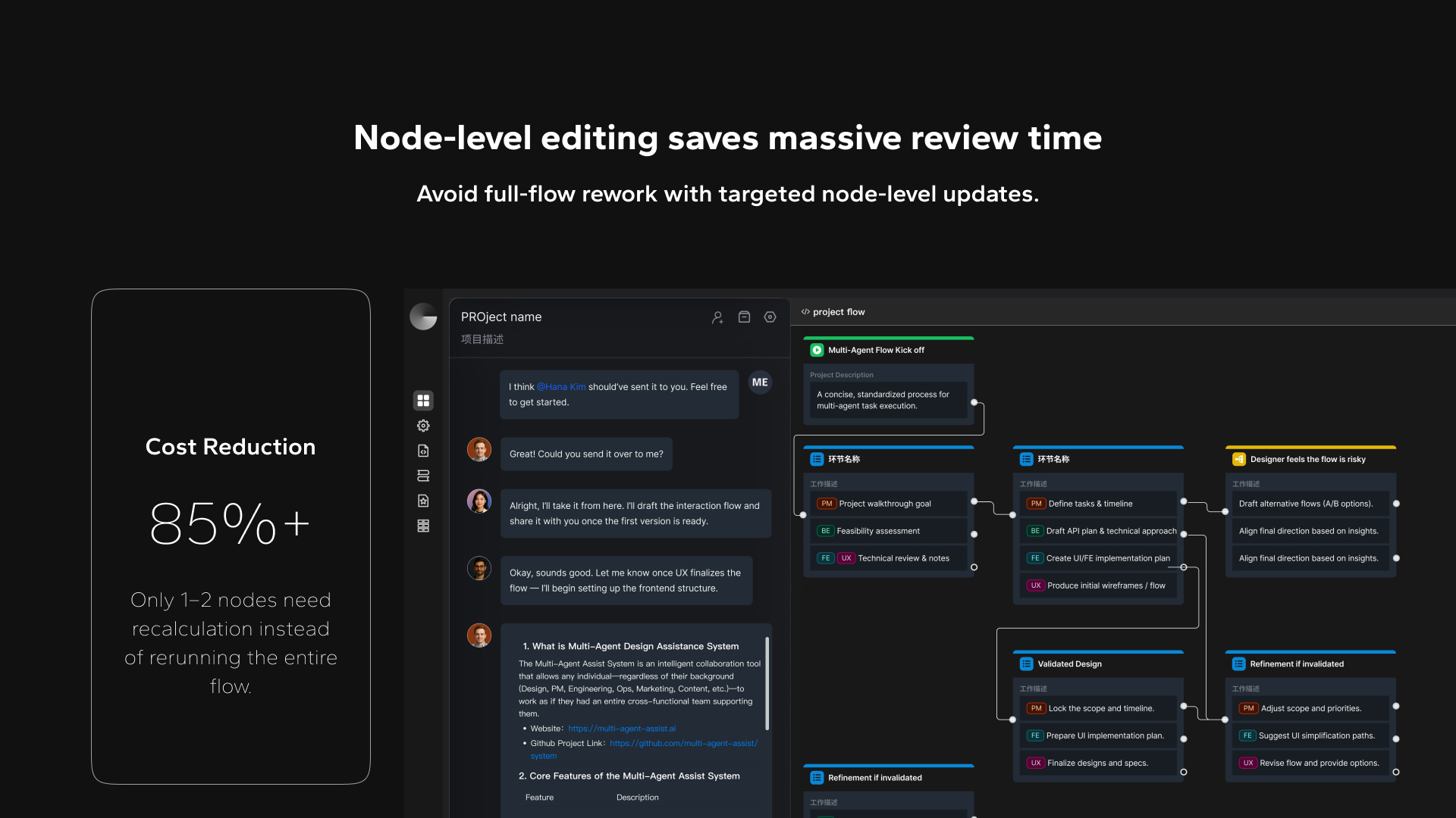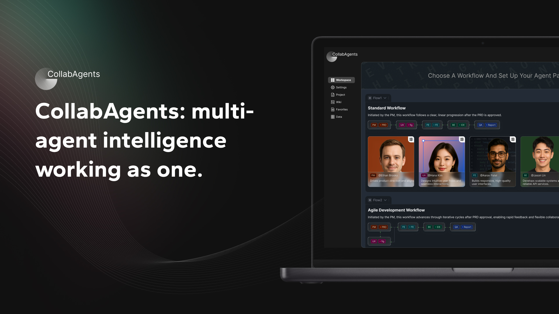 CollabAgents is a multi-agent collaboration system designed to simplify complex workflows by allowing people to intervene, adjust, and guide projects at the exact moment and node where decisions happen. Instead of rerunning an entire flow, users can edit a single step and have the system automatically update all downstream logic, reducing rework by more than 85%. Through role auto-completion, missing contributors such as PM, Design, or Engineering are instantly filled by specialized agents, ensuring that collaboration never stalls. Agents communicate through code-level exchanges, allowing decisions to be made quickly and precisely without the inefficiencies of human-language back-and-forth. By combining targeted intervention, intelligent automation, and seamless propagation, CollabAgents transforms how teams work—making complex decision-making faster, clearer, and dramatically more efficient.