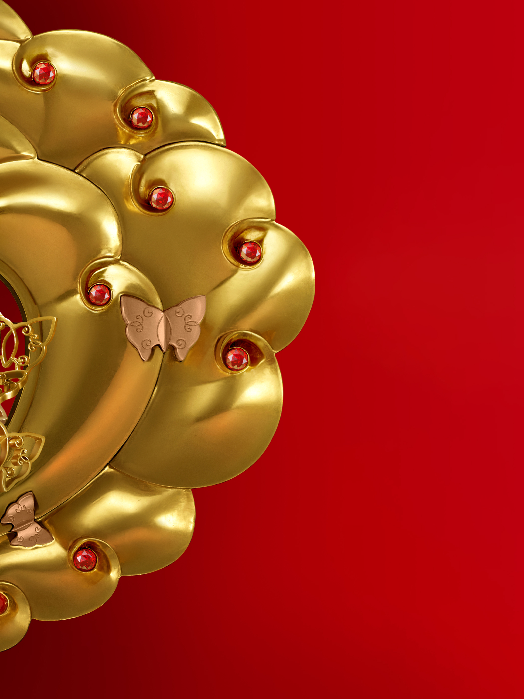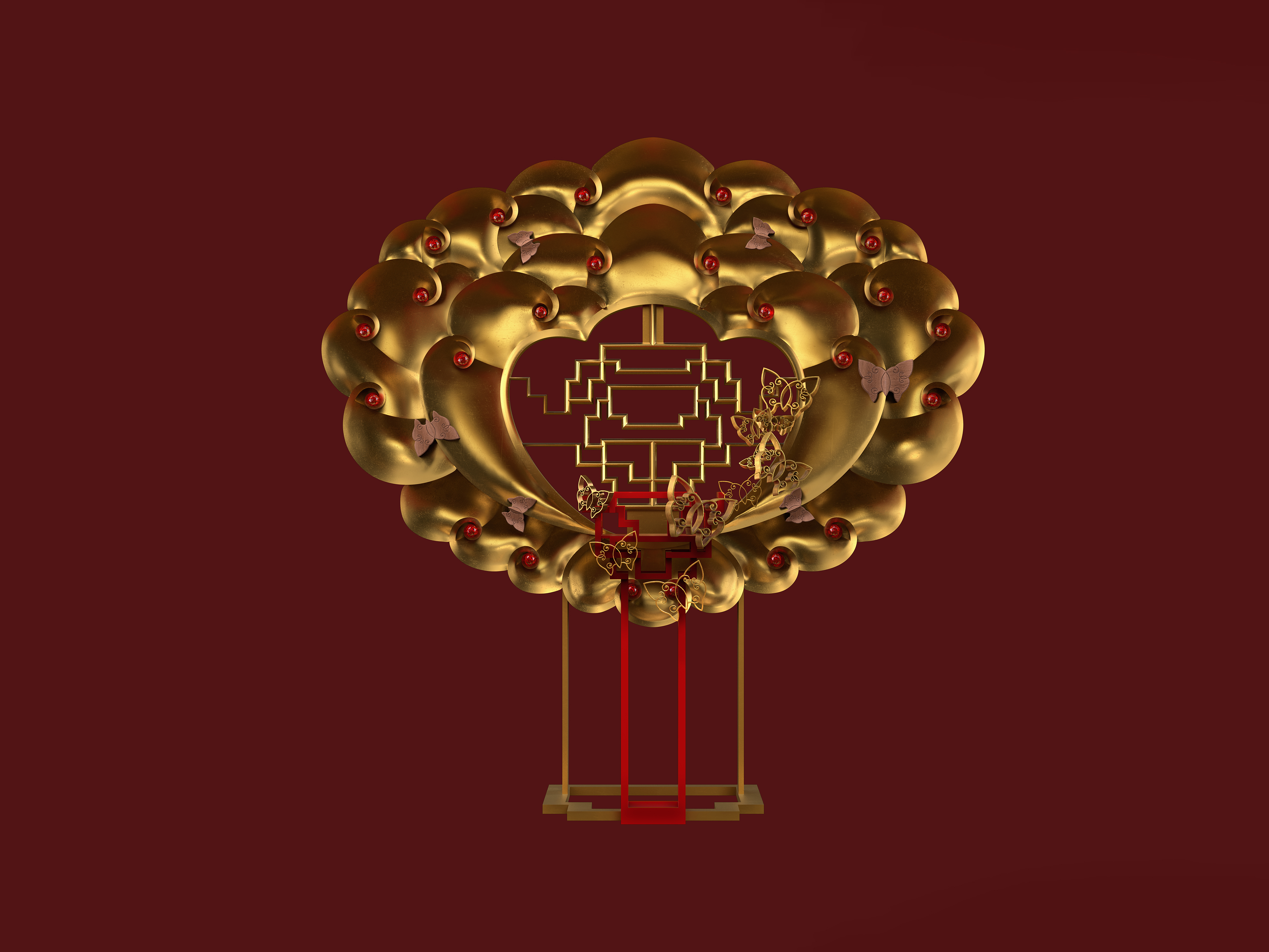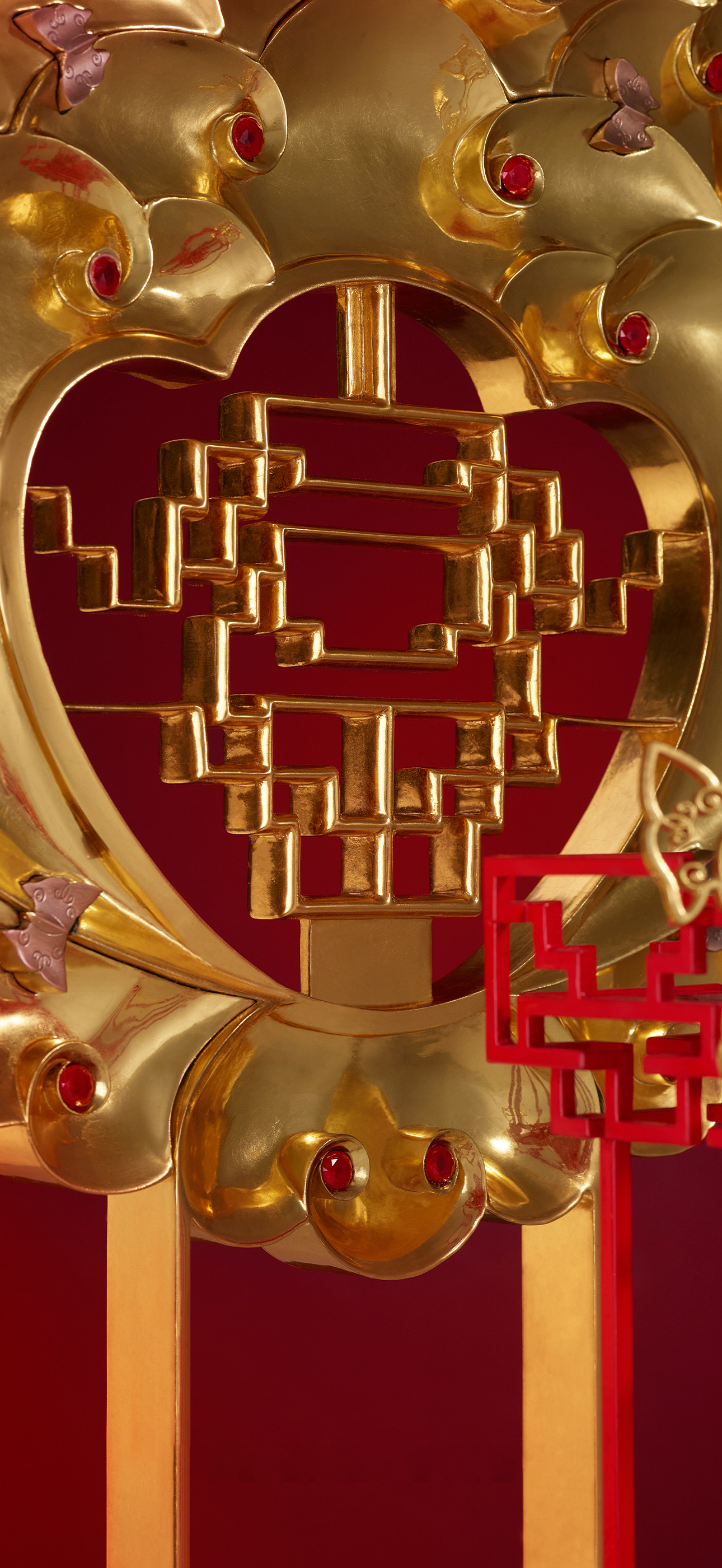 Centered around the peony—China’s national flower—the artwork features petals that layer and taper gently inward, radiating elegance and dignified beauty. Each petal is meticulously joined using rosewood butterfly tenons, honoring time-honored woodcraft ingenuity. The delicate, curling tips of the petals are set with gleaming rubies, evoking the warm glow of traditional festive lanterns that illuminate Chinese New Year celebrations. The overall composition symbolizes not only family reunion and harmony but also honors the wisdom and exquisite artistry of traditional Chinese craftsmanship. At the heart of the bloom lies an artistically reimagined Chinese character for “prosperity,” inspired by classical window lattice patterns—an elegant and culturally resonant detail that reinforces the theme of “Prosperity and Flowering.”