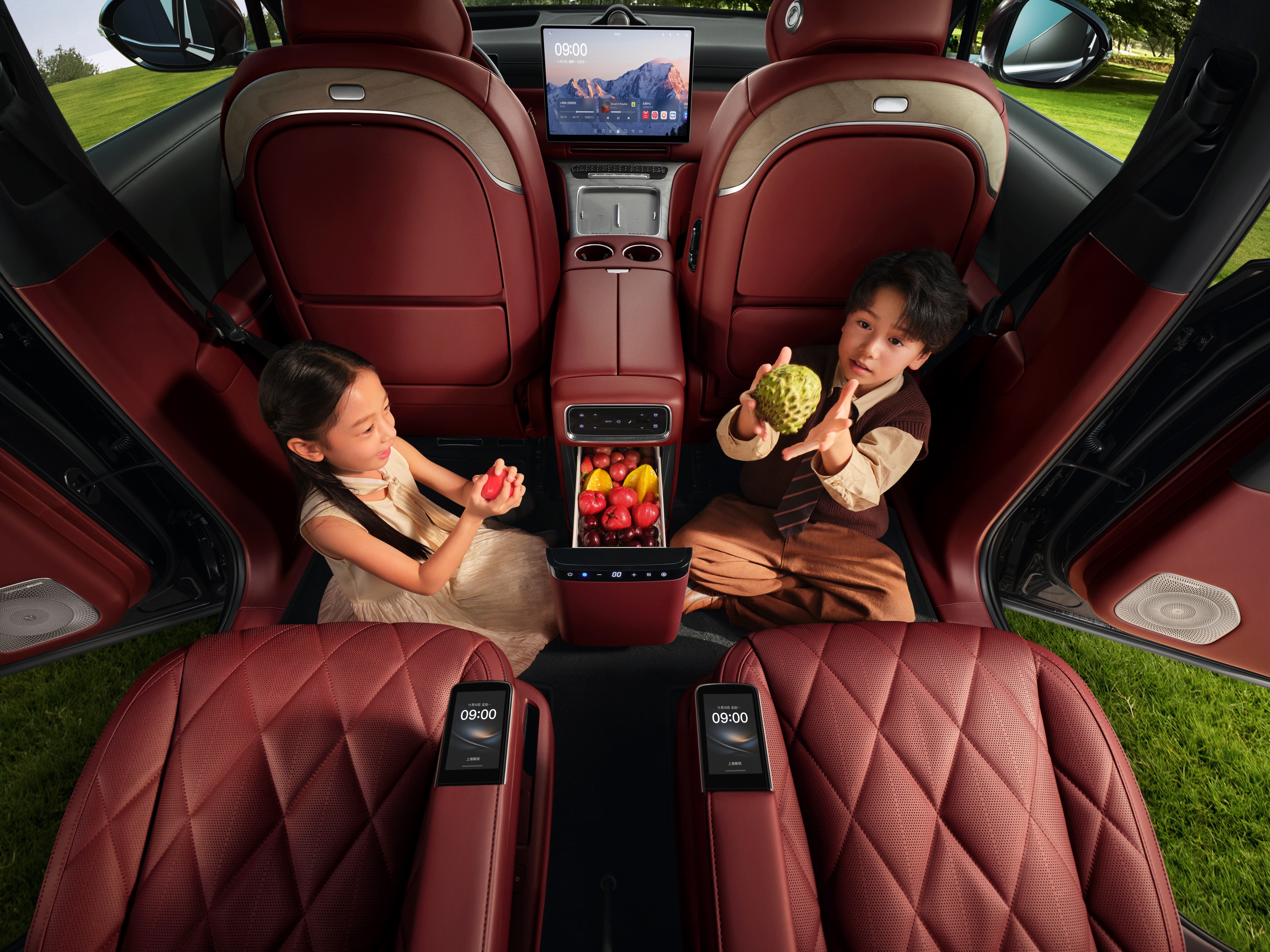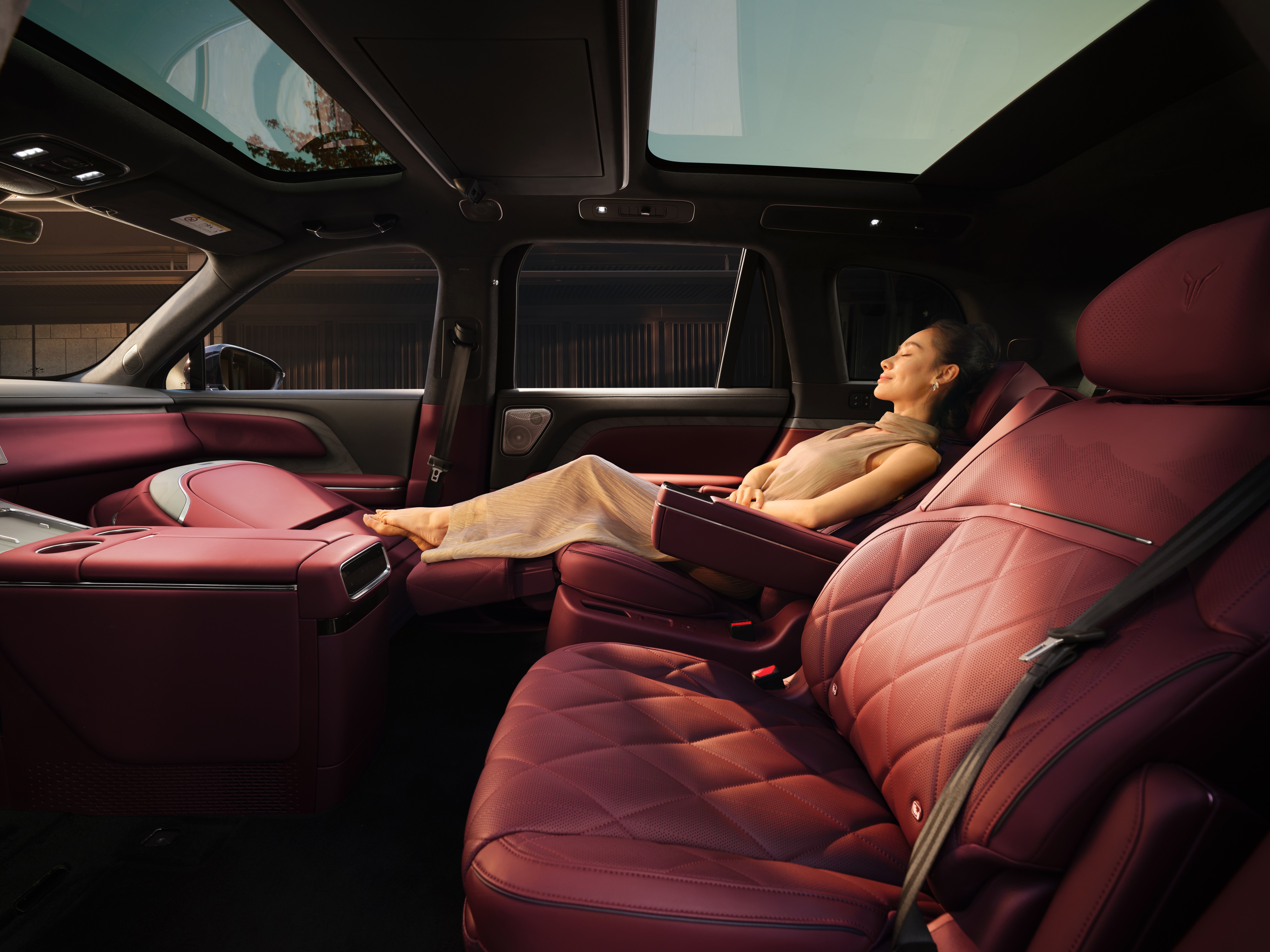 The second row is furnished with zero-gravity massage seats, complemented by a 21.4-inch ceiling-mounted screen and a built-in refrigerator, enhancing the comfort and luxury of the onboard experience.