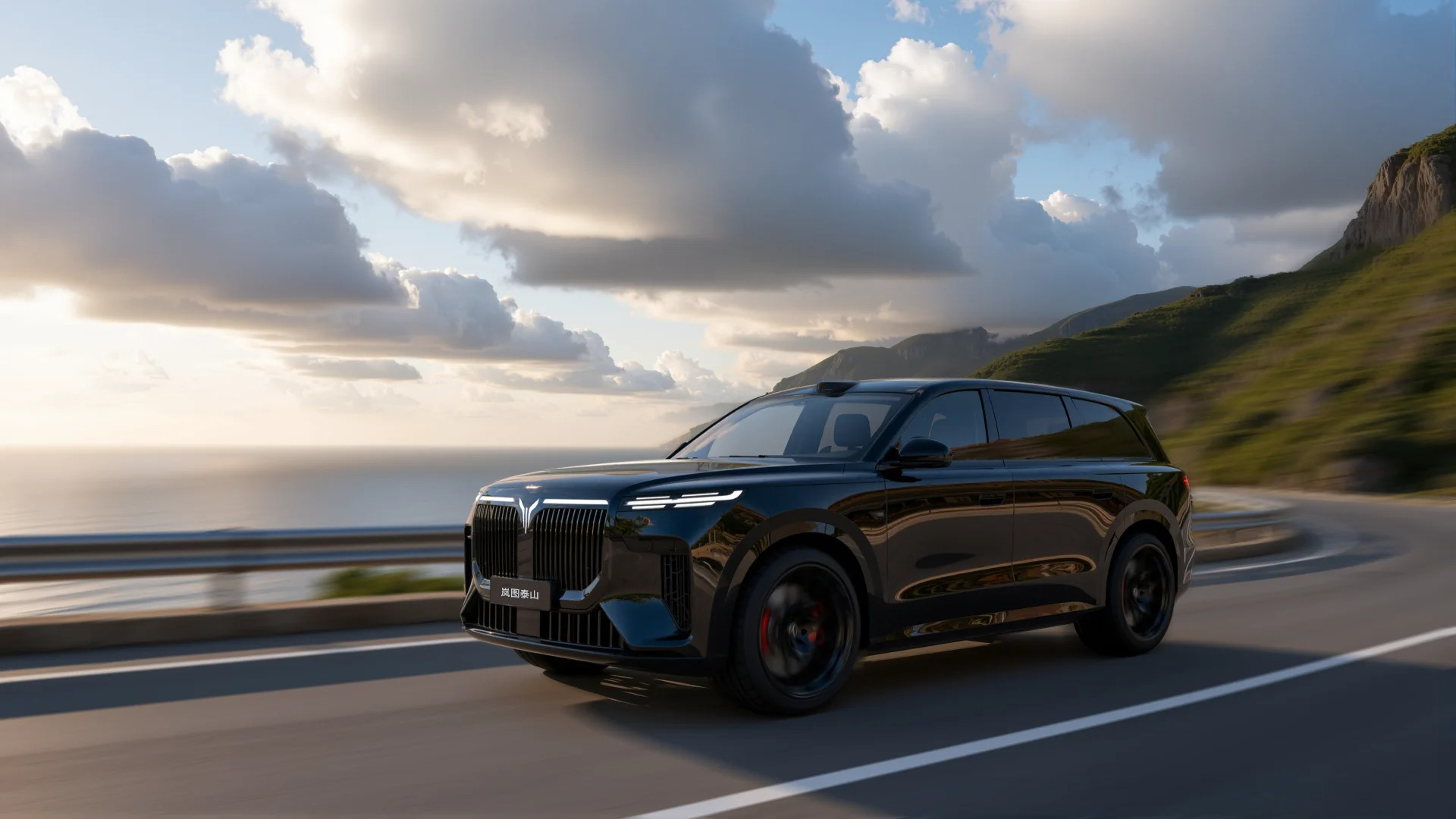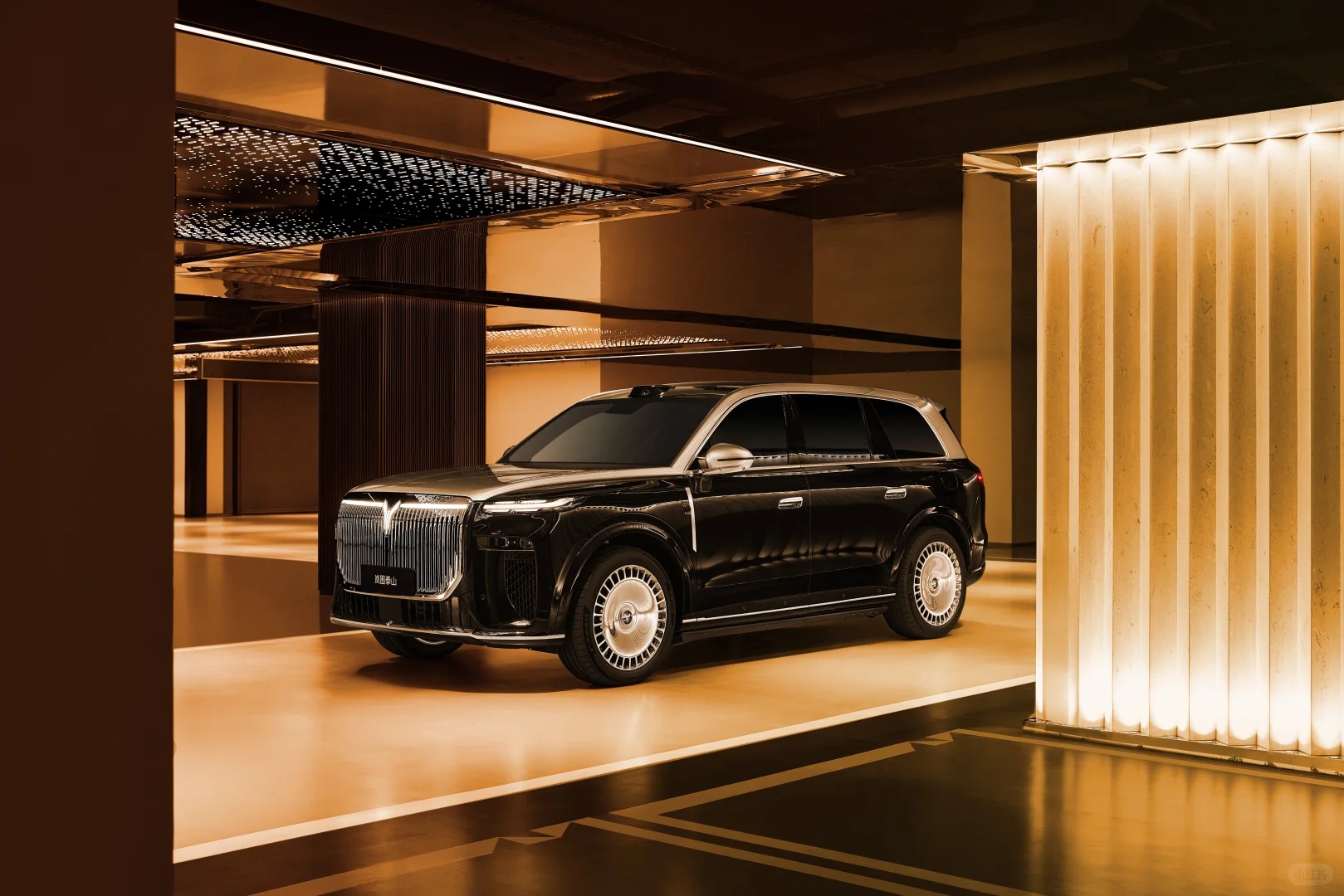 The VOYAH Tai Shan is a six-seat large plug-in hybrid SUV positioned as the flagship model. With a length of 5,230 mm and a height of 1,817 mm, it commands a substantial presence and offers a spacious interior. A width-to-height ratio of 1.114 and a 59.68% front-nose proportion work properly to create a powerful and imposing visual impact. The front face is a continuation of the family design. The illuminated logo, integrated with LED light strips and daytime running lights, forms a semi-full-width light signature, achieving visual cohesion and high recognizability.