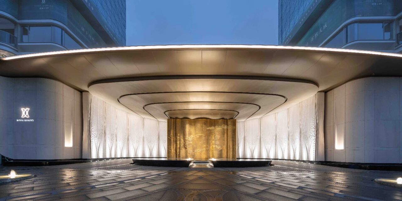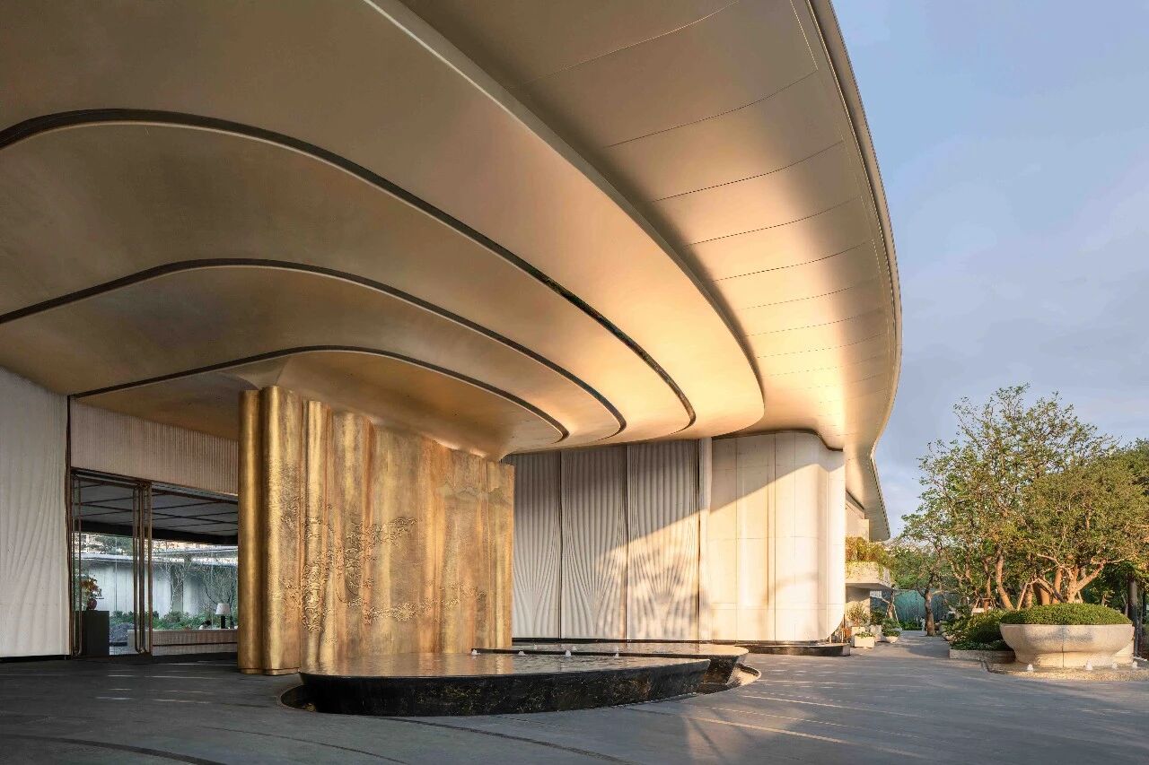 The main entrance is inspired by Ma Yuan's "Twelve Waters" painting from the Southern Song Dynasty. It combines Zhu Bingren's bronze carving intangible cultural heritage skills with modern hyperbolic shapes, creating a gateway to the fusion of Eastern aesthetics and modern craftsmanship in time and space.