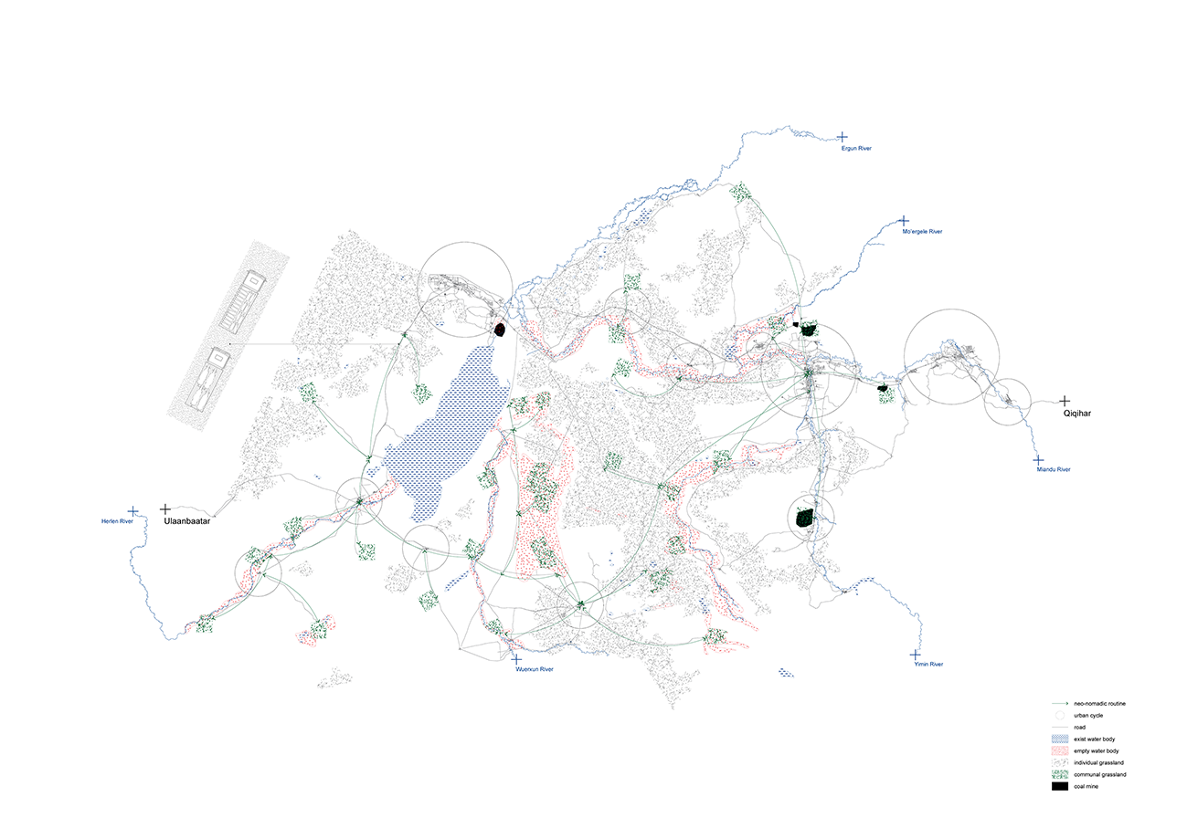 The project operates through three critical interventions that challenge existing spatial paradigms: policy reformation that reconceptualizes land tenure beyond private ownership models; temporal restructuring that reintroduces cyclical occupation patterns; and architectural frameworks that support transient collective inhabitation. Through these intersecting strategies, the proposal seeks to dissolve the territorial fixity that has rendered grasslands vulnerable to industrial extraction and ecological exhaustion.