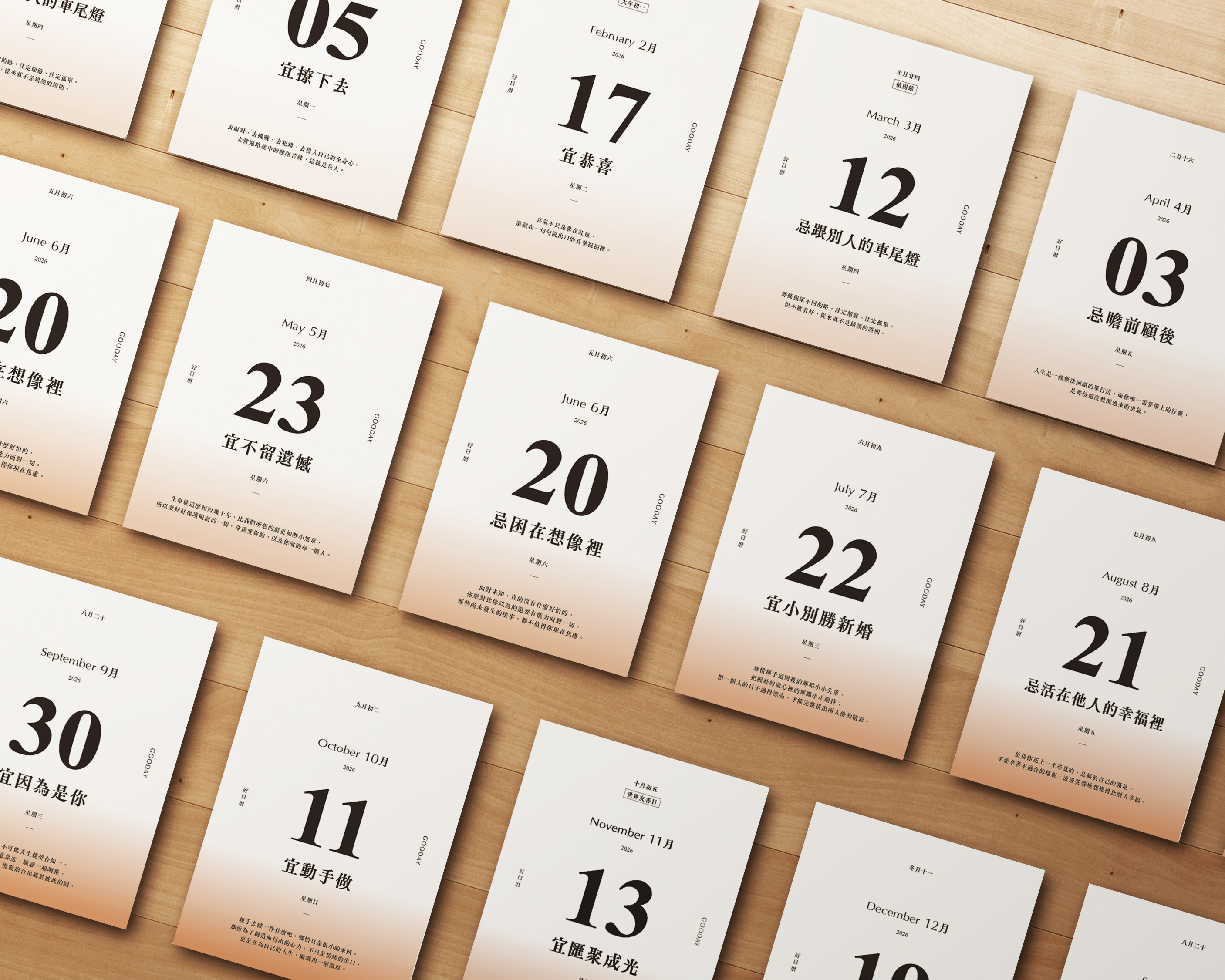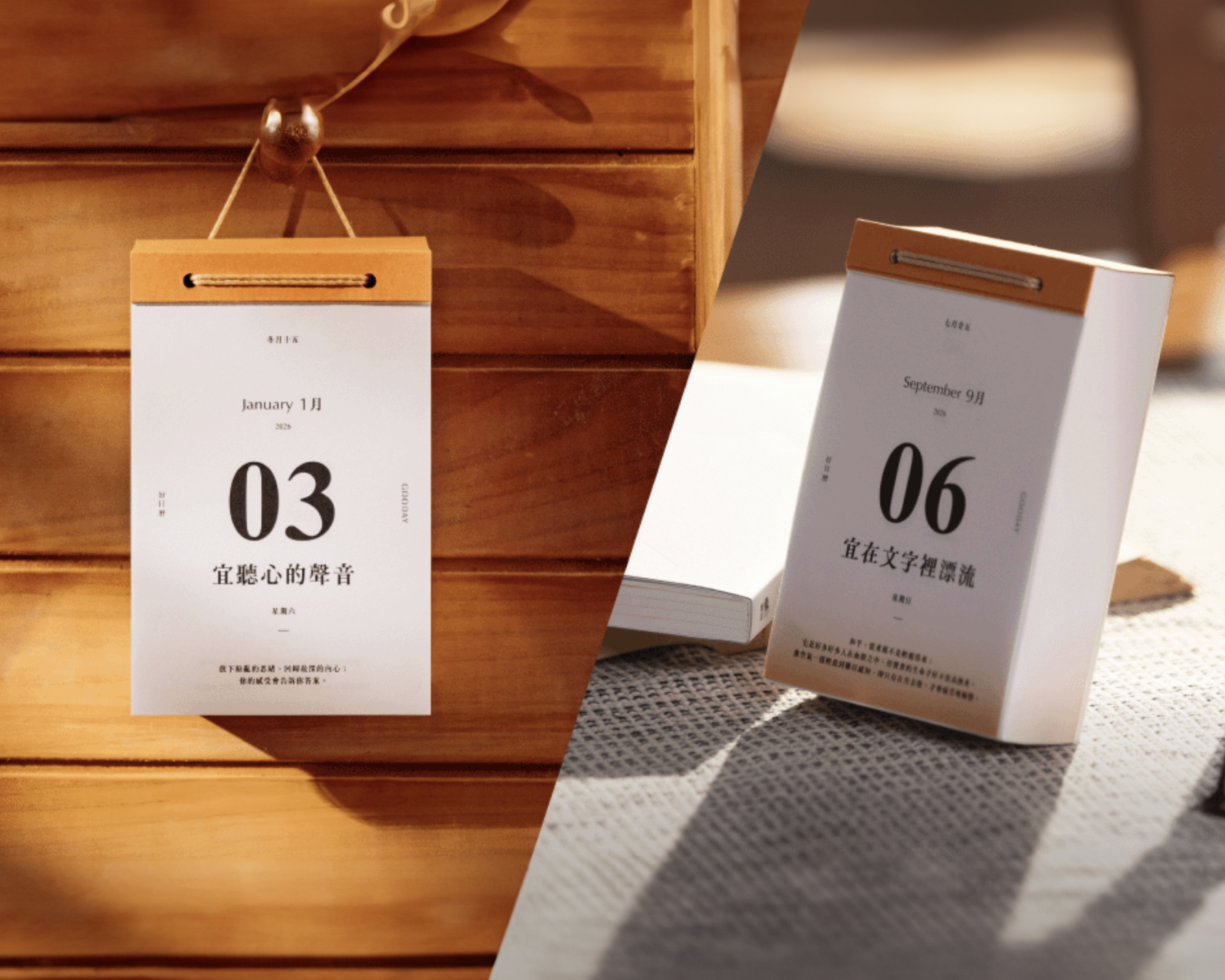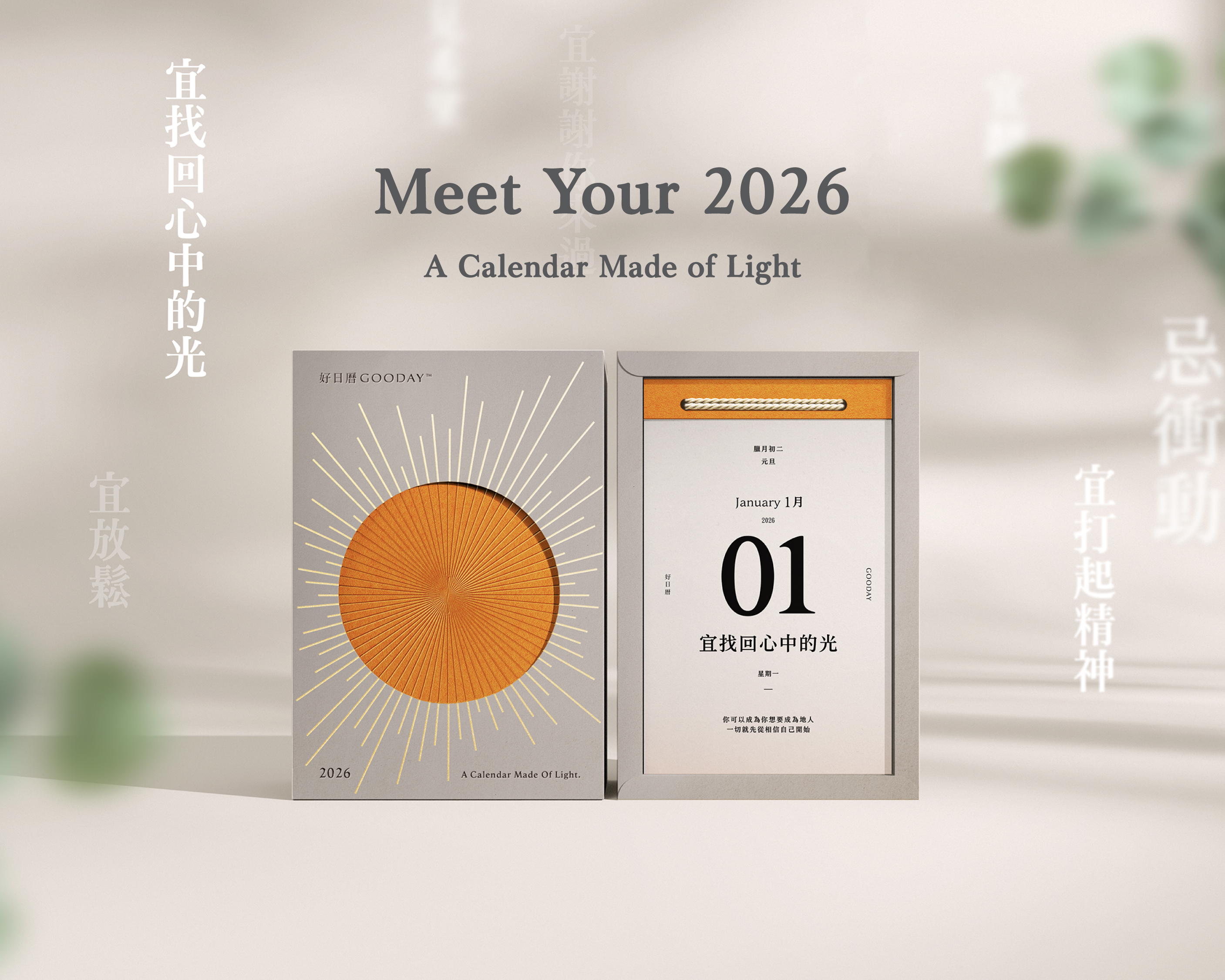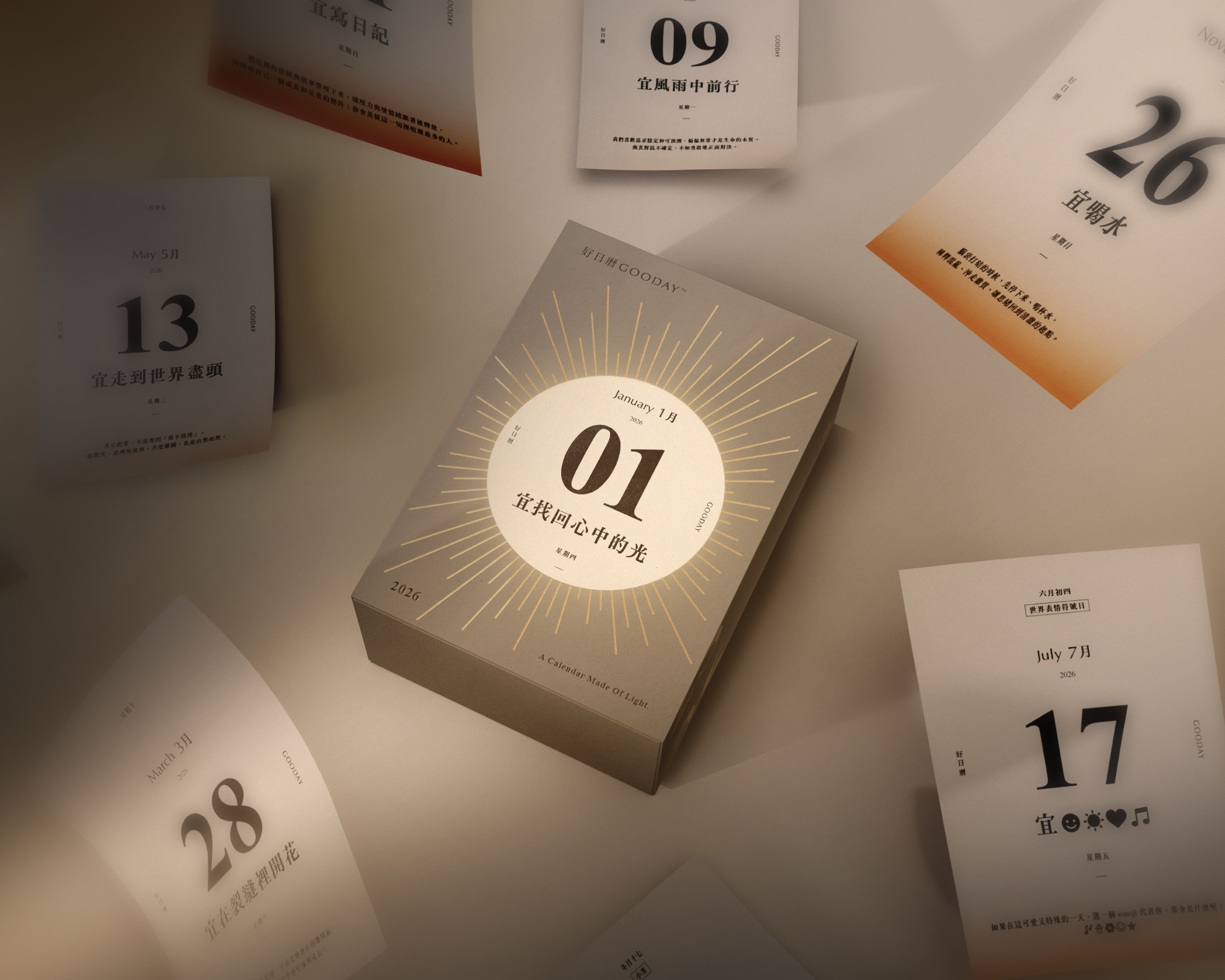 GOODAY believes that light is everywhere—in the rhythms of daily life, in moments of growth, and in every page we choose to turn. Through thoughtful materials, multifunctional design, and subtle emotional cues, this calendar aims to illuminate not only each day of 2026, but also the inner light found within every user.