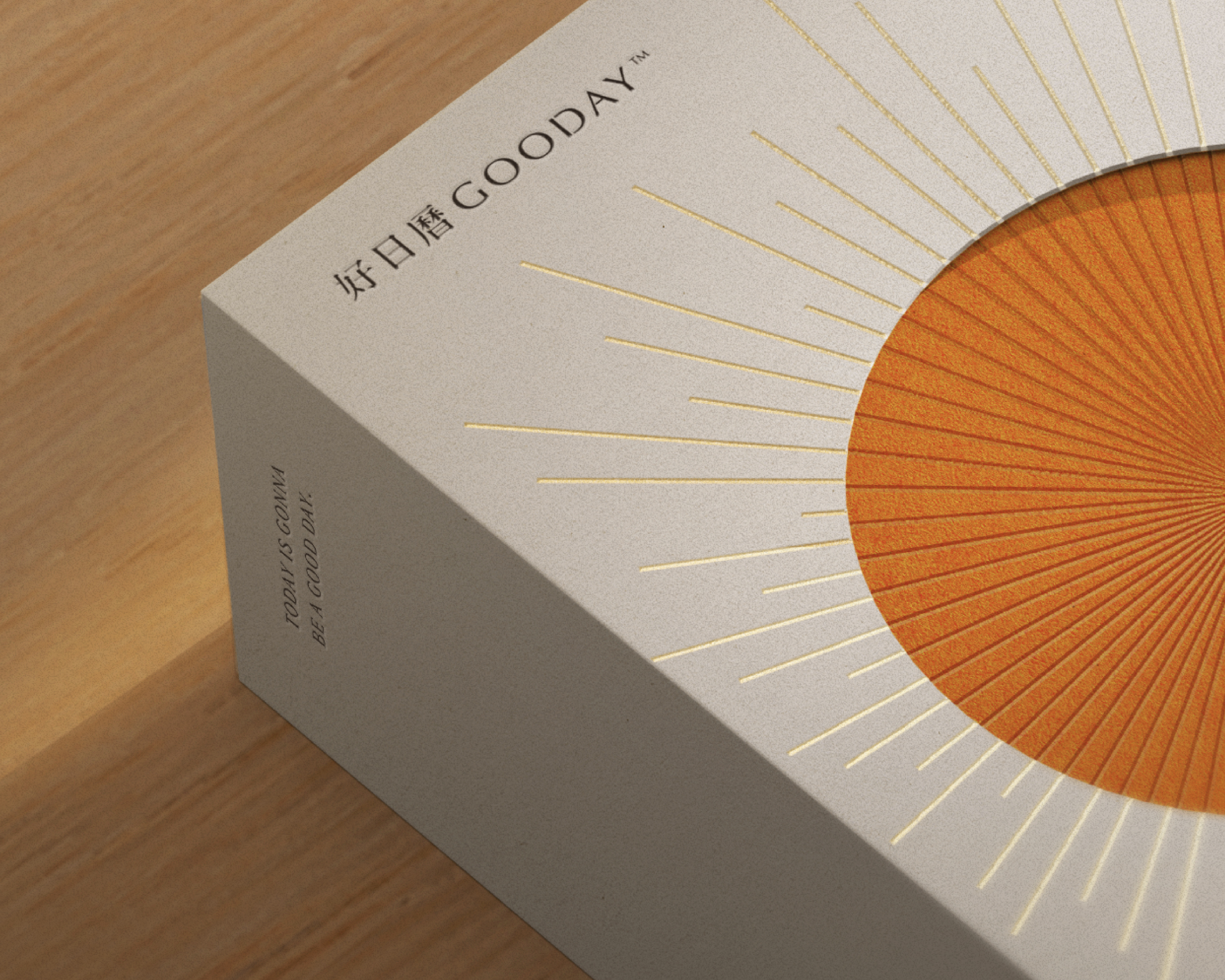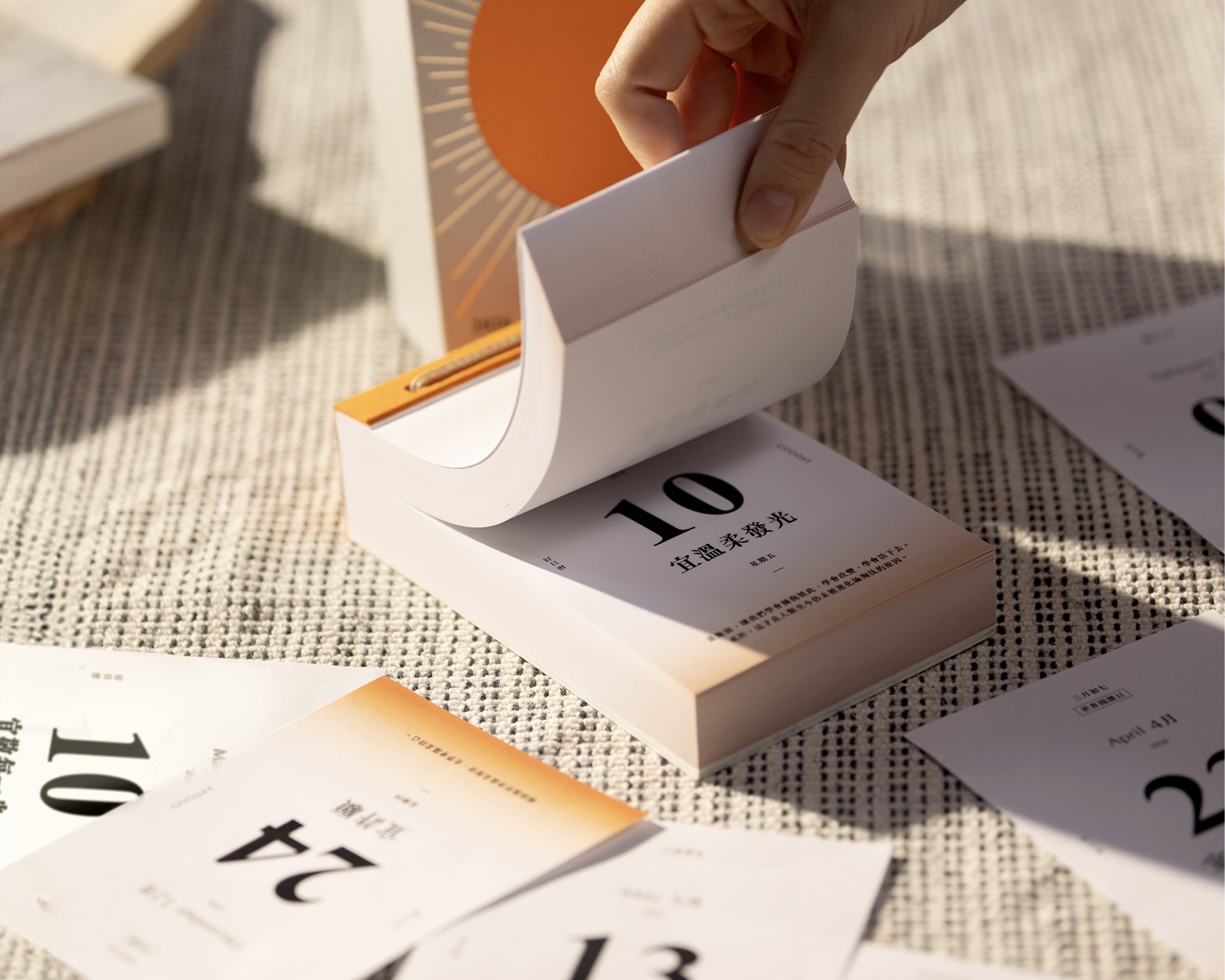 The outer box is made from recycled green-energy paper and finished with matte gold foil stamping, creating a soft, luminous texture. The calendar’s 365 sheets are printed with a custom orange ink, forming a subtle gradient on the edge that resembles a rising sun. As users flip through each page, this gradient serves as a visual trace of time—symbolizing growth, renewal, and the gentle momentum of daily living.